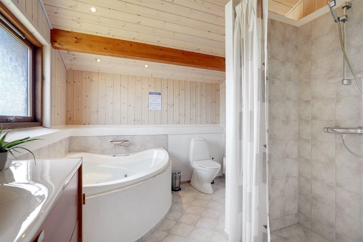 Der er 2 badeværelser med bruseniche og 2 toiletter. Der er gulvvarme på 2 badeværelser. I saunaen er der mulighed for afslapning.