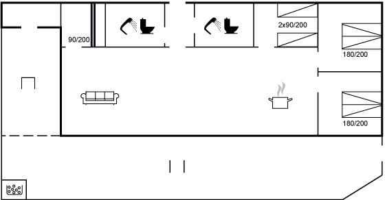 Der er i alt 4 soveværelser. Sovepladserne fordeler sig på: 4 sovepladser i dobbeltsenge. 2 sovepladser i enkeltsenge. 2 sovepladser i køjeseng. Derudover er der 1 stk. barneseng.