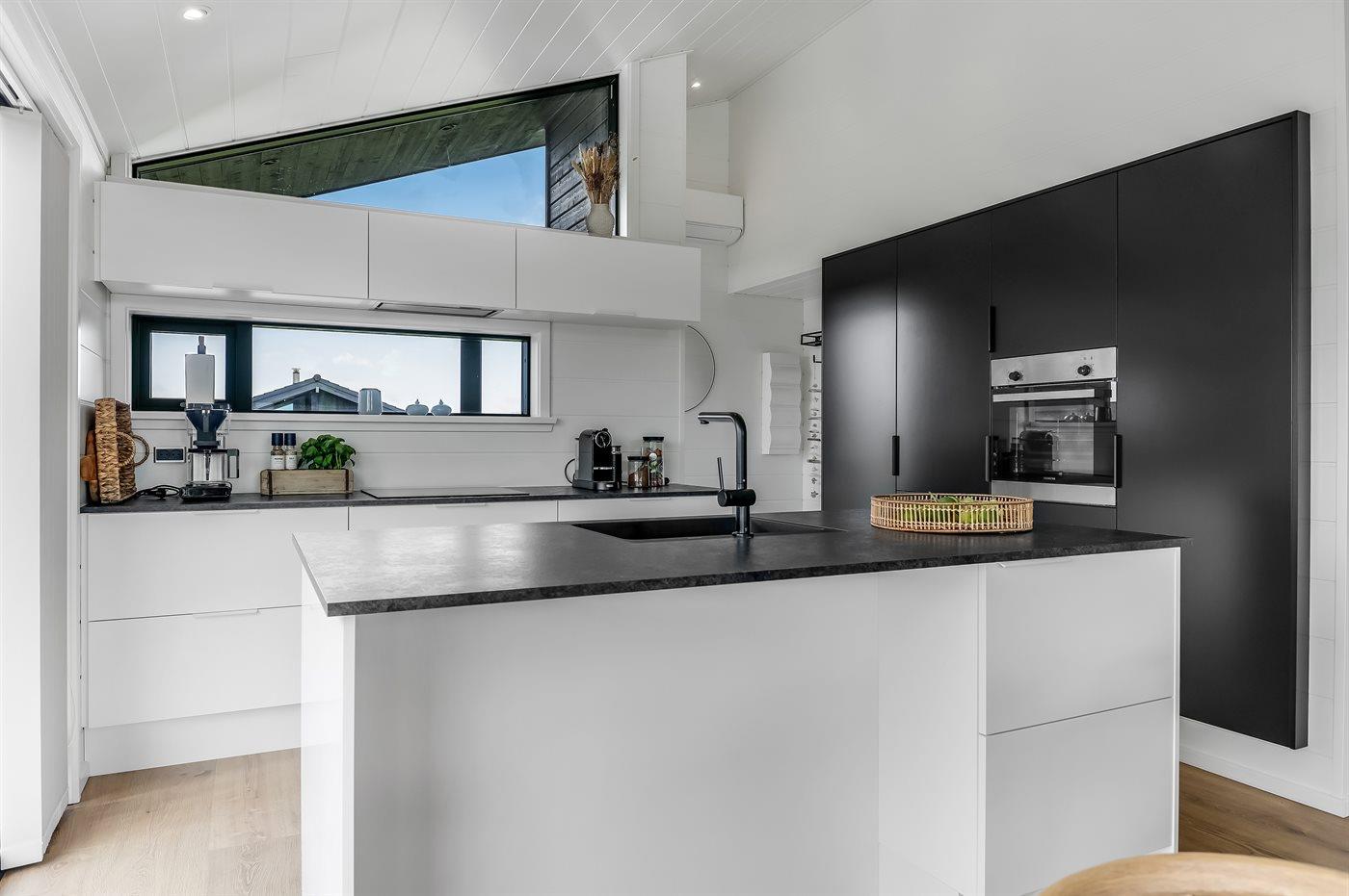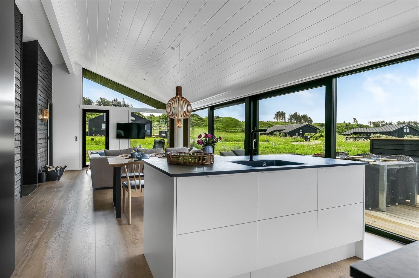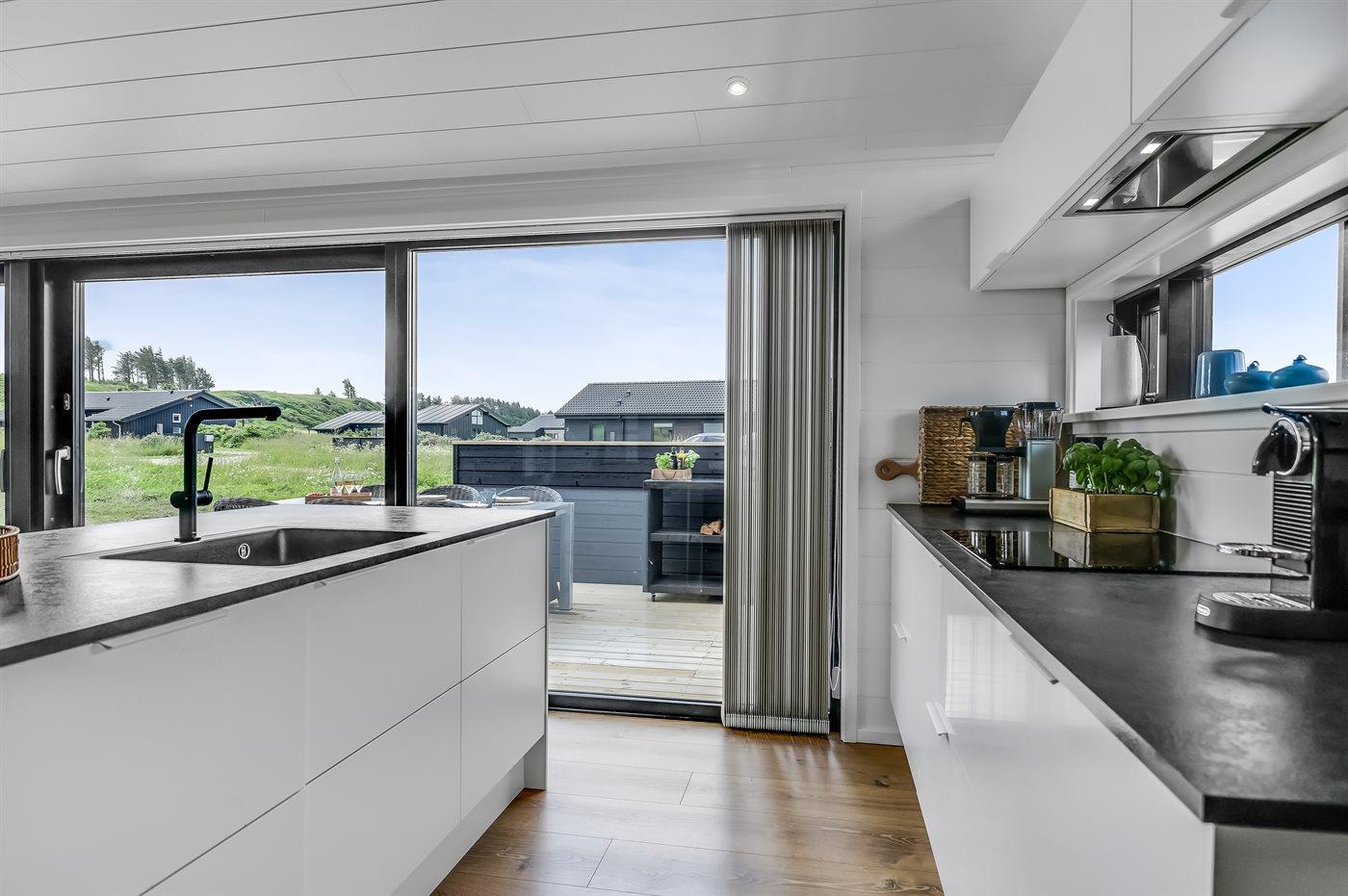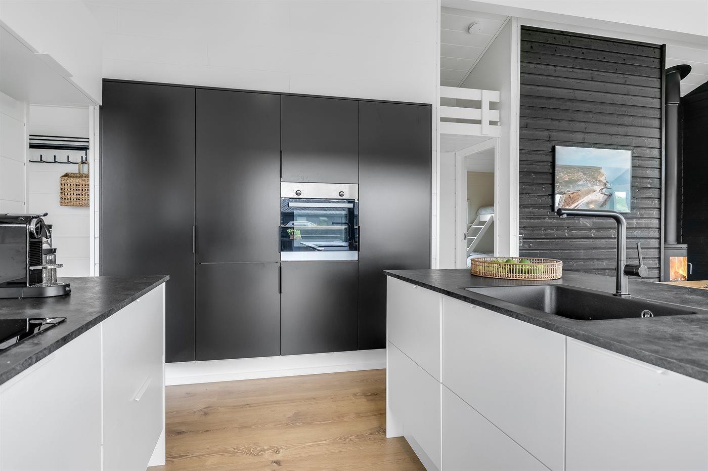 Køkkenet er udstyret med 1 køleskab. Der er 4 induktionskogeplader, varmluftovn samt opvaskemaskine.