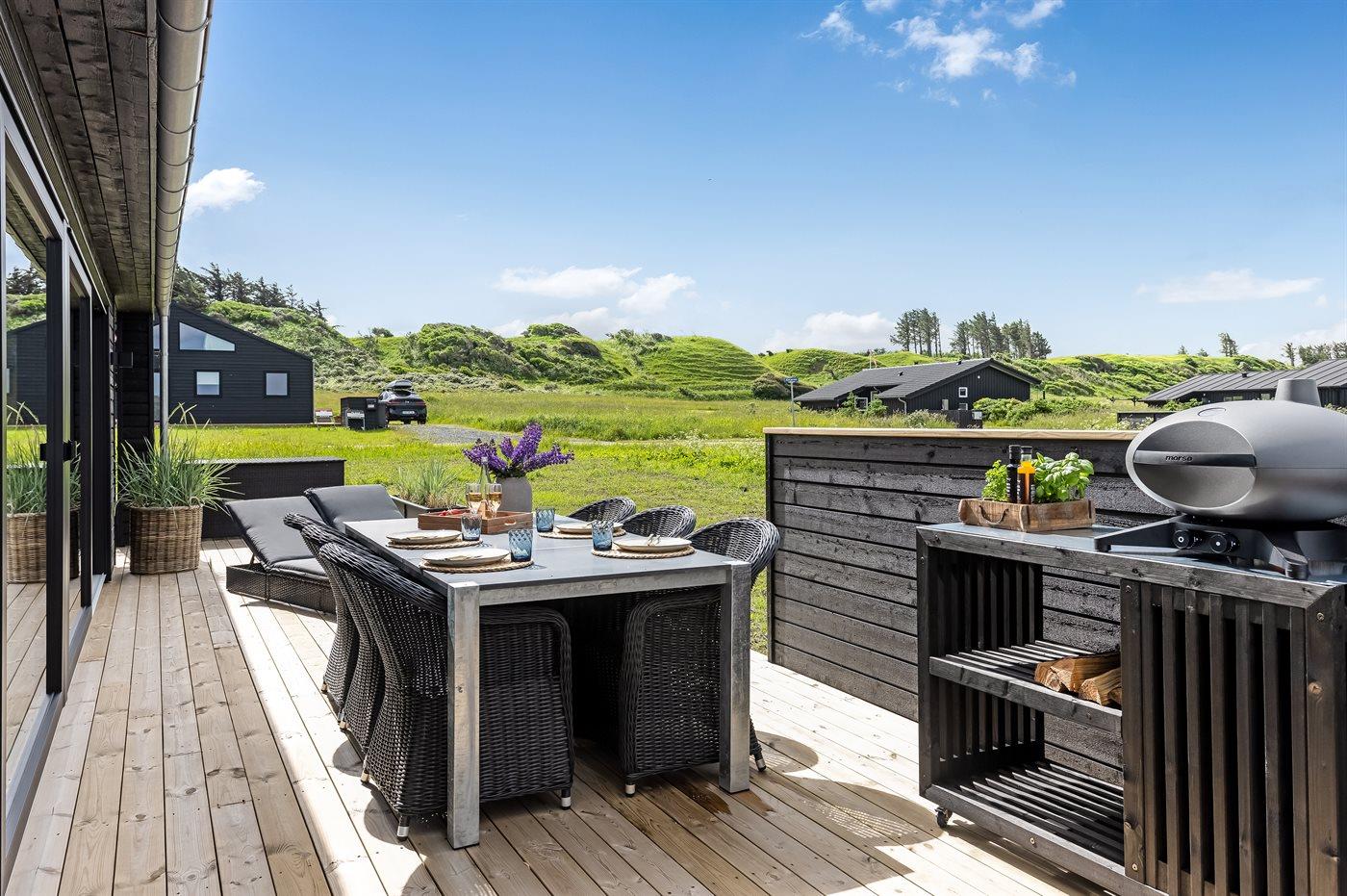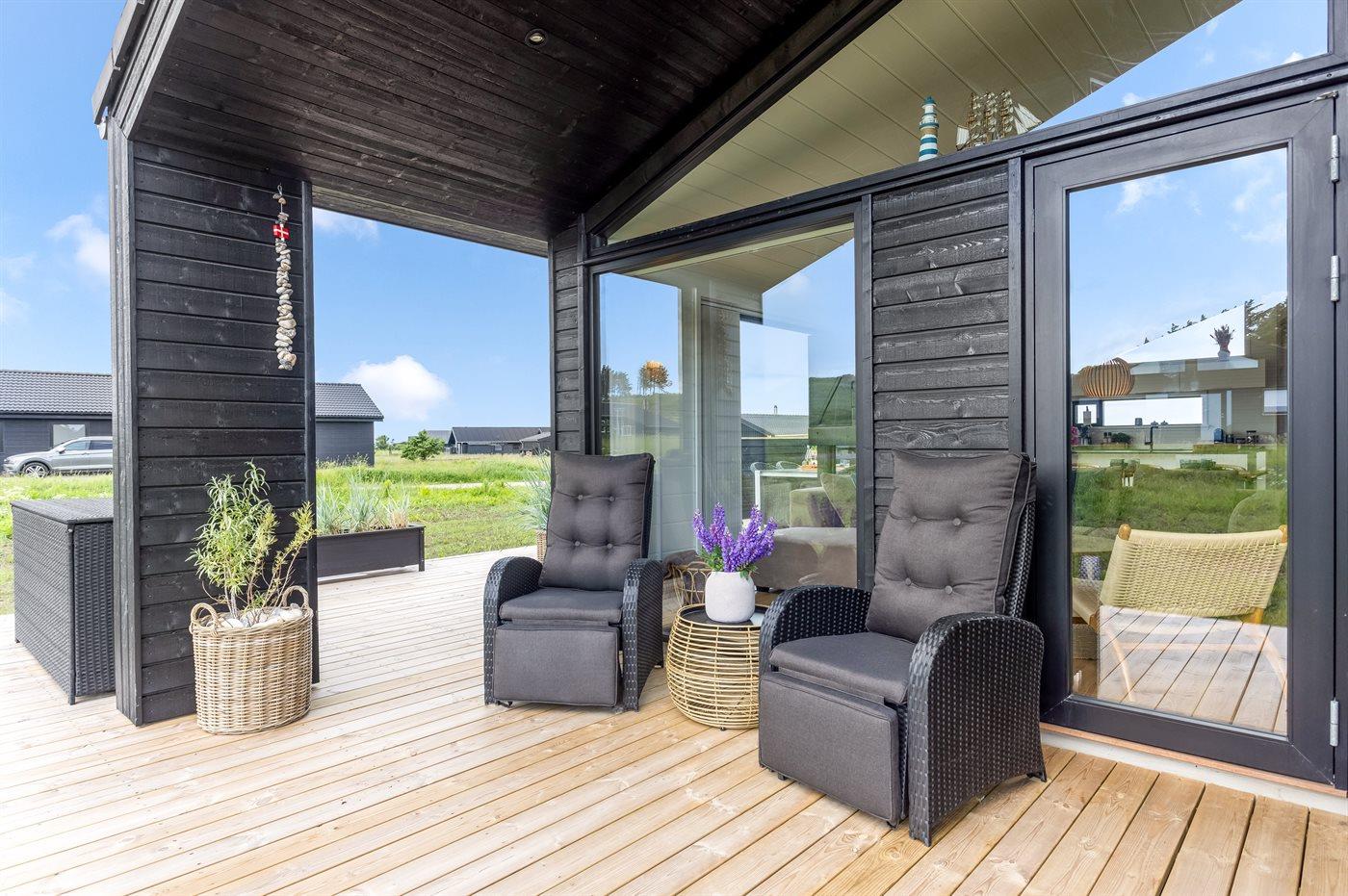 Ferieboligen er beliggende på en 1402 m² stor naturgrund. Der er 400 m til havet. Nærmeste forretning er beliggende i en afstand af 1500 m. Til ferieboligen hører åbent terrasseareal. Desuden er der overdækket terrasse. Grill til rådighed. Der er installeret stik til opladning af elbil. Parkering ved ferieboligen.