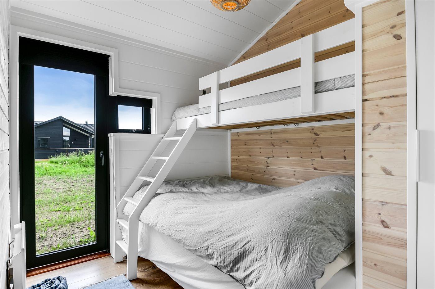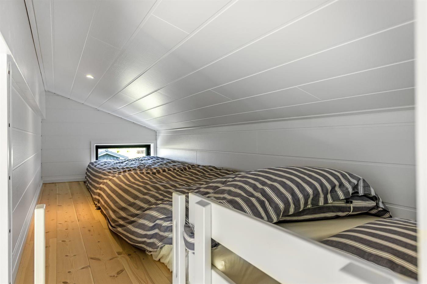 Der er i alt 3 soveværelser. Sovepladserne fordeler sig på: 6 sovepladser i dobbeltsenge.1 soveplads i køjeseng. 2 sovepladser på madrasser. 2 af disse sovepladser befinder sig på husets hems. Derudover er der 1 stk. barneseng.