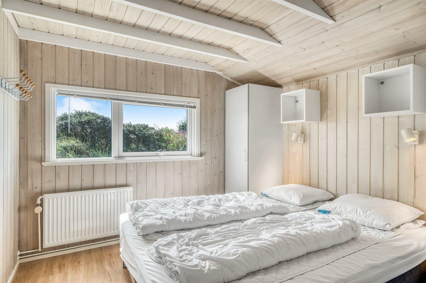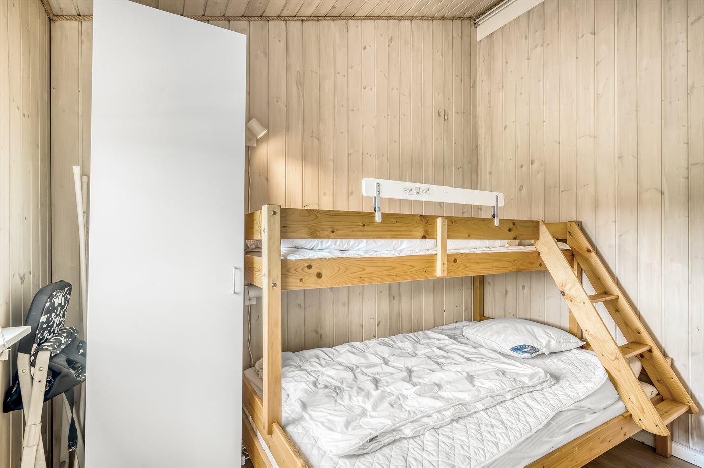 Der er i alt 4 soveværelser. Sovepladserne fordeler sig på: 4 sovepladser i dobbeltsenge. 2 sovepladser i køjeseng. 2 sovepladser i sovesofa (dobbelt). 2 sovepladser på madrasser. 2 af disse sovepladser befinder sig på husets hems. Derudover er der 1 stk. barneseng.