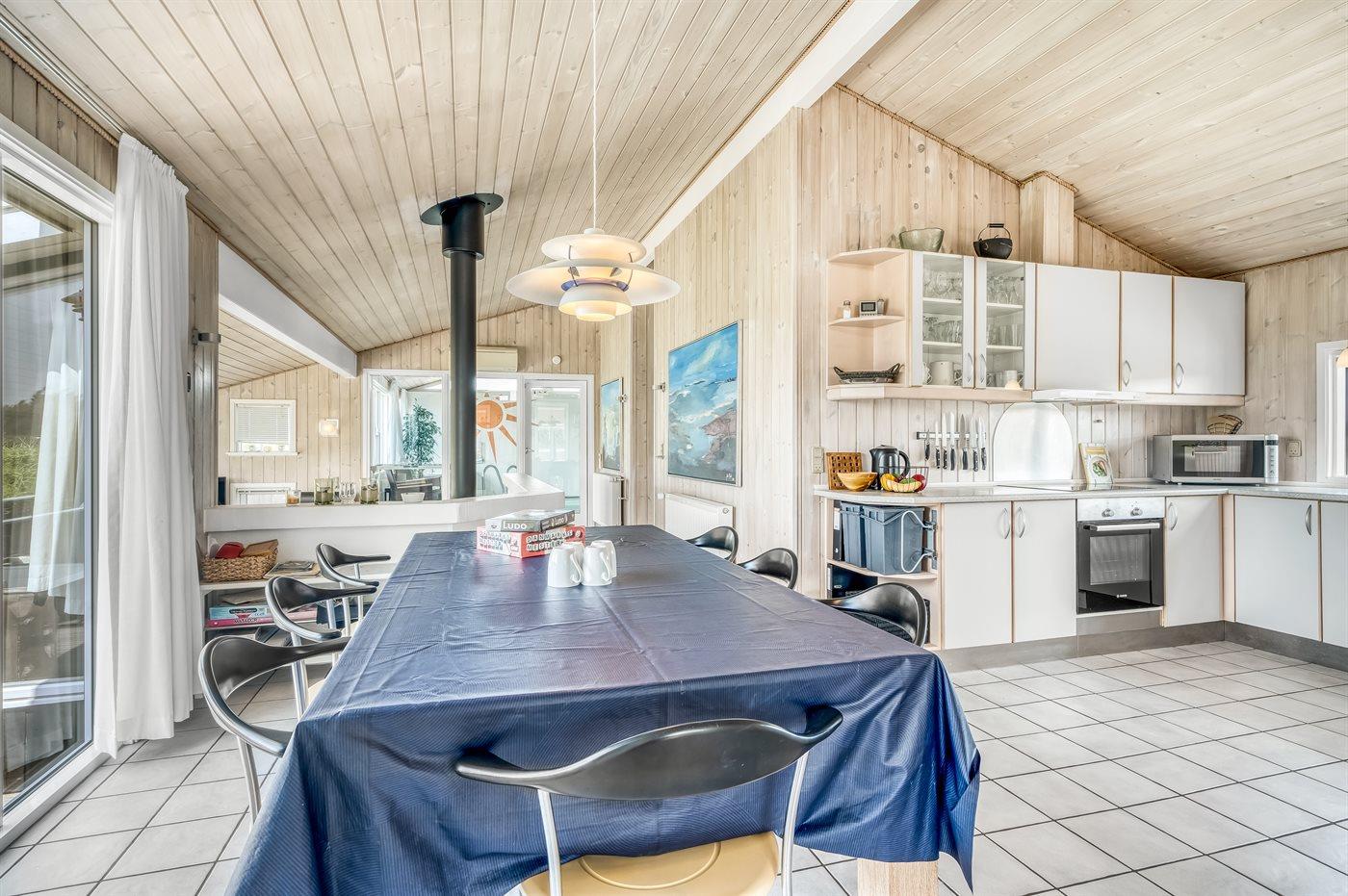 Køkkenet er udstyret med 1 køleskab. Der er 4 induktionskogeplader, varmluftovn, mikrobølgeovn samt opvaskemaskine Der er gulvvarme i køkkenet.