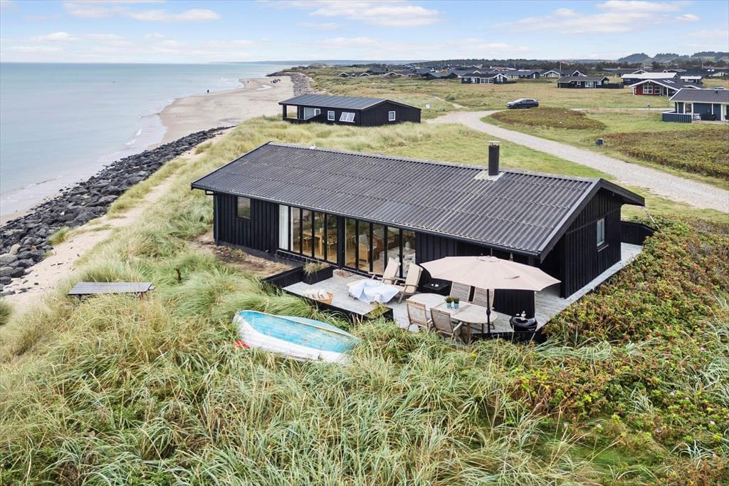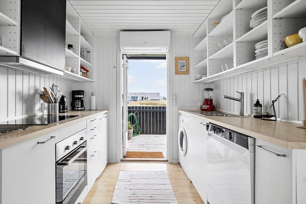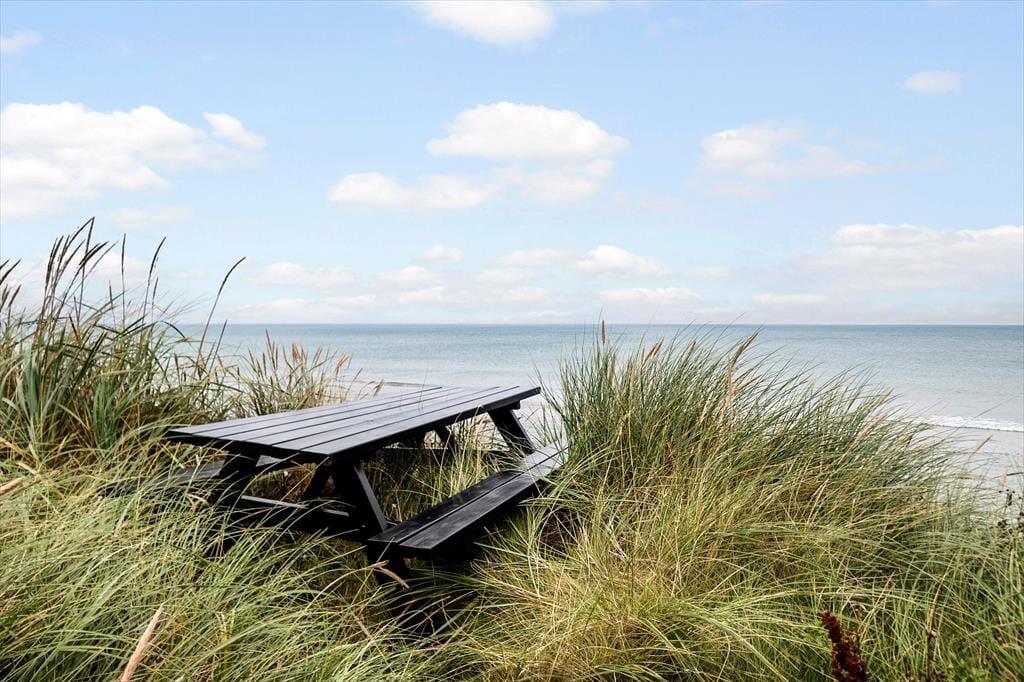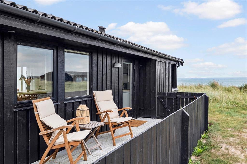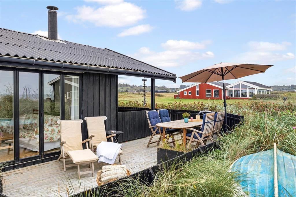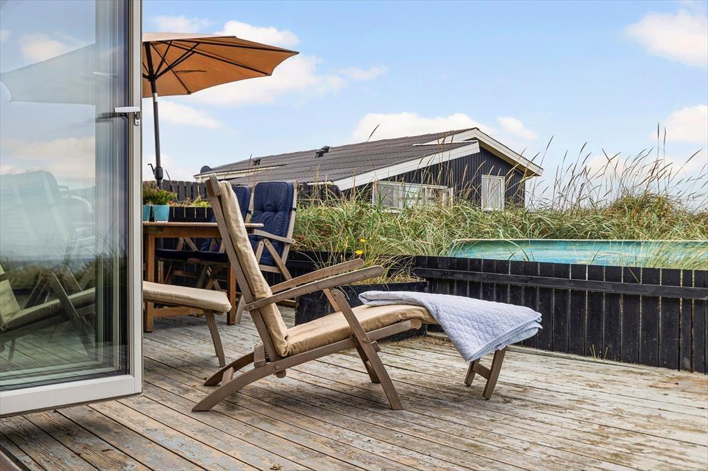 I får også fine forhold ude i det fri på den lille klitgrund, hvor en skøn terrasse smyger sig om tre sider af huset. Den er er helt lukket, så I kan opholde jer forholdsvis ugeneret fra besøgende på stranden, og så er der et overdækket område, hvis I får brug for lidt skygge. Foran sommerhuset er det skønt at starte dagen i solen, og hvis I får lyst til en morgendukkert, har I nem adgang til stranden via en nærliggende trappe.