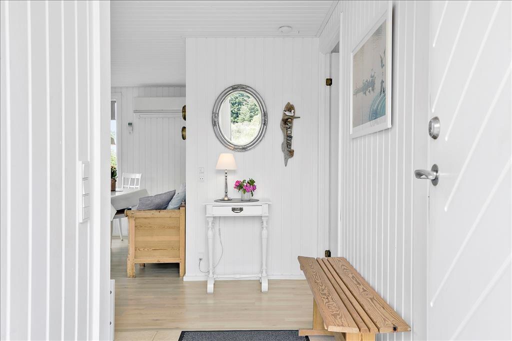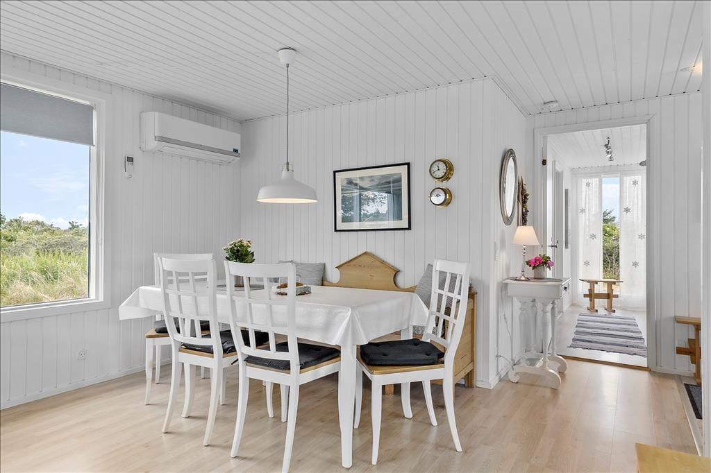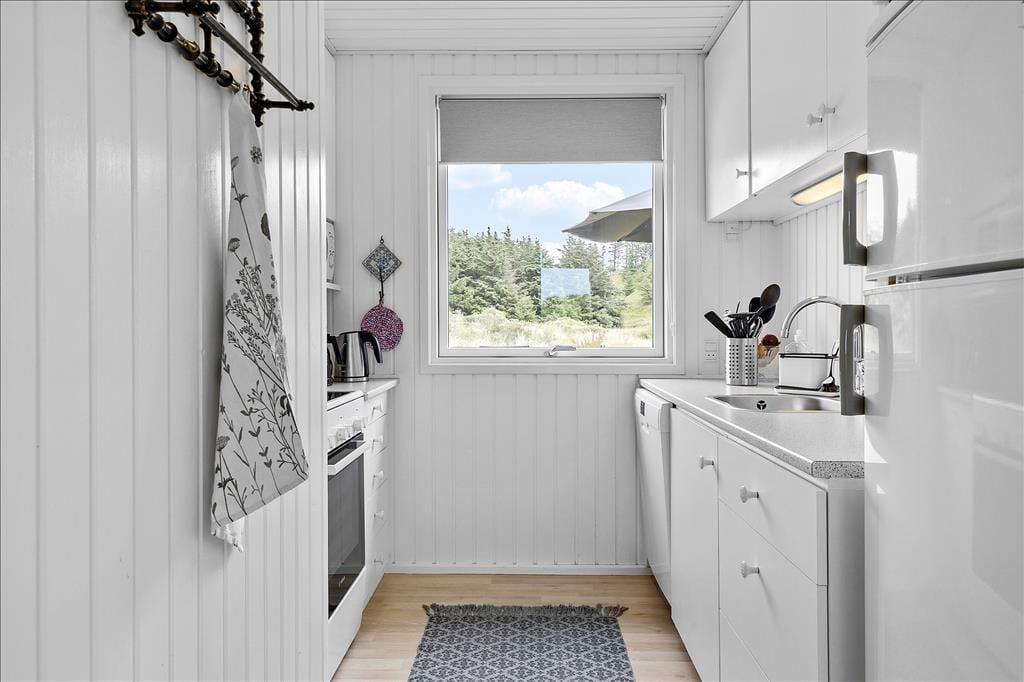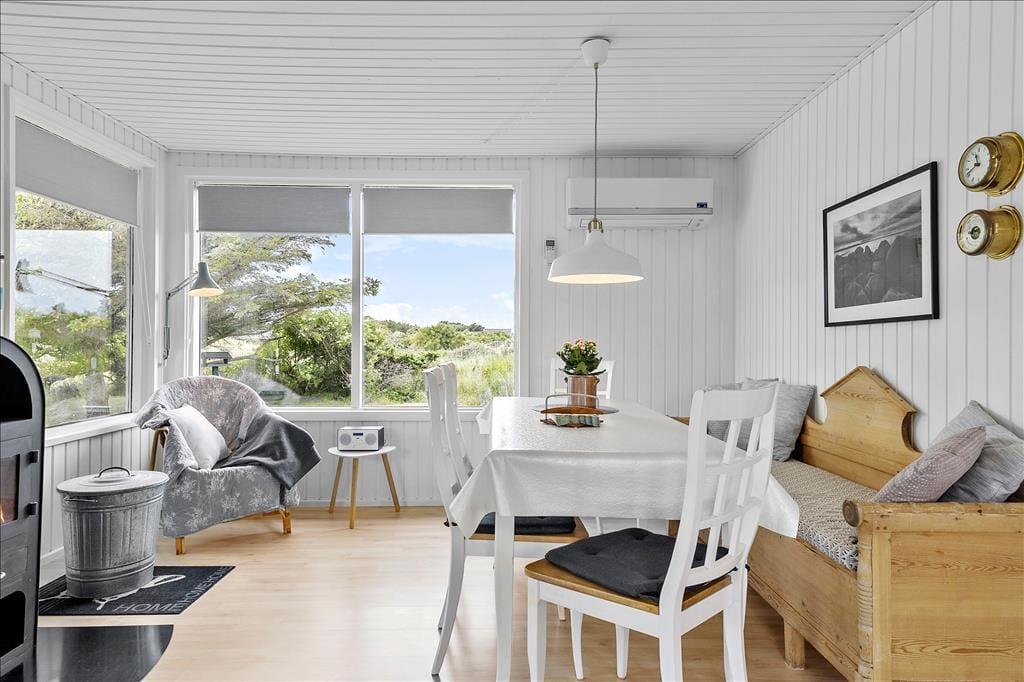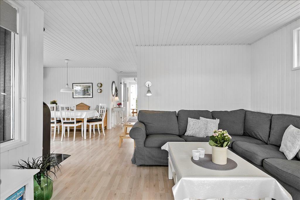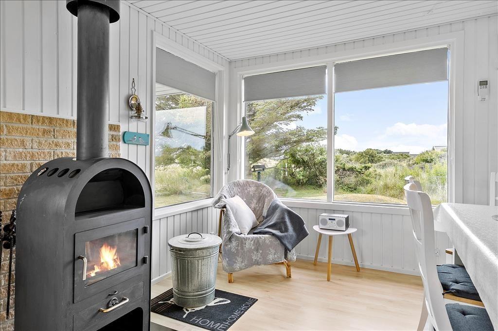 Køkkenet ligger med åben forbindelse til stuen, som er indrettet med lyse og moderne møbler. Brændeovnen er med til at fuldende den hyggelige stemning, som man møder, når man træder ind i huset. Huset er lyst og har et dejligt lysindfald fra de store vinduer. Sommerhuset har varmepumpe, som er med til at holde energiudgifterne nede.