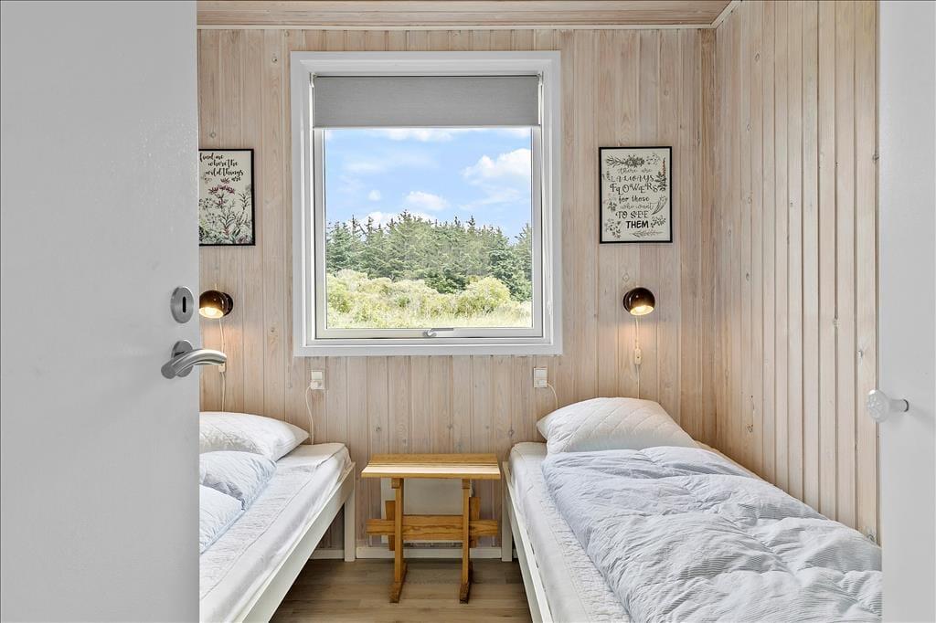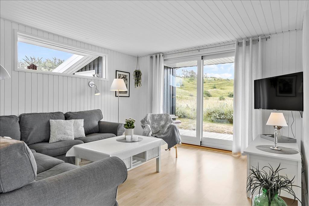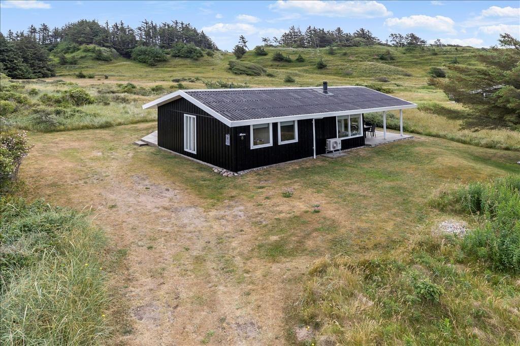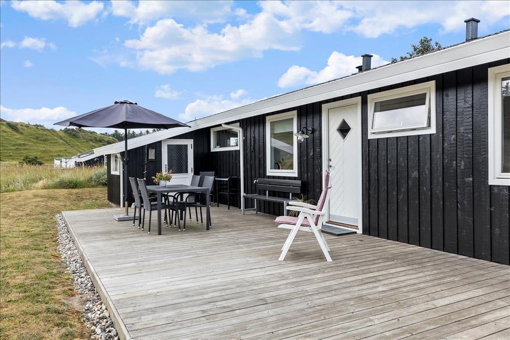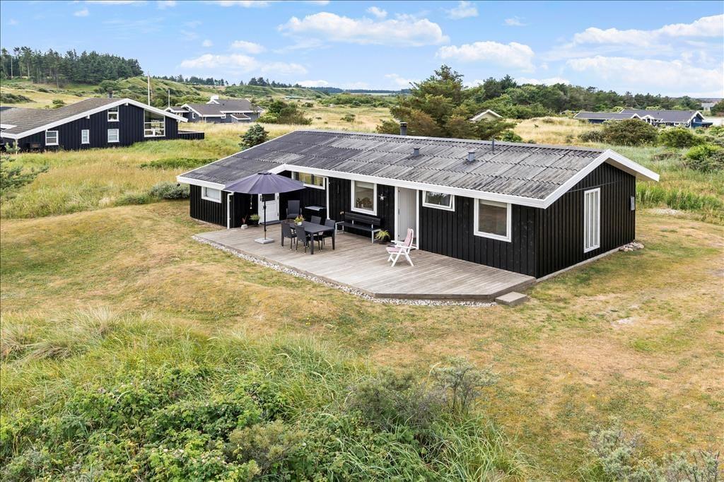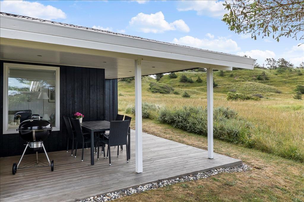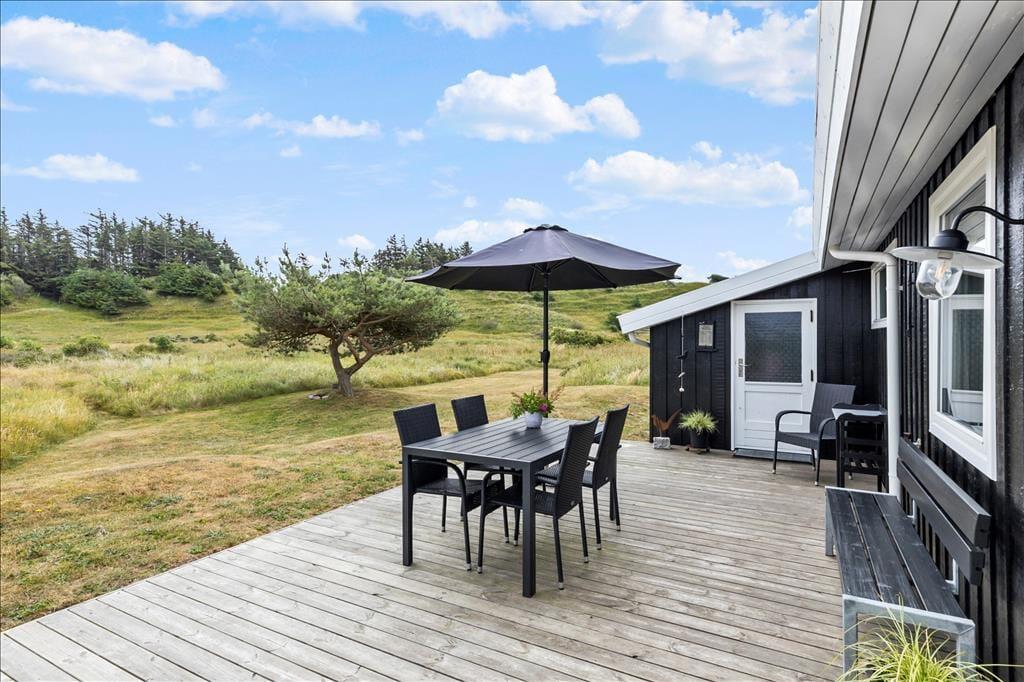 Sommerhuset har en skøn østvendt terrasse. Her kan man sidde og nyde morgenkaffen i ro og fred og betragte den fantastiske natur. Fra den vestvendte terrasse er der havkig til Vesterhavet og god mulighed for at nyde en fantastisk solnedgang. Sommerhuset ligger på en stor naturgrund som grænser op til indlandsklitterne og ”Vesterhavsstien”