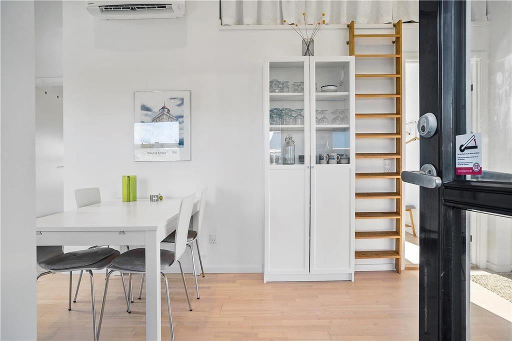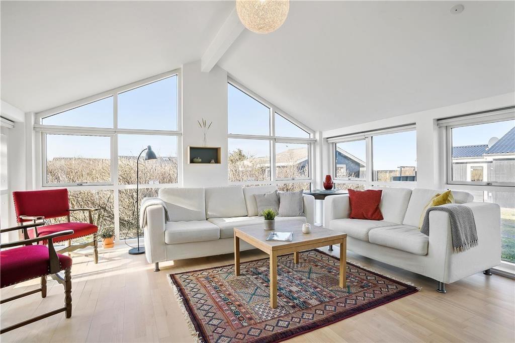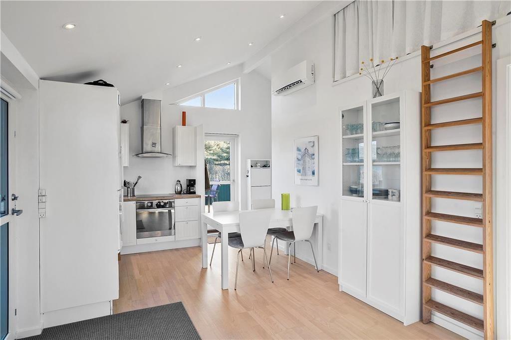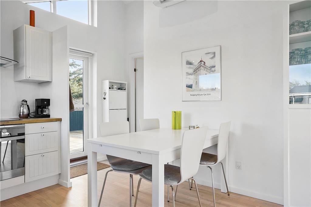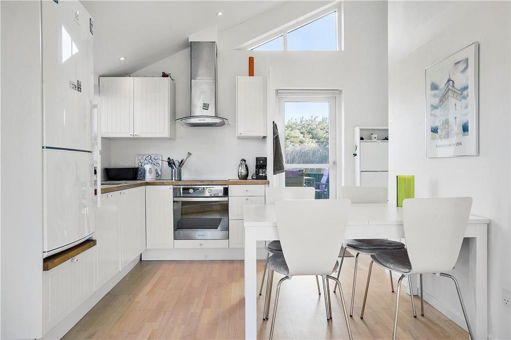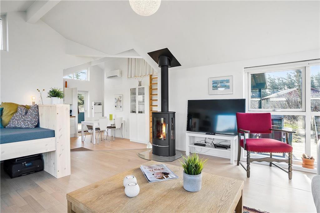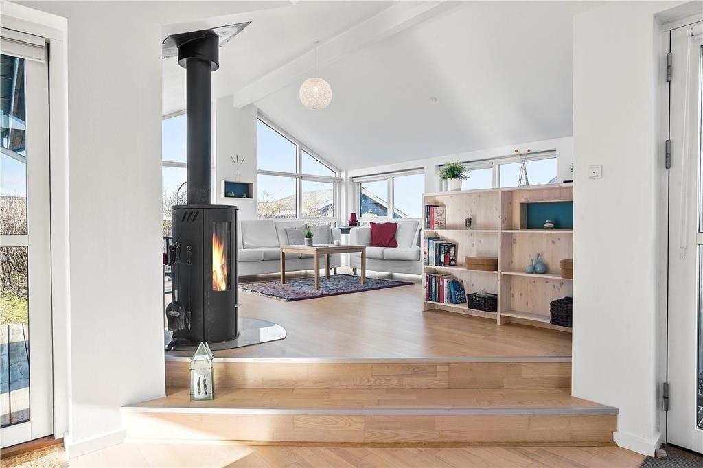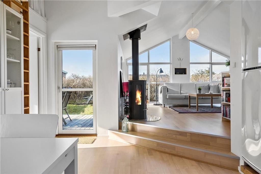 Sommerhuset er smagfuldt og praktisk indrettet med de bedste materialer. Køkkenet er dejligt lyst og venligt. Herfra er der adgang til den dejlige stue, der indeholder gode hyggekroge og brændeovn, der giver god varme på kolde aftener, og bidrager til den gode stemning. Der er store vinduer, som giver et flot lysindfald. Fra stuen er der adgang til terrassen, hvor man kan nyde sine måltider.