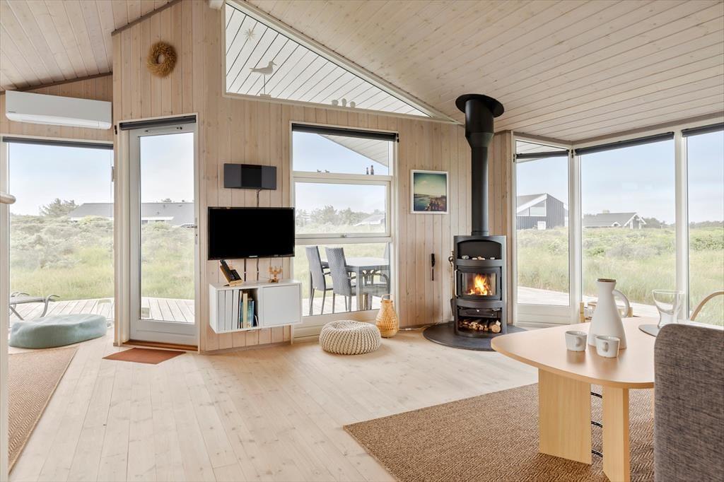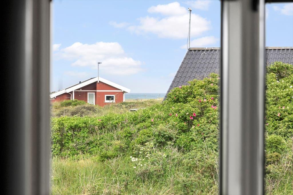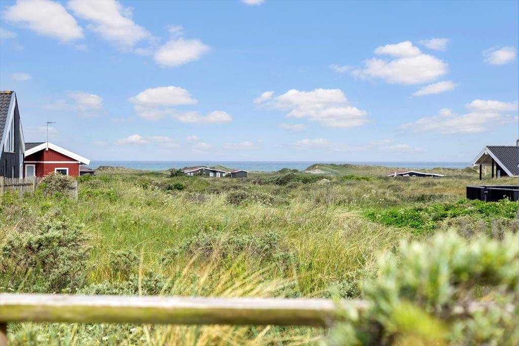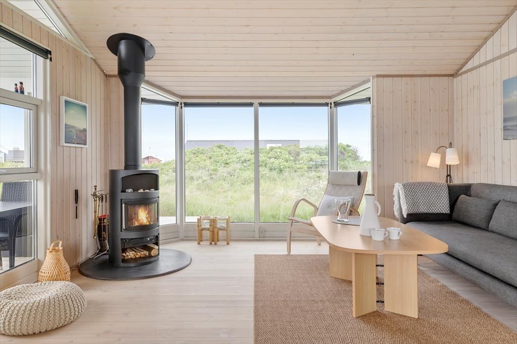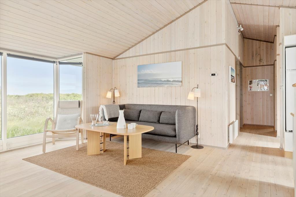 På den lille, lukkede vej Sandmarken finder I dette velholdte sommerhus til fem personer. Her på adressen får I en skøn ramme om ferielivet, for fra både hus og grund har I udsigt til Vesterhavet, og inden døre er der brændeovn, alkove og andre hyggelige detaljer.
