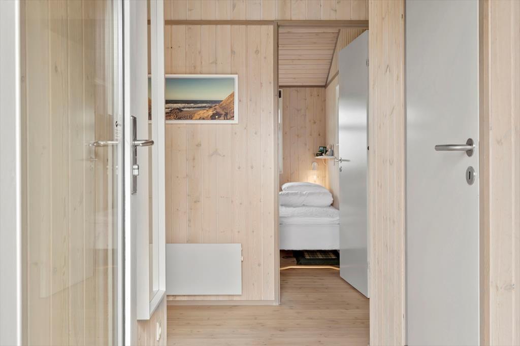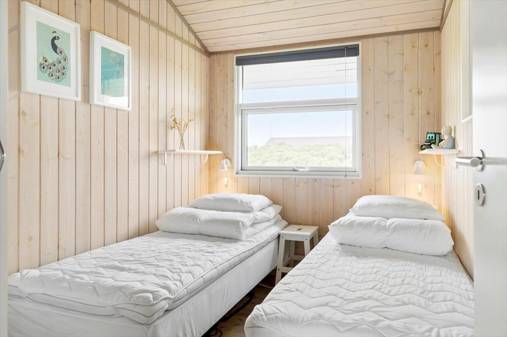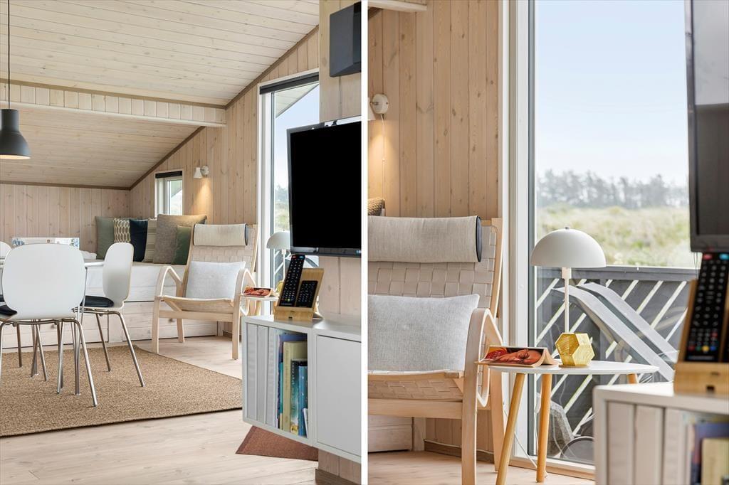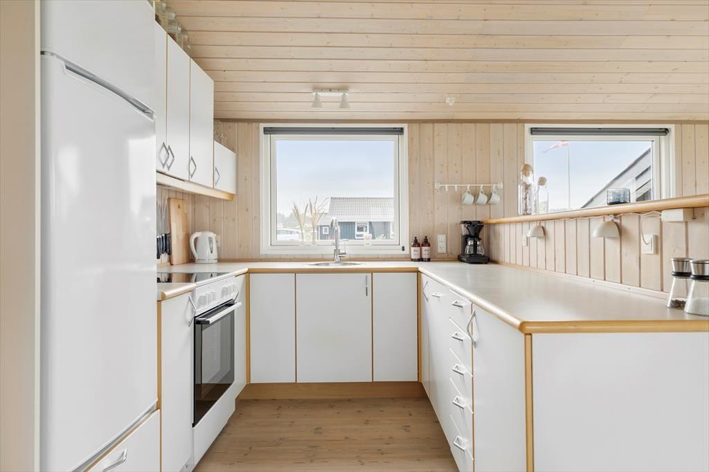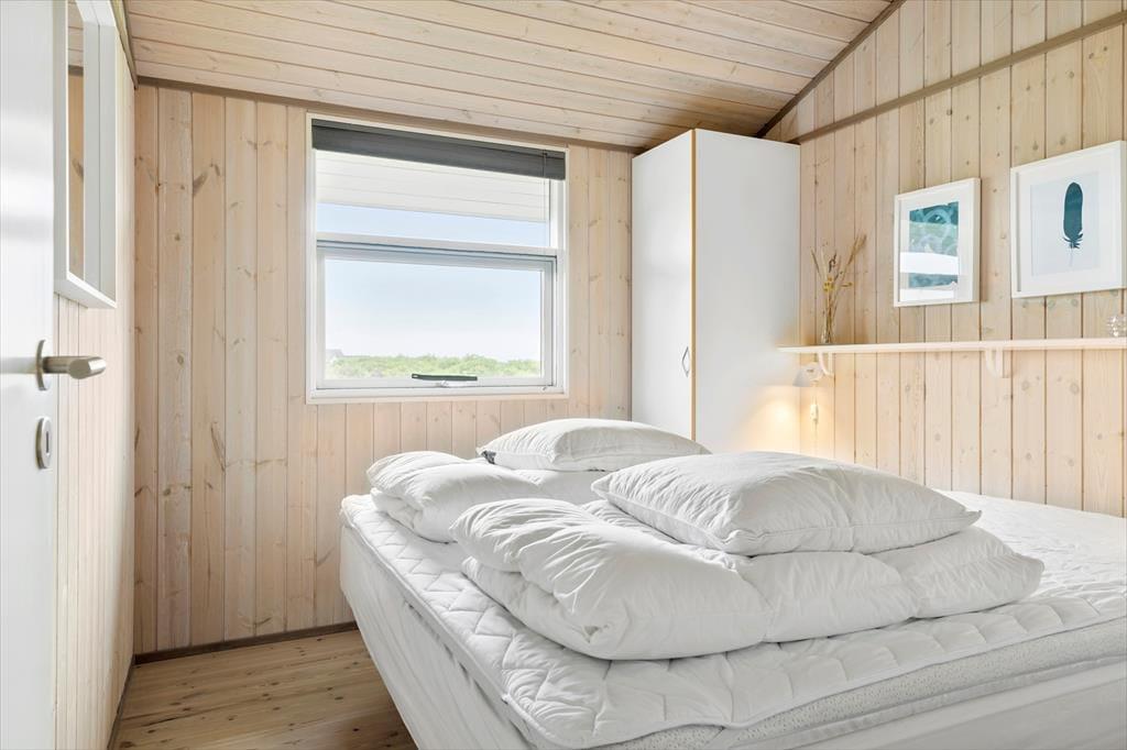 På den lille, lukkede vej Sandmarken finder I dette velholdte sommerhus til fem personer. Her på adressen får I en skøn ramme om ferielivet, for fra både hus og grund har I udsigt til Vesterhavet, og inden døre er der brændeovn, alkove og andre hyggelige detaljer.