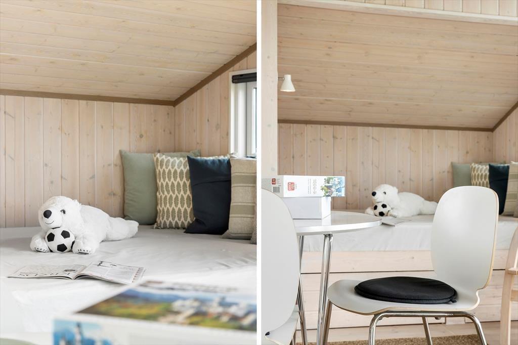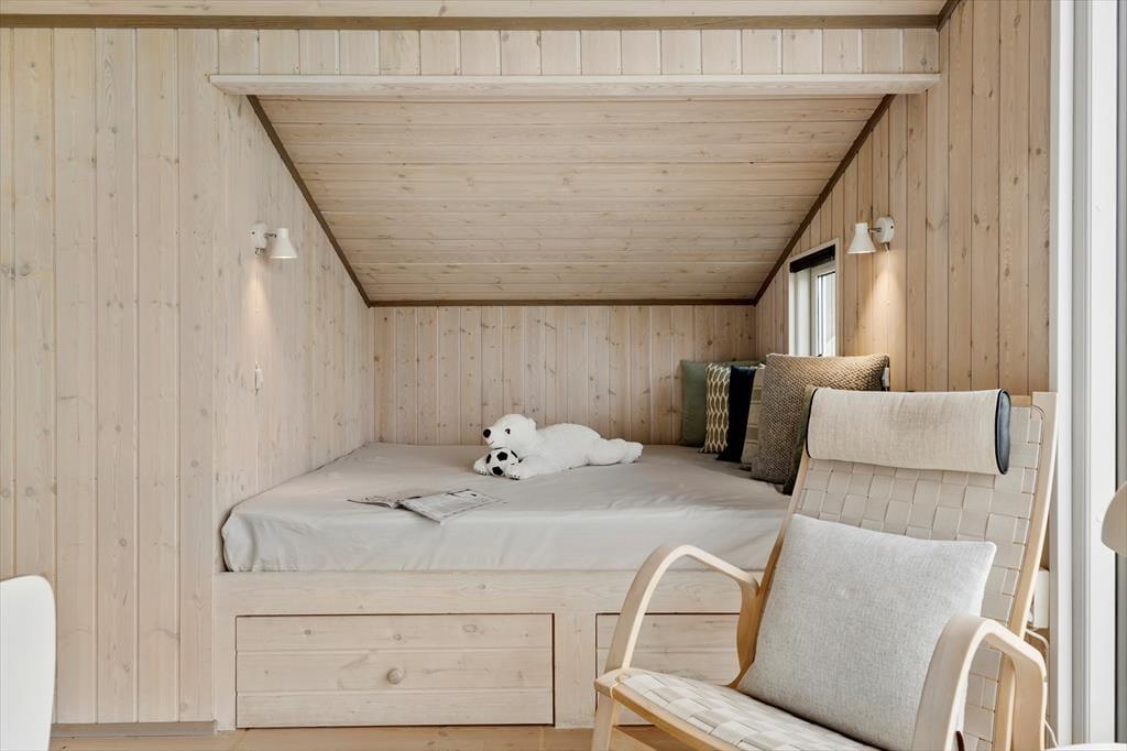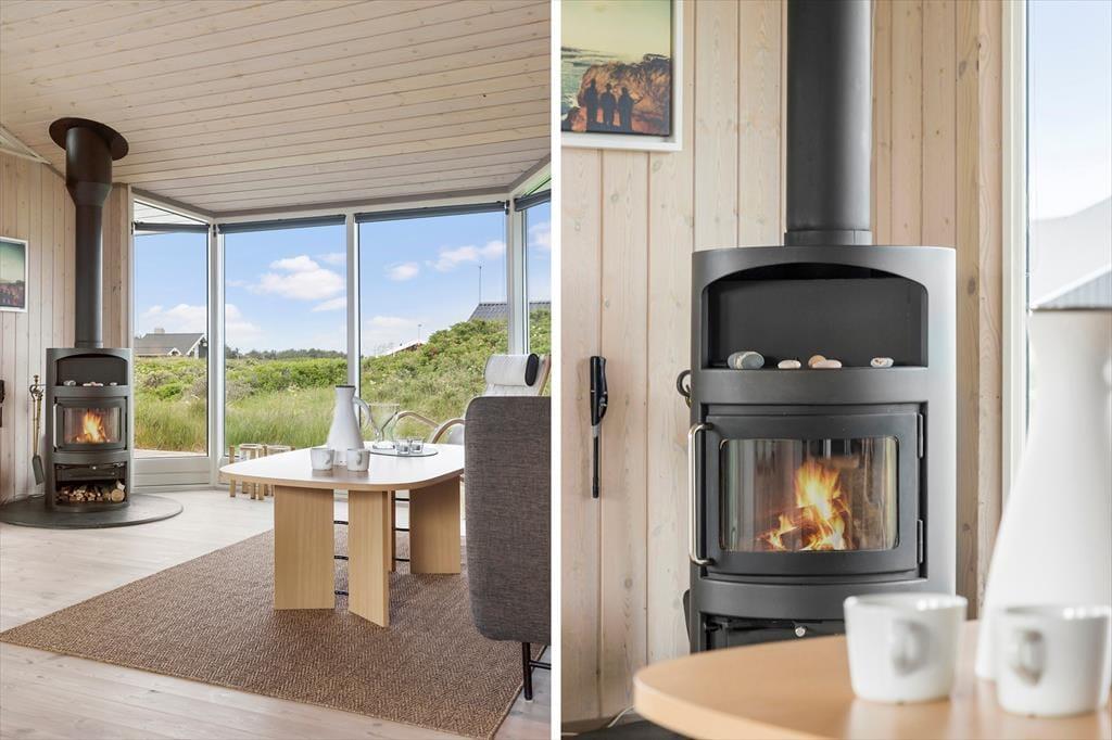 Atmosfæren er lys og rar i alle rum – ikke mindst i stuen, der er udstyret med store vinduespartier, så både solen og naturomgivelserne inviteres indenfor. På klassisk sommerhusmanér er der loft til kip og lys træbeklædning på væggene, og en brændeovn er placeret strategisk lige ved sofaafdelingen, så afslapningsstunderne kan foregå med frit udsyn til flammerne. Et pænt køkken ligger i åben forbindelse med stuen, og så er der for øvrigt en alkove i rummet, hvor I kan fordybe jer i dagens avis, få en middagslur eller ligefrem overnatte. Derudover er der mulighed for at sove på husets to gode værelser, hvoraf det ene er med dobbeltseng og det andet med to enkeltsenge, der kan skubbes sammen til en dobbeltseng. Et badeværelse med bruser og gulvvarme hører også med til planløsningen, og ved entréen er der et lille depotrum med vaskemaskine.