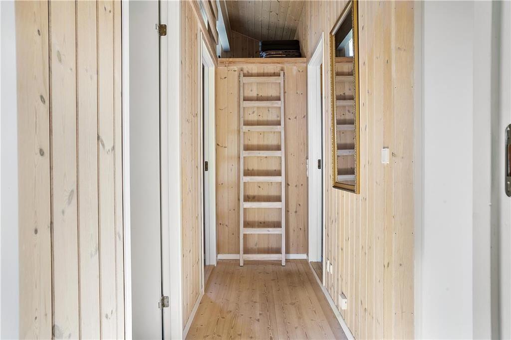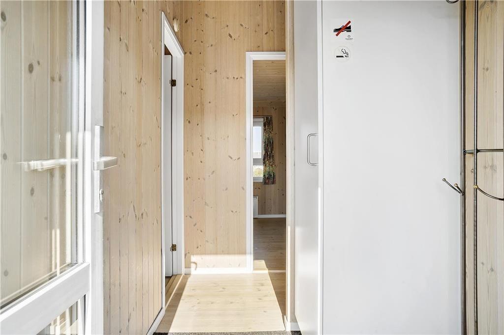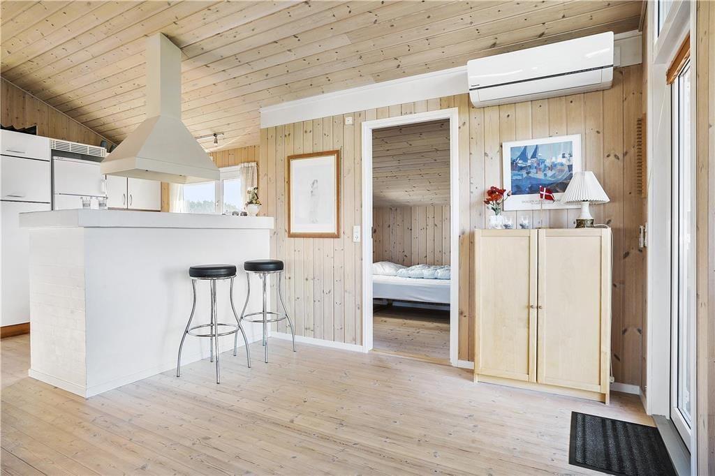 Sommerhusets køkken ligger i åben forbindelse til stuen. Stuen er velindrettet med pæne og komfortable møbler. Der er brændeovn, som giver en god varme og en hyggelig stemning. Fra stuen er der adgang til et af husets tre soverum. Husets to andre soverum ligger i den modsatte ende af huset. Her er også sommerhusets badeværelse med vaskemaskine og tørretumbler. Der er havkig fra både huset og grunden.