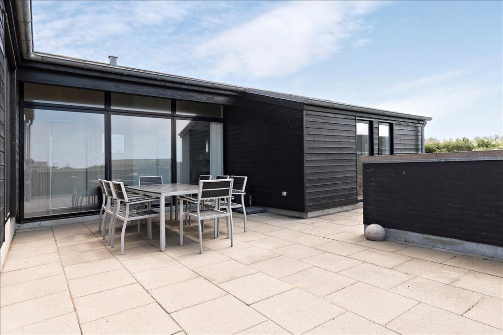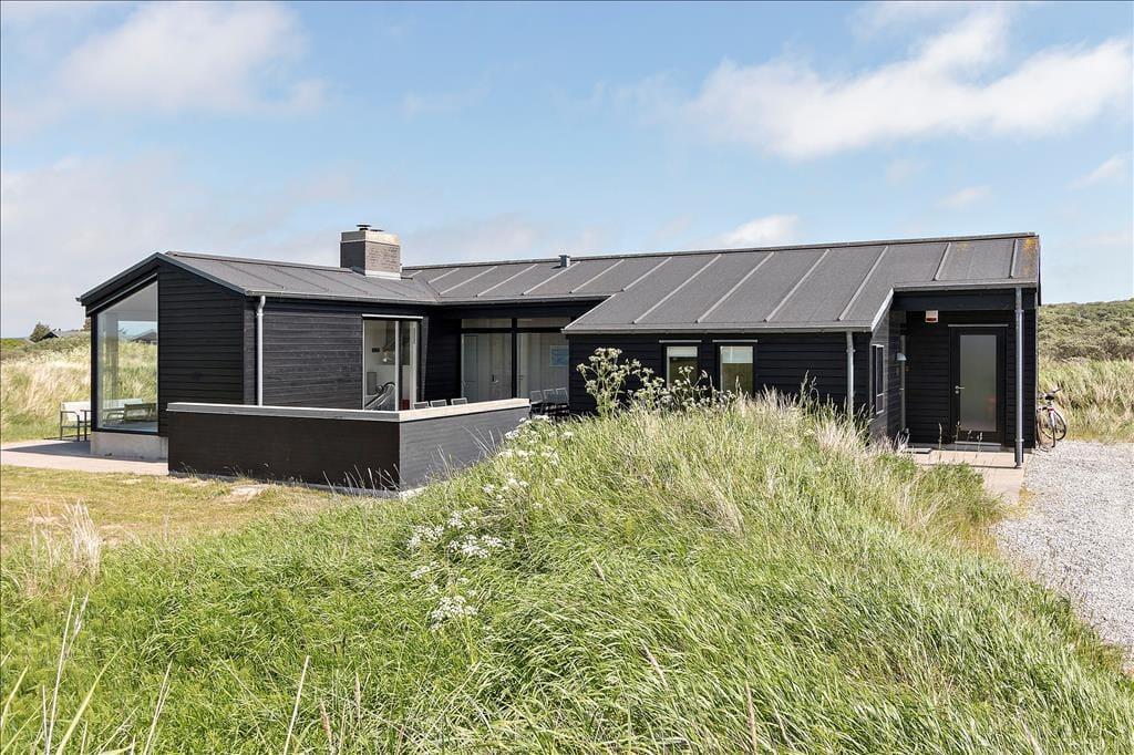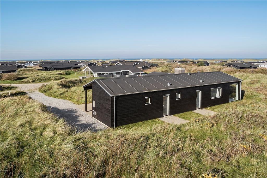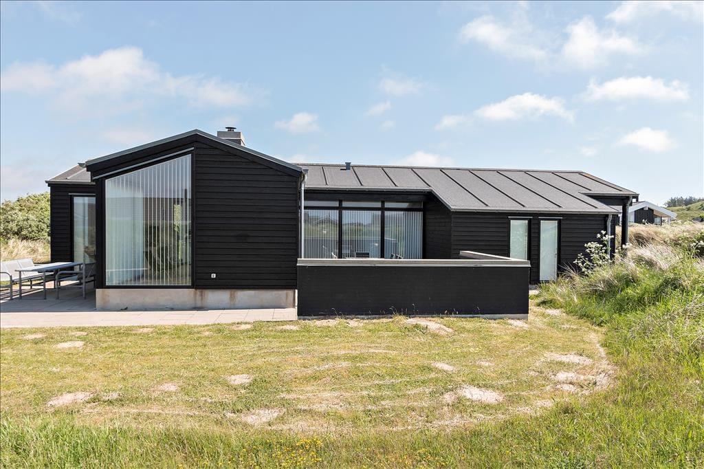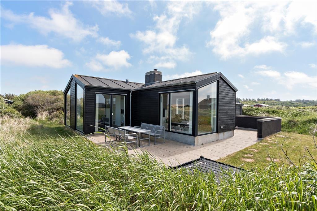 Huset ligger på en kuperet klitgrund midt i skøn natur og med dejlig ro og fred. Mellem klitterne er der kig til havet fra grunden. Fra stuen er der udgang til en solgård samt en nord vest vendt terrasse. Der er to små terrasser på østsiden af huset. Her er det skønt at nyde morgenkaffen midt i naturen. Der er også tænkt på familiens små med en sandkasse.