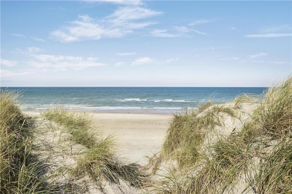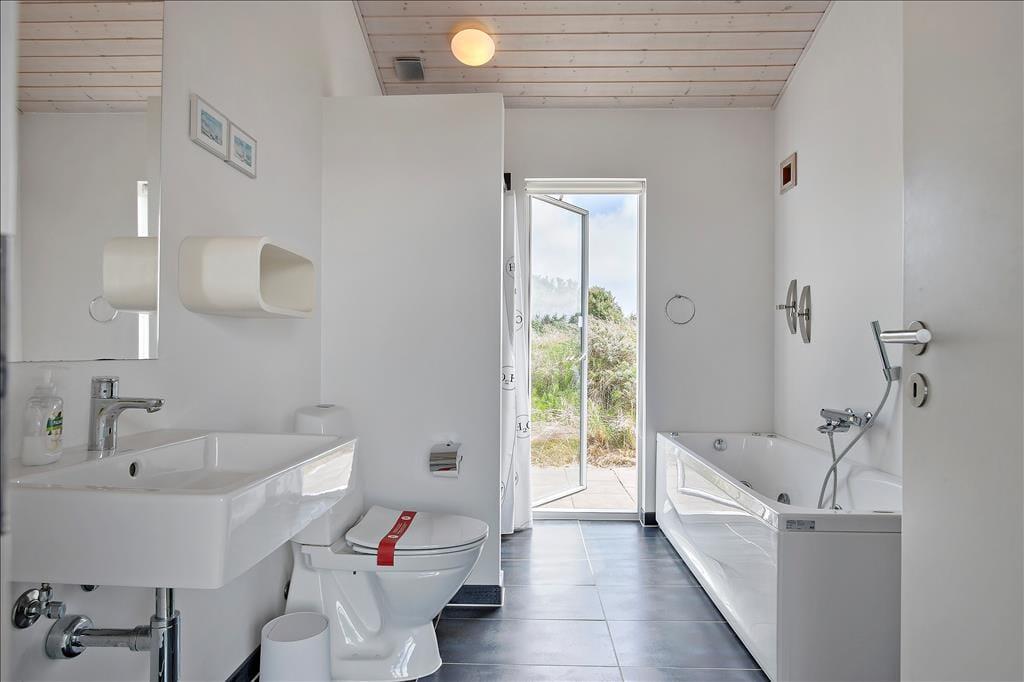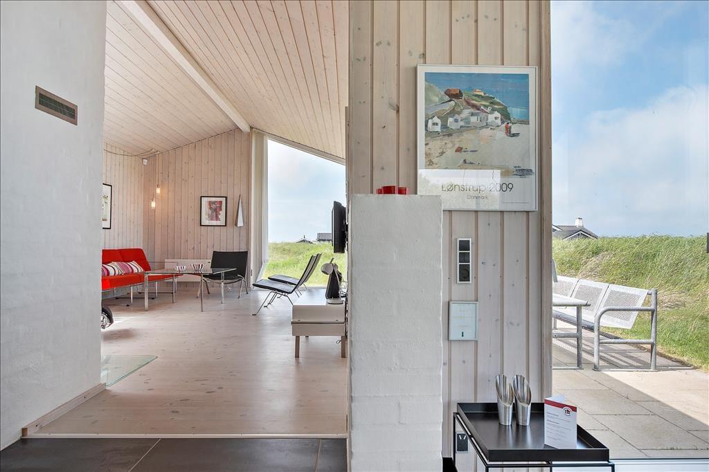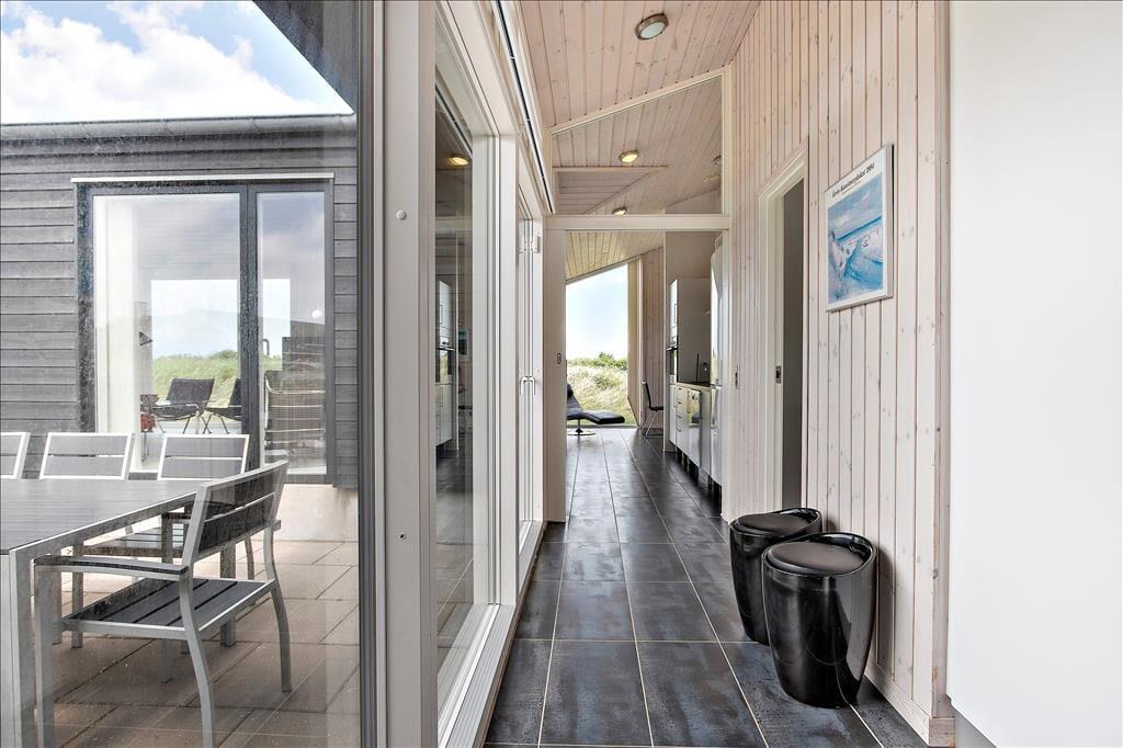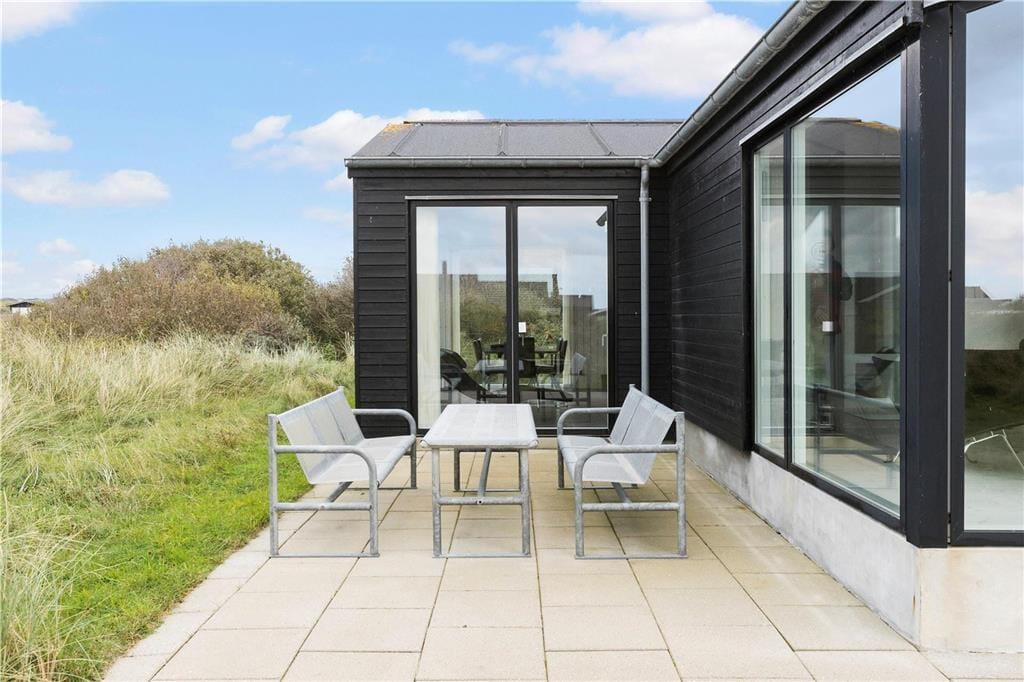 Huset ligger på en kuperet klitgrund midt i skøn natur og med dejlig ro og fred. Mellem klitterne er der kig til havet fra grunden. Fra stuen er der udgang til en solgård samt en nord vest vendt terrasse. Der er to små terrasser på østsiden af huset. Her er det skønt at nyde morgenkaffen midt i naturen. Der er også tænkt på familiens små med en sandkasse.