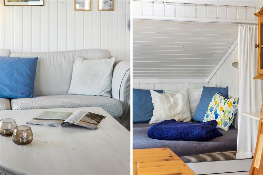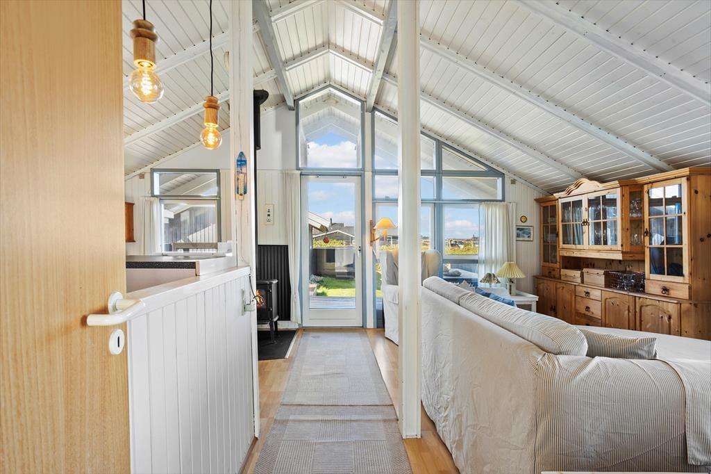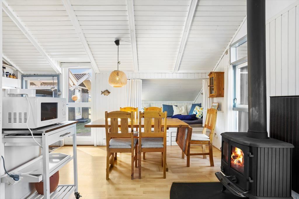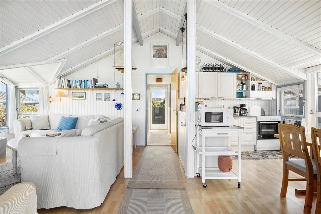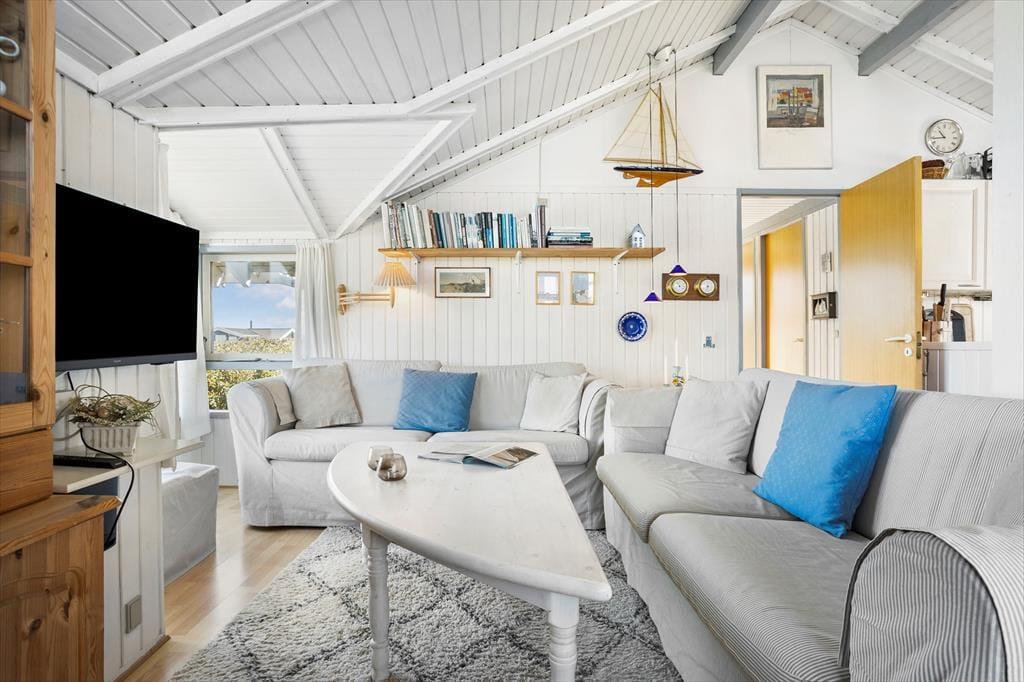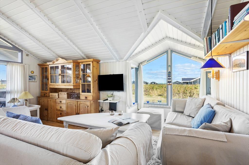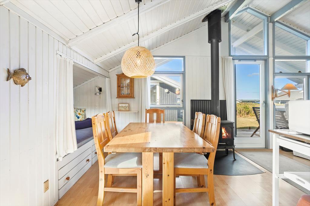Hvis I leder efter et sommerhus med sjæl og charme, kigger I på det helt rette eksemplar. Med loft til kip, brændeovn og hvidmalede trælister på væggene er stemningen helt i top inden døre. Vinduerne åbenbarer den fine havudsigt, og interiørets maritime farvesammensætning i hvid og blå fungerer som en påmindelse om, hvor tæt I befinder jer på Vesterhavet. Brætspil, måltider og læsestunder kan oplagt finde sted i opholdsrummet: Foruden en køkkenafdeling er rummet indrettet med spisebord, bløde siddemøbler og en sofaniche, så I kan finde jer en hyggelig siddeplads uanset anledningen. Huset byder på to soveværelser med henholdsvis en dobbeltseng og en sovesofa, og så er det derudover muligt at rede op i annekset.
