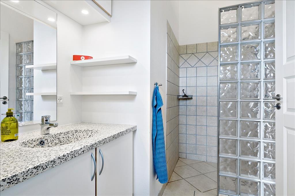 I kan sagtens invitere hele familien eller vennerne med på ferien, for sommerhuset kan rumme ni voksne. Huset byder på fire soveværelser og en hems med adgang fra opholdsrummet. Når I er mange, er det rart, at der ligger to badeværelser i huset – det ene er endda udstyret med både spa og sauna, så I kan forkæle jer selv med en vaskeægte wellness-afslapning. Husets hyggelige samlingspunkt er opholdsrummet, hvor køkken og stue er forenet. Det er et stort og højloftet rum med gennemstrømmende lysindfald, brændeovn, havkig og direkte adgang til terrasserne.