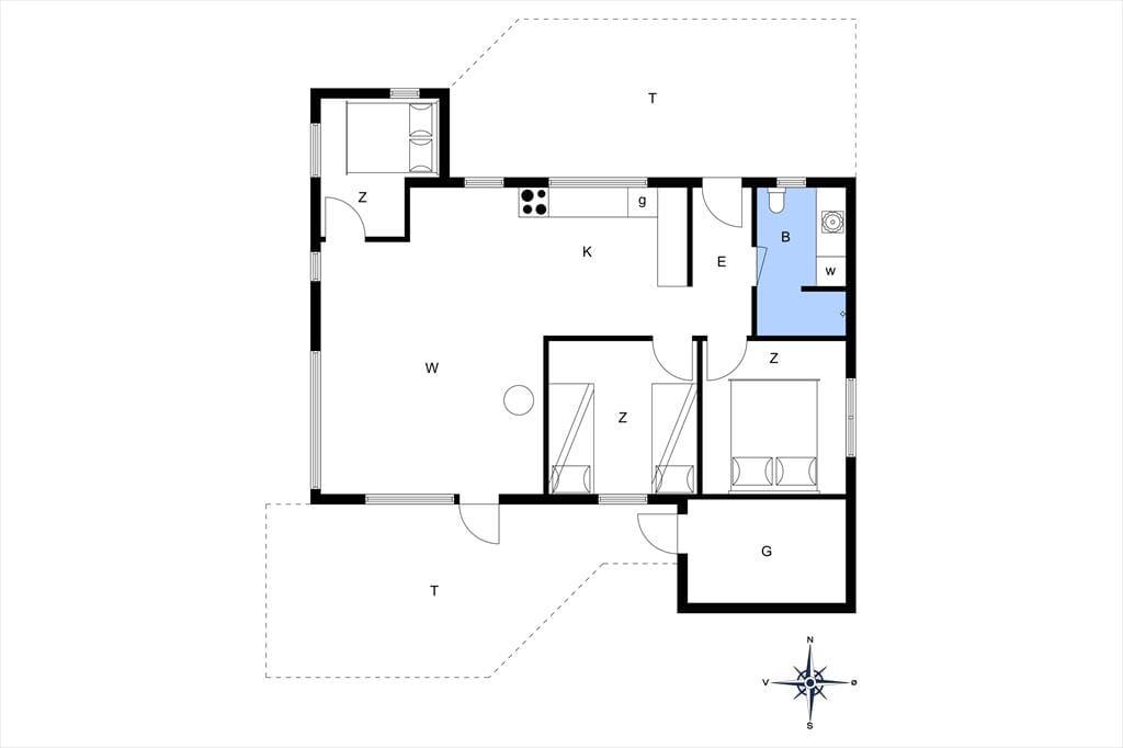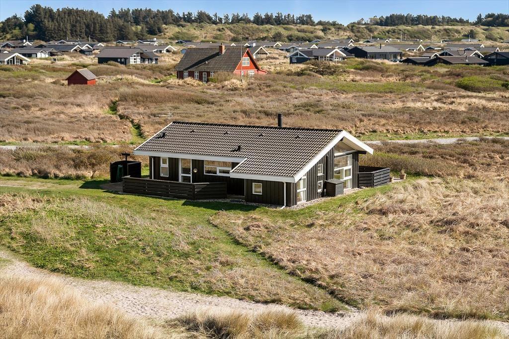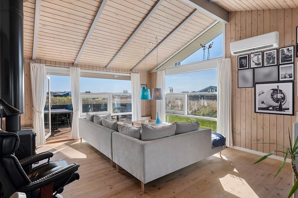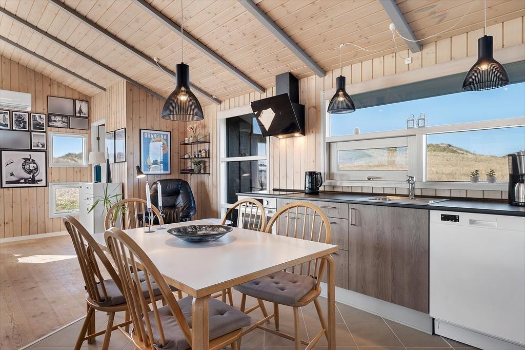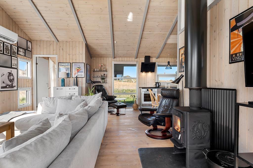 Sommerhuset har ligget her siden 1987 og er senest blevet renoveret i 2015. Indretningen er klassisk med lyse trævægge og loft til kip, og ikke bare selve huset, men også det komfortable møblement fremstår pænt og velholdt. Den indbydende atmosfære skyldes også de store vinduer, som lader solen skinne ind og giver udsigt til det flotte kystlandskab med høje klitter og åbne vidder. Planløsningen byder på et badeværelse og tre soveværelser, som i alt giver plads til otte overnattende gæster. Alle kan samles i opholdsrummet, hvor køkken og stue er forenet. Hvis det er køligt udenfor, kan I tænde op i brændeovnen, og på solrige sommerdage kan I slå havedøren op på vid gab og invitere den friske havluft indenfor.