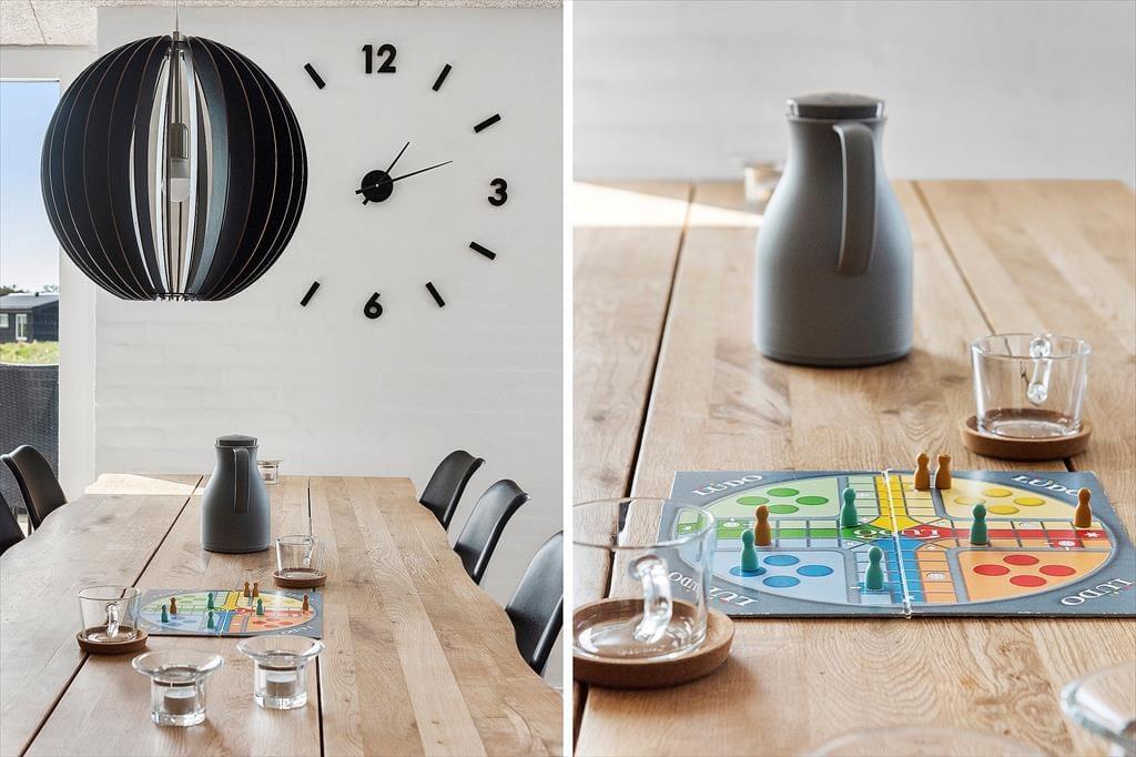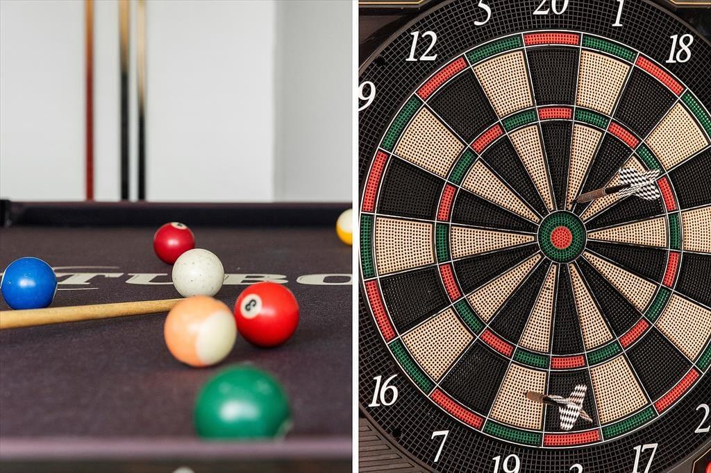 Via den overdækkede terrasse har I adgang til et herligt aktivitetsrum. Her kan legebørn i alle aldre samles i til et spil billard eller en bordtennisturnering, og I kan også dyste i dart om at ramme bullseye.