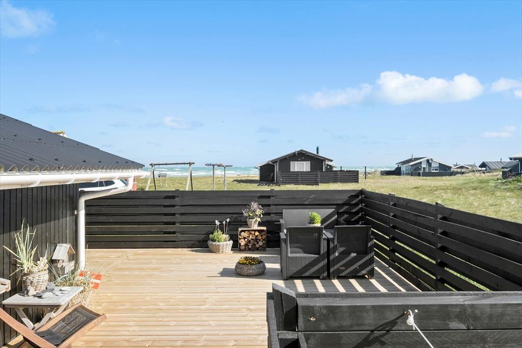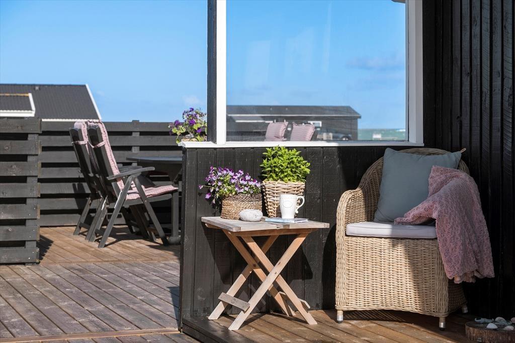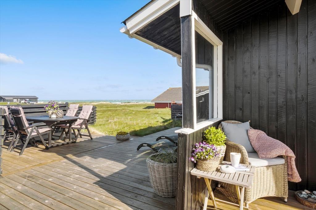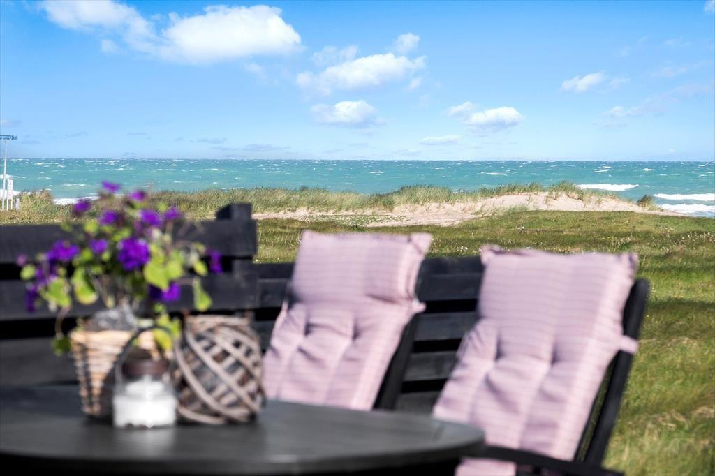 Havudsigten bliver bestemt ikke ringere, når I åbner havedøren og træder ud i det fri på den store terrasse, der smyger sig rundt om sommerhuset. Der er flere terrasseområder at vælge imellem, alt efter vindretningen og solens placering – blandt andet et overdækket, afskærmet areal, hvis I får brug for ly og læ. Ellers er det herligt at sidde helt ude under åben himmel med frisk havluft i næseborene og bølgebrus som et afslappende lydtapet.