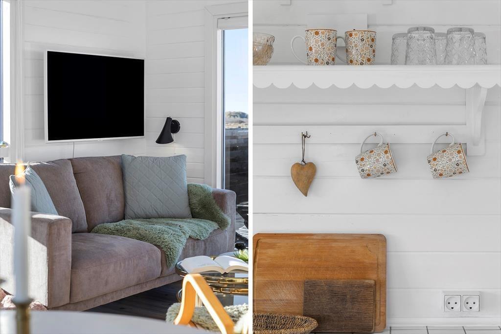 Sommerhuset hedder Kystens Perle, og det er et velvalgt navn: Gæster har det med at føle sig særdeles heldige over at have fundet en så gennemført hyggelig ferieoase, der ovenikøbet ligger bare 90 meter fra stranden. Den kystnære beliggenhed betyder, at der er havudsigt fra flere rum – inklusiv fra de to soveværelser – men vuet er nu allerbedst fra stuen, som er udstyret med havedør og flere store vinduespartier. Det giver desuden et skønt lysindfald i opholdsrummet, der efter en grundig renovering er stilfuldt indrettet a la klassiske, danske badehoteller med hvidmalede trævægge og vintage møblement. Den klassiske charme spiller smukt sammen med sommerhusets moderne tilføjelser, som blandt andet tæller en flot køkkenafdeling, Smart-TV, Sonos-højttalere samt et helt nyt og lækkert badeværelse.