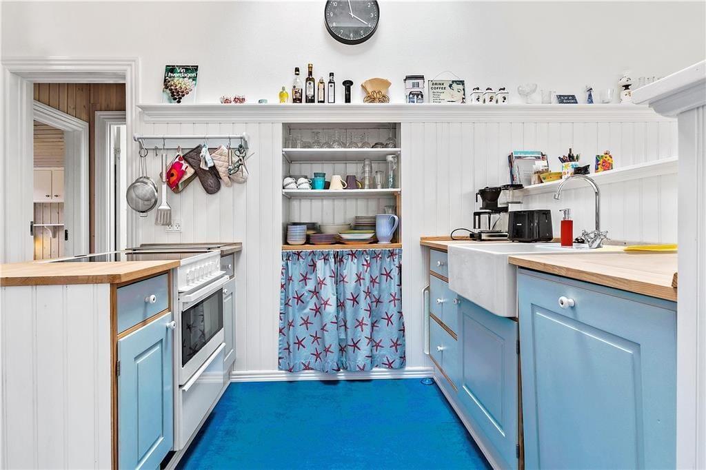 Sommerhuset er et kønt og klassisk træhus, der er opført i 1960 og sidenhen grundigt renoveret. Under opdateringen har man holdt fast i en klassisk stil, så inden døre prydes rummene af høje træpaneler, profilerede døre og fine retrodetaljer, der giver huset en særligt skøn sommerhusatmosfære. I kan blandt andet glæde jer til at kokkerere i det velindrettede køkken, der er udstyret med ovenlysvindue og ligger et par trin sænket i forhold til stuen. Netop stuen indbyder til hyggestunder med krimilæsning i sofaen og spilleaftner ved spisebordet – eventuelt med ild i brændeovnen, hvis vejret er til det. Planløsningen byder også på et stort og flot badeværelse samt to gode soveværelser, der suppleres af et anneks med dobbeltseng.