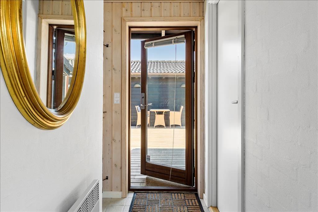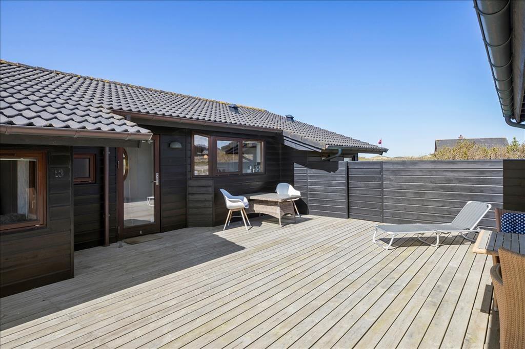 Mellem sommerhuset og annekset ligger en læfyldt gårdhave, der er skærmet mod tre sider. Mod syd er der åbent, så solen har fri adgang, og så eventuelle yngste feriegæster nemt kan smutte ud for at udforske den 1.439 m2 store grund. Hele familien kan også slå sig ned på den store og delvist overdækkede terrasse, der ligger vest for huset.