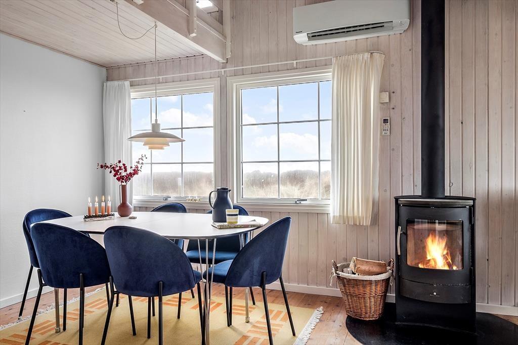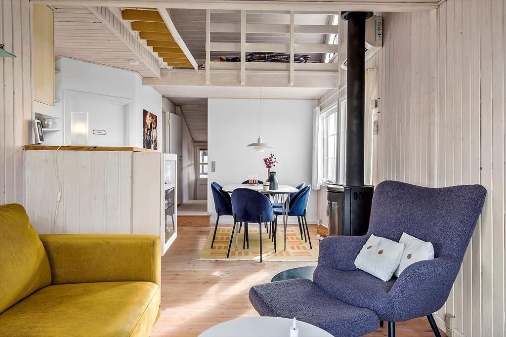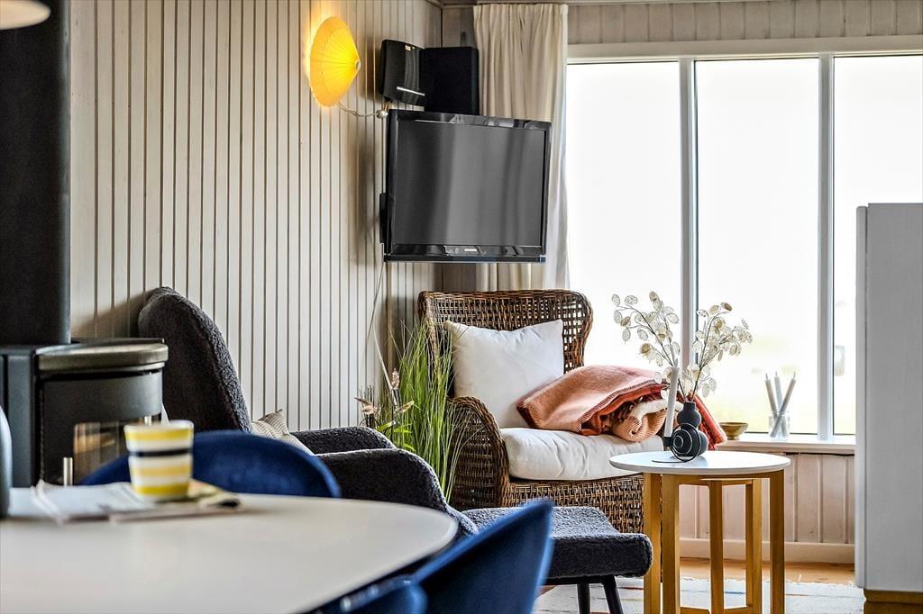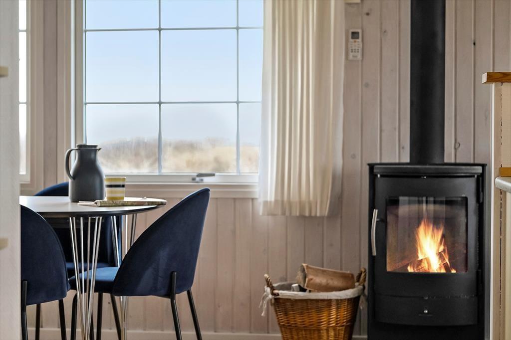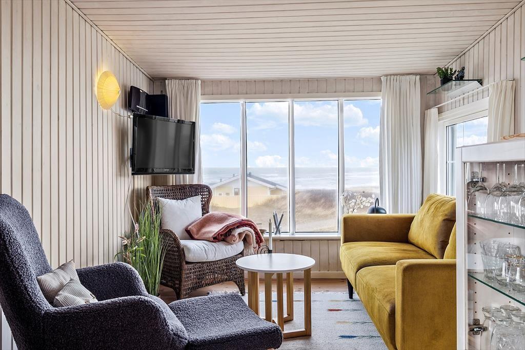 Når I holder ferie i dette fine, lille sommerhus, bor I bare 65 meter fra Nørlev Strand og har udsigt til Vesterhavet fra solterrassen – og selv når I hygger jer inden døre nær brændeovnen, kan I nyde synet af den flotte kyststrækning og havets brusende bølger.