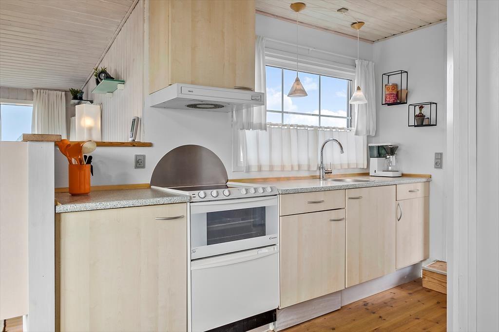 Sommerhuset har ligget på denne naturskønne plet på Danmarkskortet helt tilbage siden 1952. Og selvom der selvfølgelig er sket en del forbedringer, har huset fået lov til at beholde sin originale charme og hyggelige atmosfære, så det inviterer virkelig til at tage ferien i roligt tempo. Med sine 56 m2 er huset ikke et af de største på markedet, men planløsningen, der byder på et brusebadeværelse og to soveværelser med dobbeltseng, passer fint til fire personer. Husets hjerte er stuen, der har integreret køkkenafdeling, brændeovn, kabel-tv og pænt møblement. Her er skønt at være – ikke mindst på grund af de store vinduer, der inviterer kystens smukke dagslys indenfor og giver udsigt til havet.