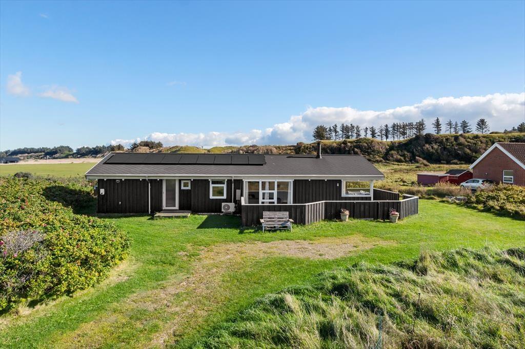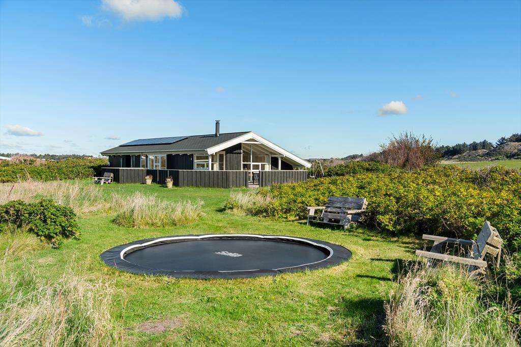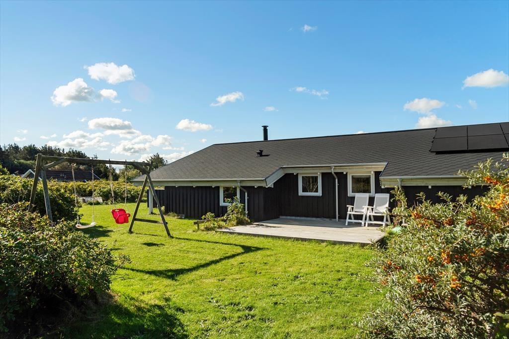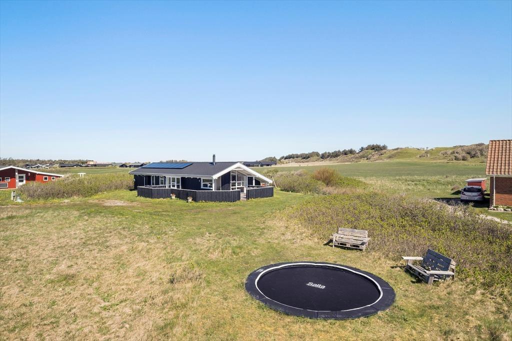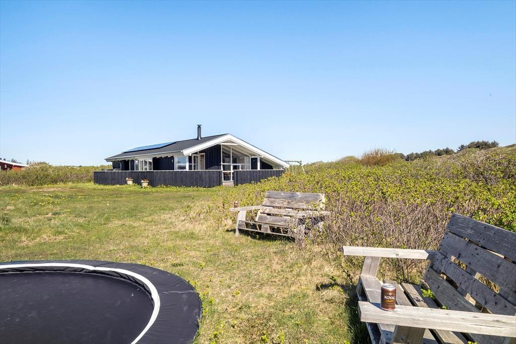 På den 2500 m2 store naturgrund venter der jer et skønt udemiljø med masser af plads til leg og afslapning. Til børnene er der trampolin og gynger, og selv hundene er der tænkt på i form af en skyggefuld hundegård med hundehus. Rundt om sommerhuset ligger der flere terrasser. I kan starte dagen med en stille kop kaffe på den læfyldte østterrasse – med fuglesang og udsigt til indlandsklitten, er det noget helt særligt at sidde her, mens solen står op. I kan også nyde livet på den lukkede træterrasse, der breder sig syd og vest for huset. Derudover er der flere komfortable pallesofaer fordelt på grunden, så I får nemt ved at finde den helt rette opholdsplads. Endelig skal det nævnes, at der er en 11 kW ladestander med type-2 stik til elbil.