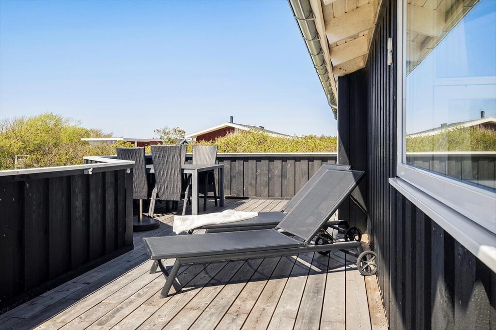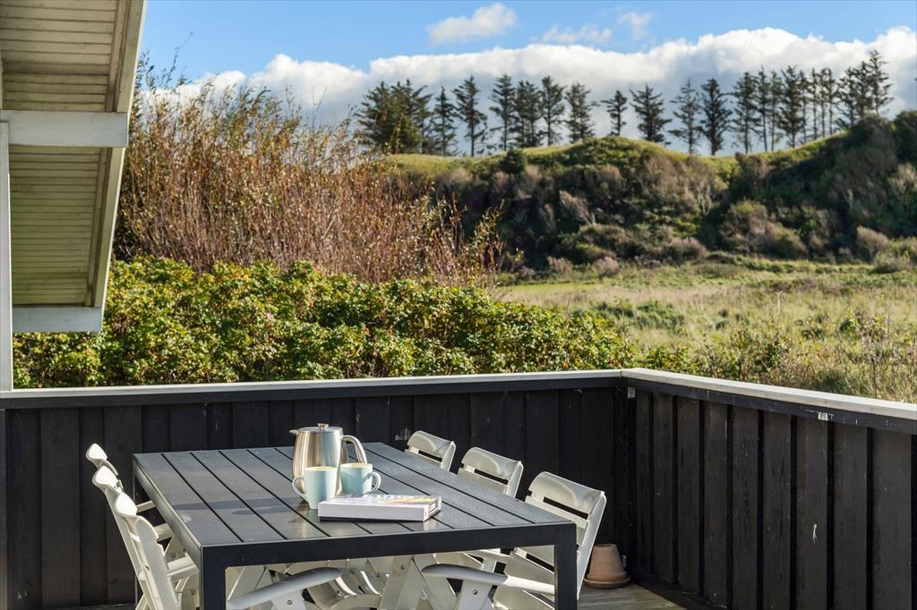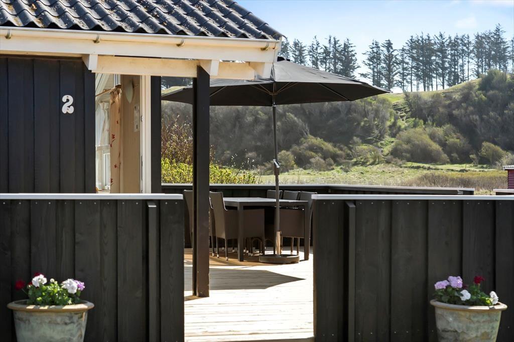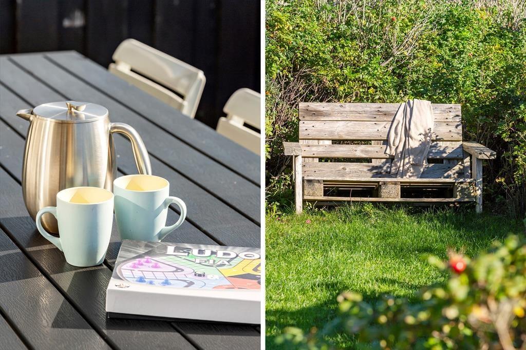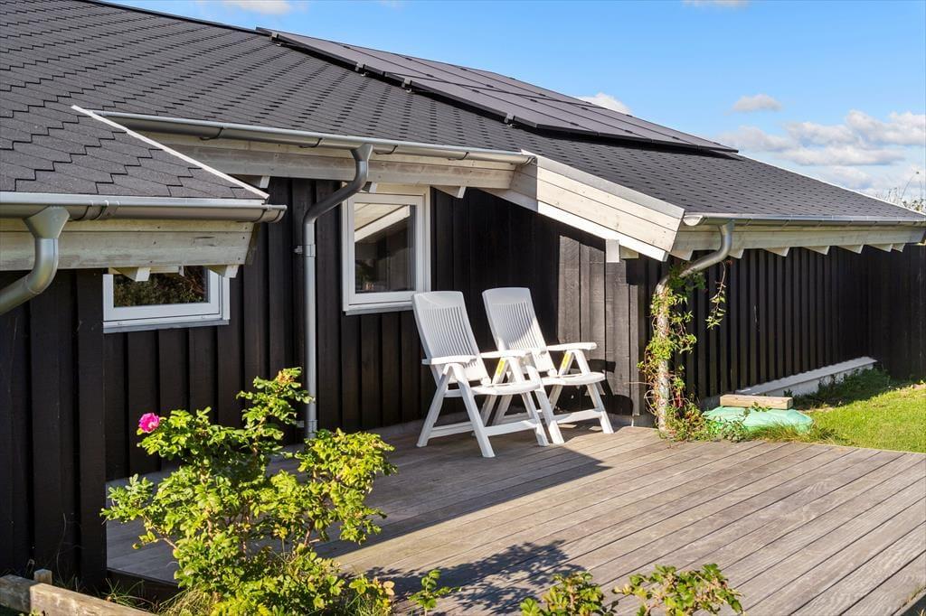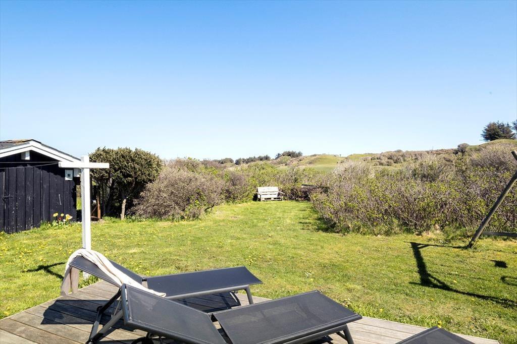 På den 2500 m2 store naturgrund venter der jer et skønt udemiljø med masser af plads til leg og afslapning. Til børnene er der trampolin og gynger, og selv hundene er der tænkt på i form af en skyggefuld hundegård med hundehus. Rundt om sommerhuset ligger der flere terrasser. I kan starte dagen med en stille kop kaffe på den læfyldte østterrasse – med fuglesang og udsigt til indlandsklitten, er det noget helt særligt at sidde her, mens solen står op. I kan også nyde livet på den lukkede træterrasse, der breder sig syd og vest for huset. Derudover er der flere komfortable pallesofaer fordelt på grunden, så I får nemt ved at finde den helt rette opholdsplads. Endelig skal det nævnes, at der er en 11 kW ladestander med type-2 stik til elbil.