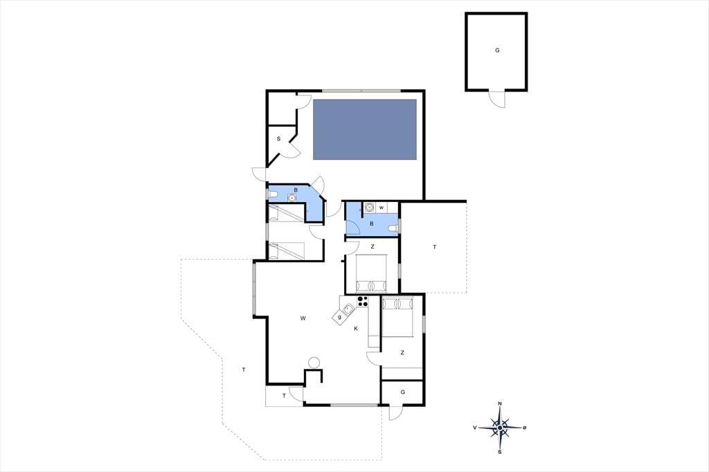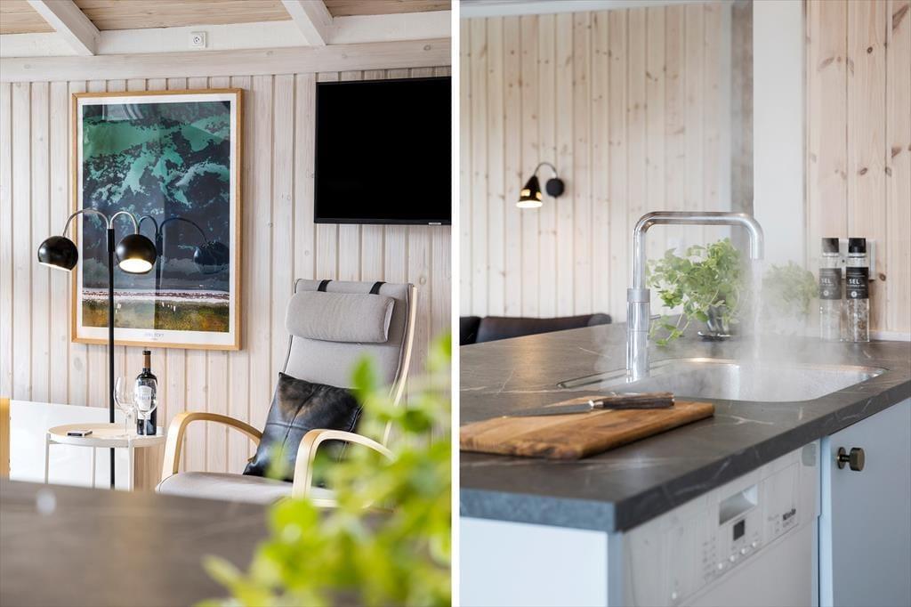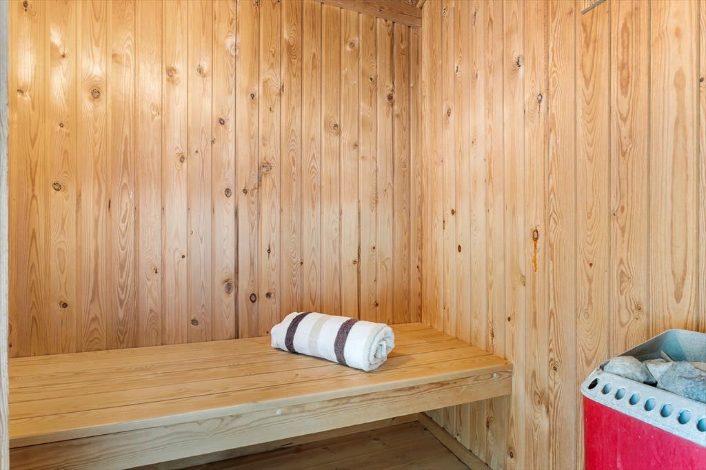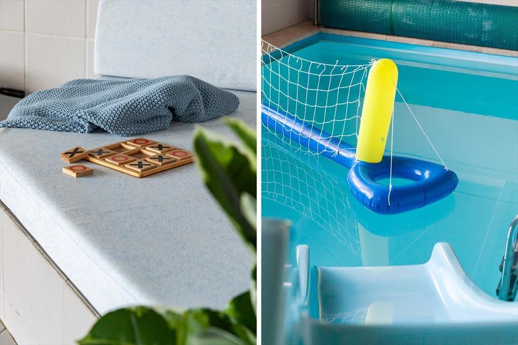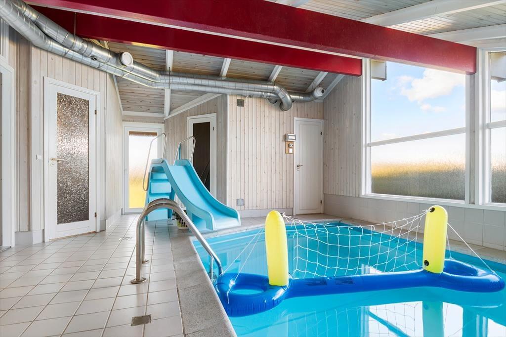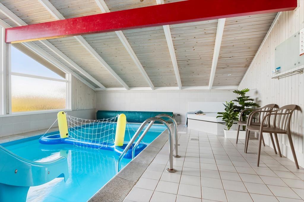 Planløsningen passer godt til otte personer med to badeværelser og tre soveværelser – heraf er det ene udstyret med to køjesenge, så det kan oplagt rumme alle børnene, hvis to familier holder ferie sammen. Alle kan samles i stuen, som er et dejligt opholdsrum med brændeovn, stor sofa og en hyggelig spiseplads, der er placeret ved et stort vindue. Dertil er der et smagfuldt velindrettet og lyst køkken, med en Quooker. I den anden ende af sommerhuset ligger poolafdelingen, hvor I kan slappe af i saunaen. Poolen er blevet efterisoleret i 2023. Derudover er der kommet en ny dug på, som skal hjælpe med at holde på varmen. Trænger I til motion, kan I benytte svømmetræneren i poolen, og hvis I hellere vil plaske og lege, vil rutsjebanen sikkert være et hit.