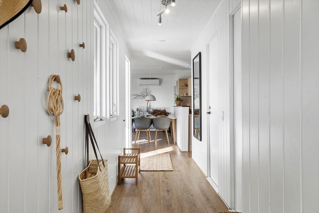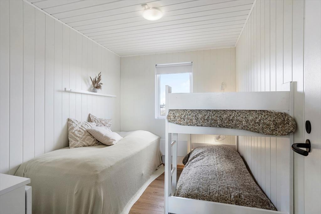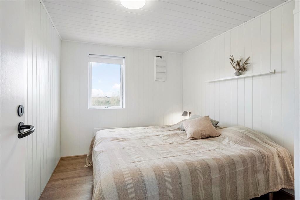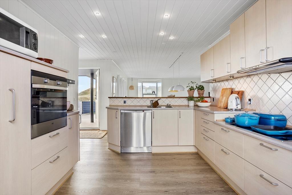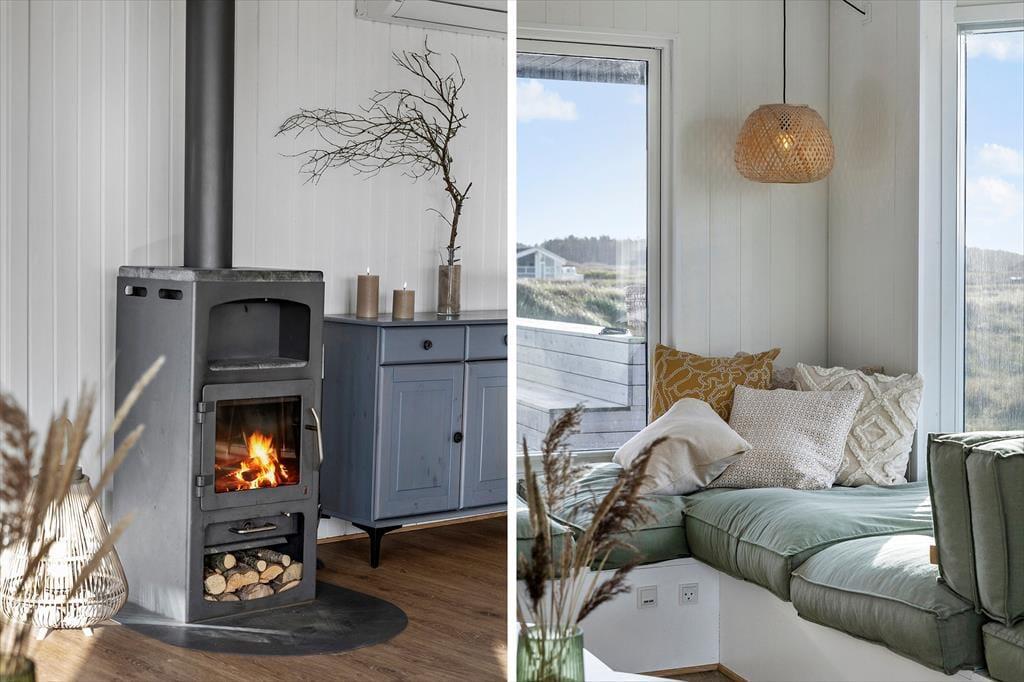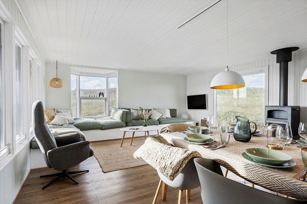 Efter en vellykket renovering i 2022 har sommerhuset et lyst og indbydende indre. Vægge og lofter er malet hvide, og de store stuevinduer inviterer masser af dagslys indenfor og giver udsigt til de marehalmsklædte klitter. For eksempel er det skønt at slå sig ned med en god kop kaffe i den hyggelige sofakrog, der er etableret ved den vestvendte glaskarnap, og der er også mulighed for at rykke sig tættere på enten brændeovnen eller fladskærms-tv’et, hvis en af delene lokker. Fra stuen har I åben forbindelse til et stort og veludstyret køkken, og planløsningen byder derudover på tre gode soveværelser og et rummeligt badeværelse med badekar og vaskesøjle.