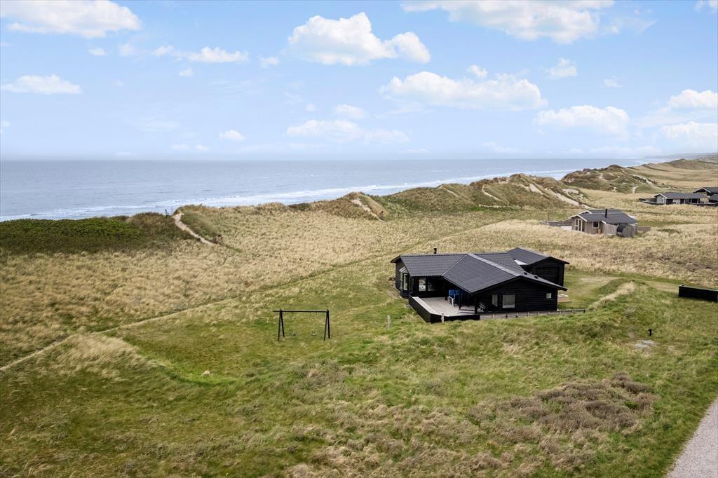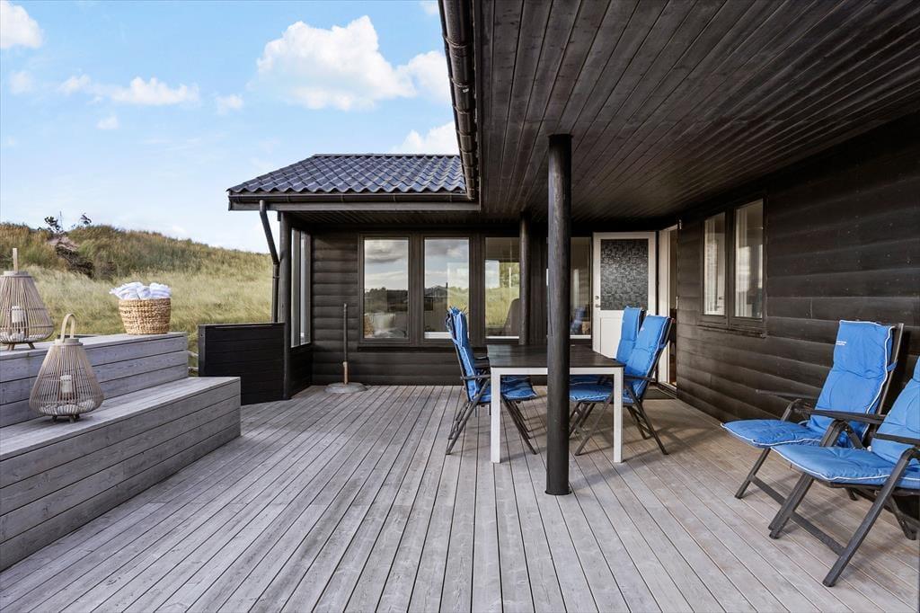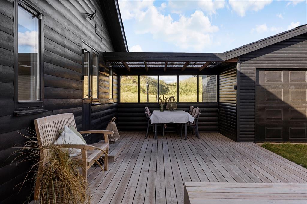 Den store naturgrund smelter på smukkeste vis sammen med det omkringliggende landskab, så I har virkelig fornemmelsen af at bo i klitterne. I forlængelse af terrassen er en mindre del af grunden skærmet af trådnet, hvilket hundeejerne måske især vil sætte pris på, mens børnefamilier kan glæde sig over gyngestativet. Den vestvendte og delvist overdækkede terrasse er helt lukket, og på den anden side af huset finder I endnu en skøn terrasse, der også har et åbent areal såvel som en overdækket lækrog.