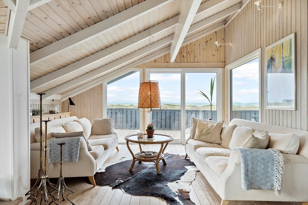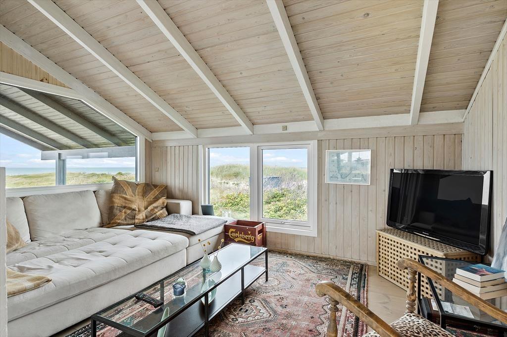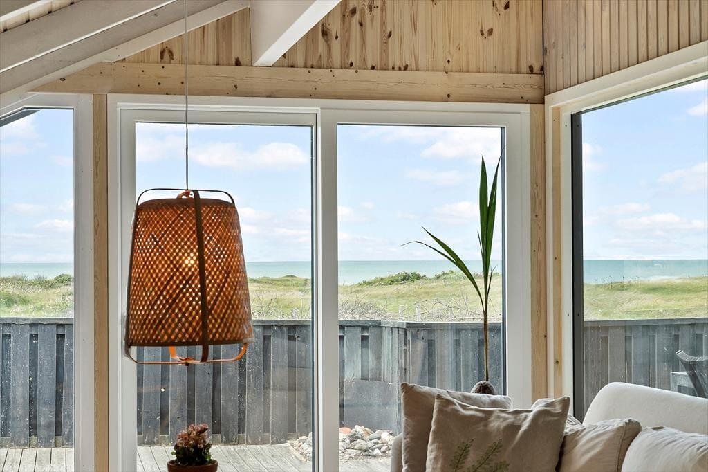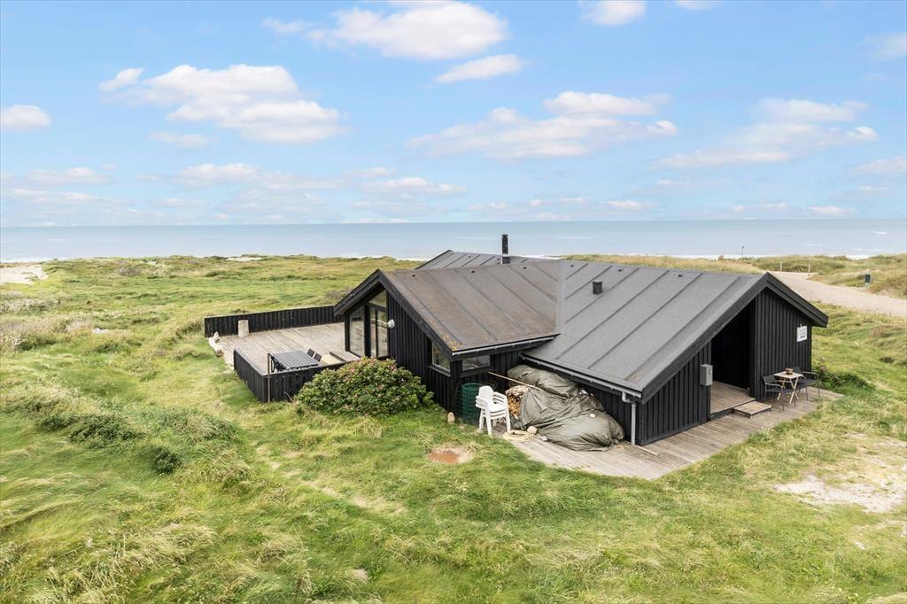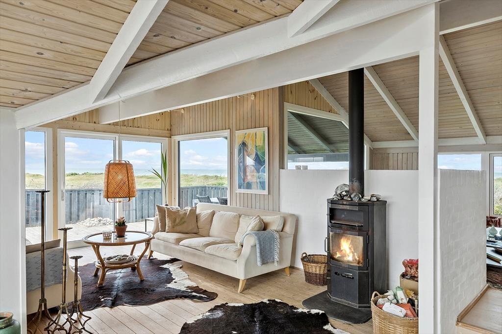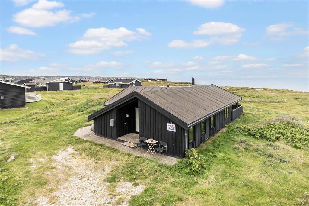Det 112 m2 store sommerhus har en hyggelig atmosfære og en fornuftig planløsning til syv personer. Hvis det er din drøm at tage den med ro og nyde ferielivet ved vandet, er huset det helt oplagte valg, for du har frit udsyn til Vesterhavet, når du slapper af i stuen, der er opdelt i flere afsnit. I 2024 er der kommer nye vinduer og døre i hele huset, så omgivelserne tager sig ekstra godt ud, og det er nemt at smutte ud i på terrassen fra stuen. Foretrækker du at blive inden døre, kan du vælge mellem to komfortable sofaafdelinger, hvoraf den ene er med brændeovn og den anden med fladskærms-tv. En hyggelig spiseplads ligger nær det åbne køkken, og planløsningen byder derudover på et gæstetoilet og et badeværelse med spabad og sauna. Soveværelser er der tre af, og det er derudover muligt at overnatte på hemsen.
