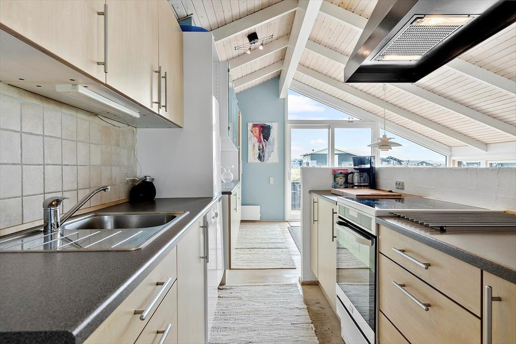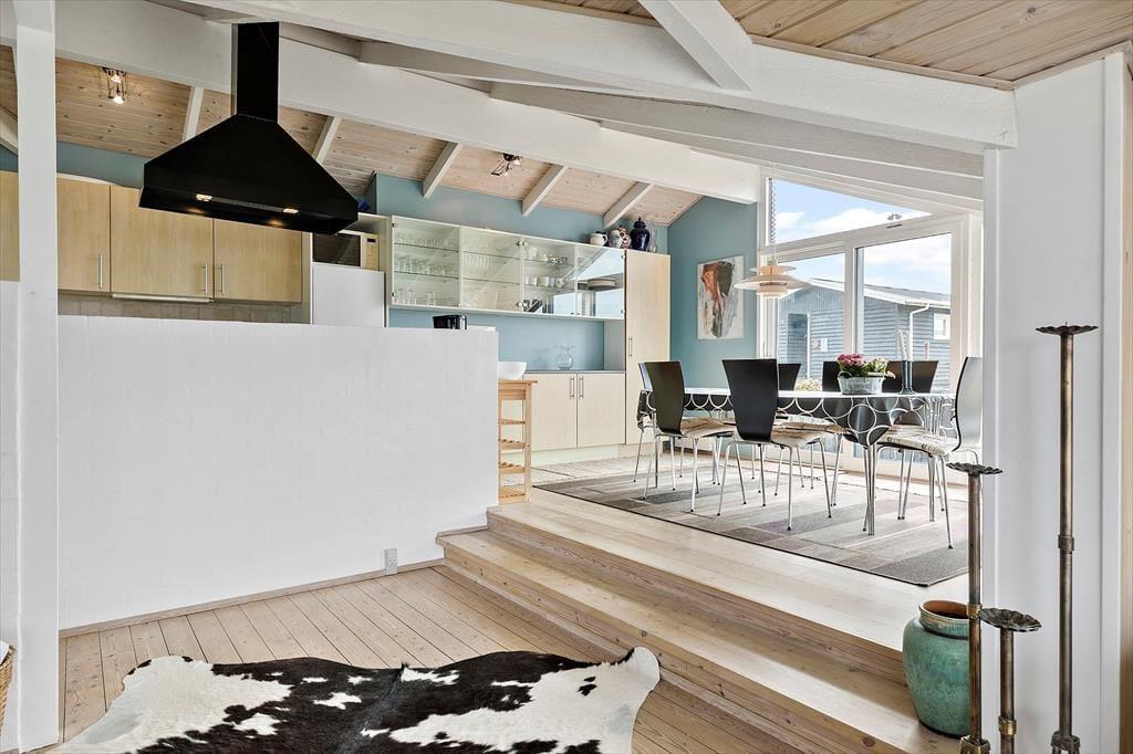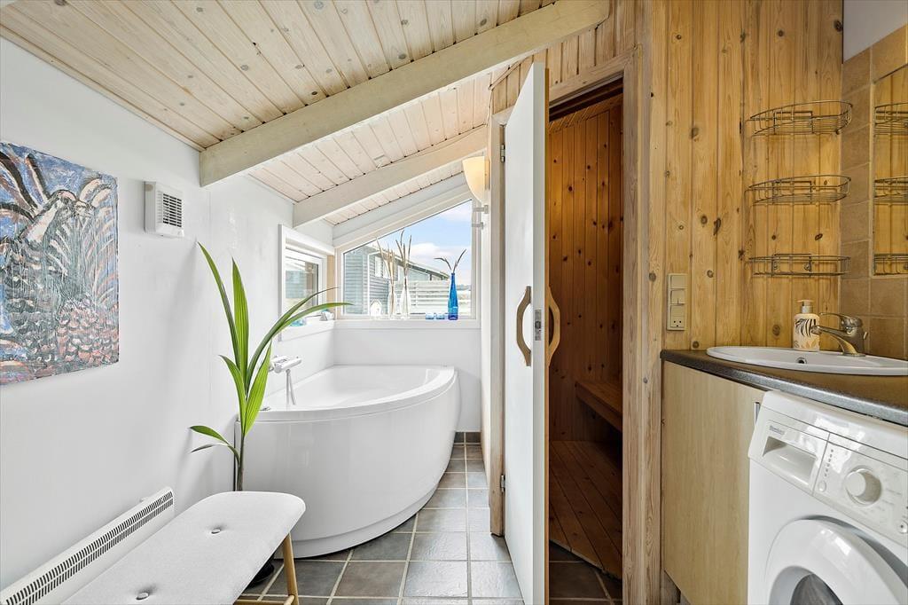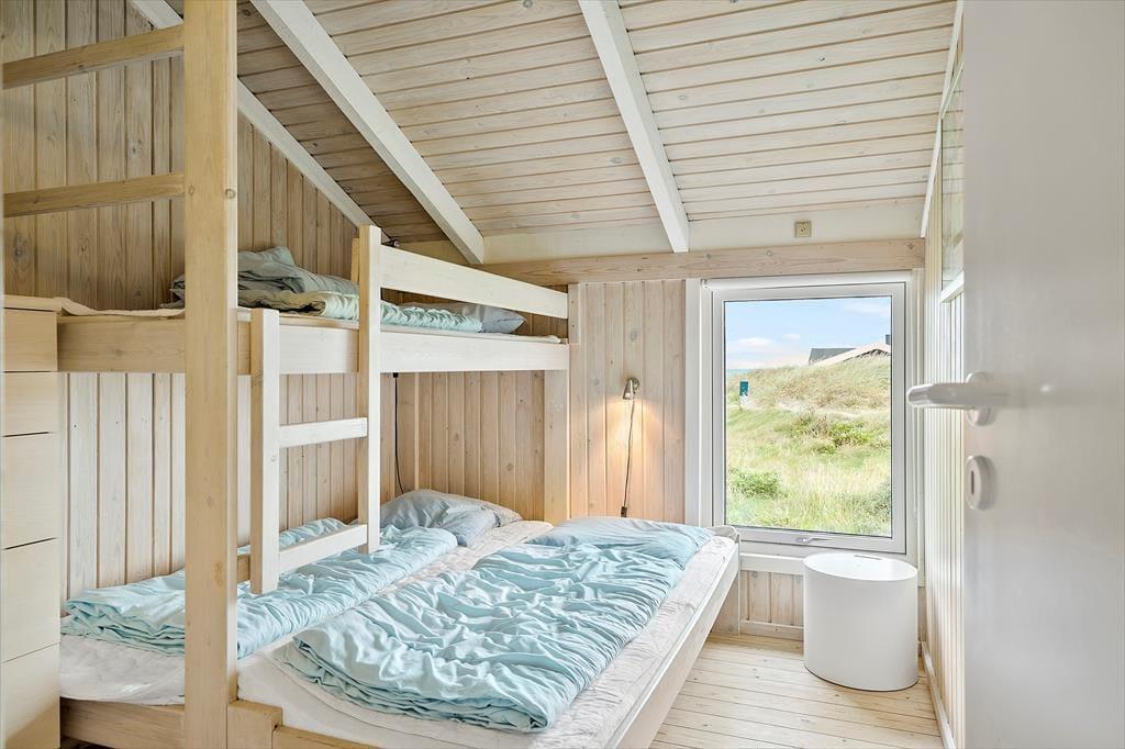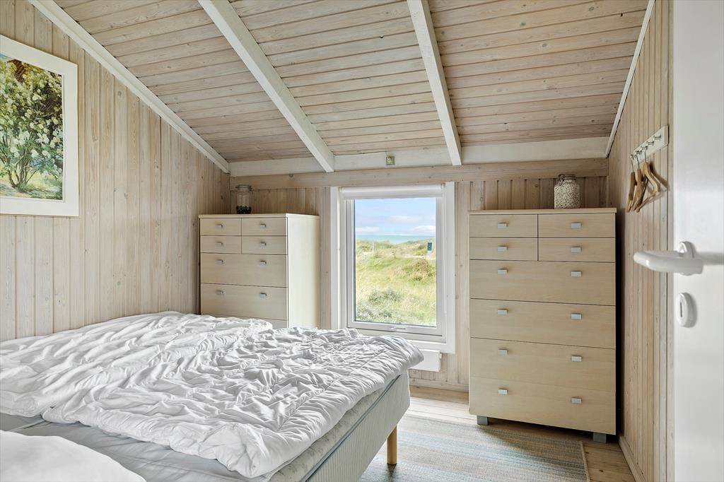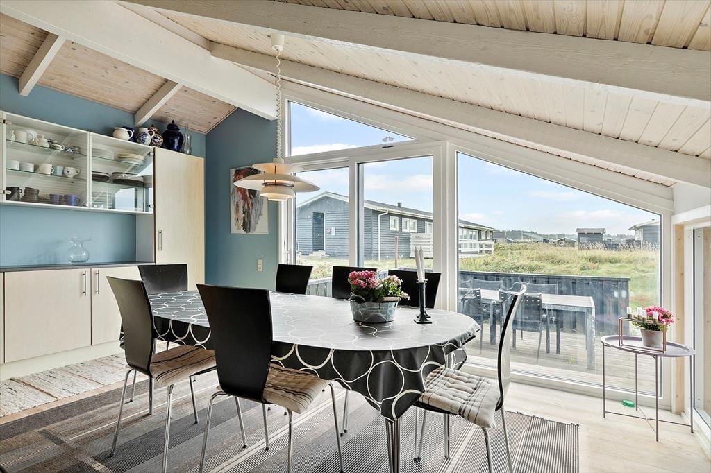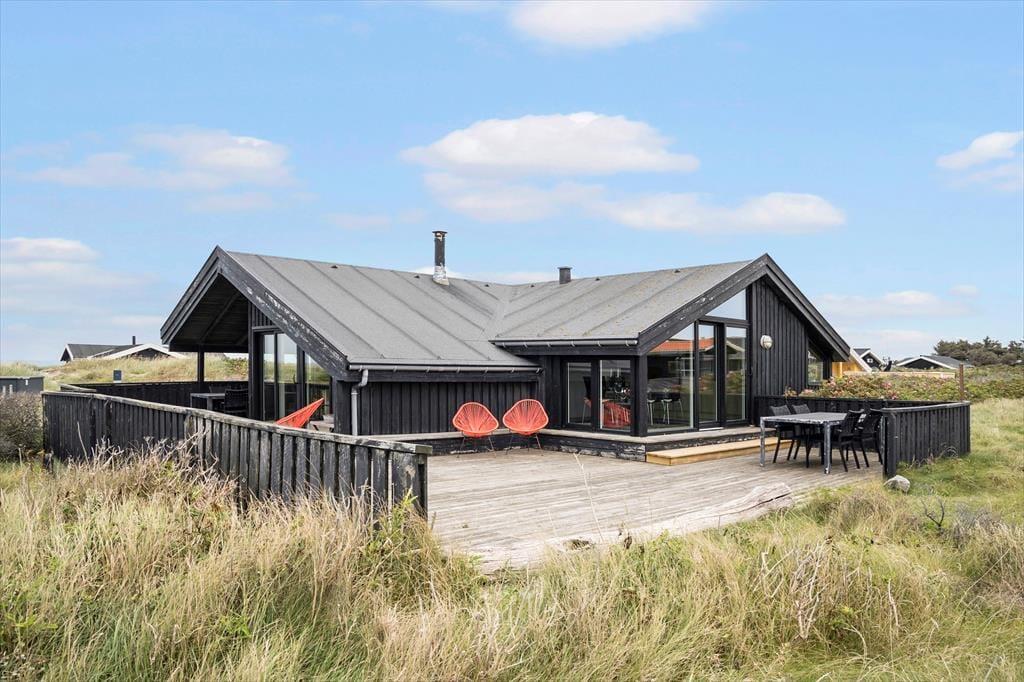 Det 112 m2 store sommerhus har en hyggelig atmosfære og en fornuftig planløsning til syv personer. Hvis det er din drøm at tage den med ro og nyde ferielivet ved vandet, er huset det helt oplagte valg, for du har frit udsyn til Vesterhavet, når du slapper af i stuen, der er opdelt i flere afsnit. I 2024 er der kommer nye vinduer og døre i hele huset, så omgivelserne tager sig ekstra godt ud, og det er nemt at smutte ud i på terrassen fra stuen. Foretrækker du at blive inden døre, kan du vælge mellem to komfortable sofaafdelinger, hvoraf den ene er med brændeovn og den anden med fladskærms-tv. En hyggelig spiseplads ligger nær det åbne køkken, og planløsningen byder derudover på et gæstetoilet og et badeværelse med spabad og sauna. Soveværelser er der tre af, og det er derudover muligt at overnatte på hemsen.