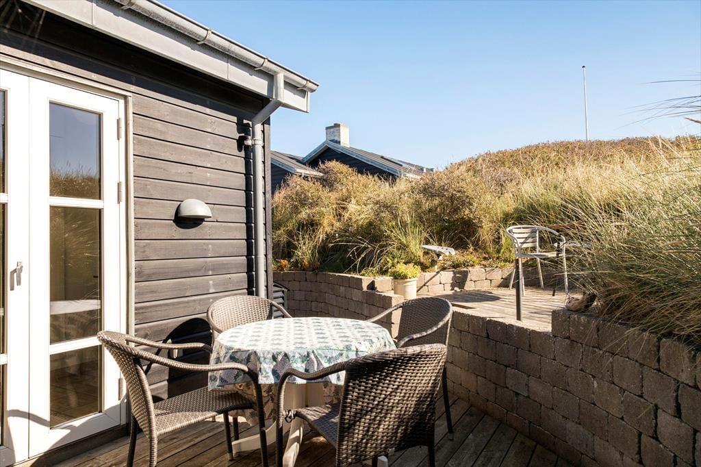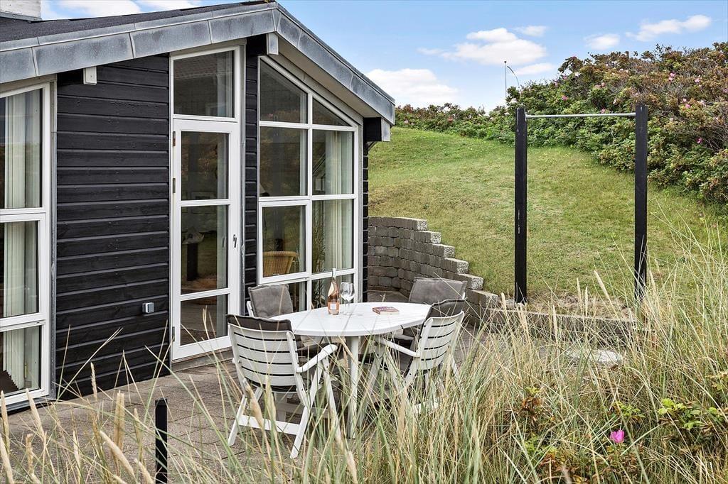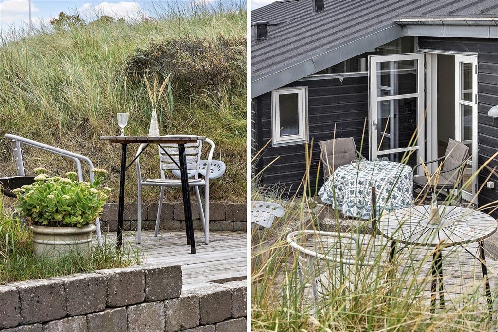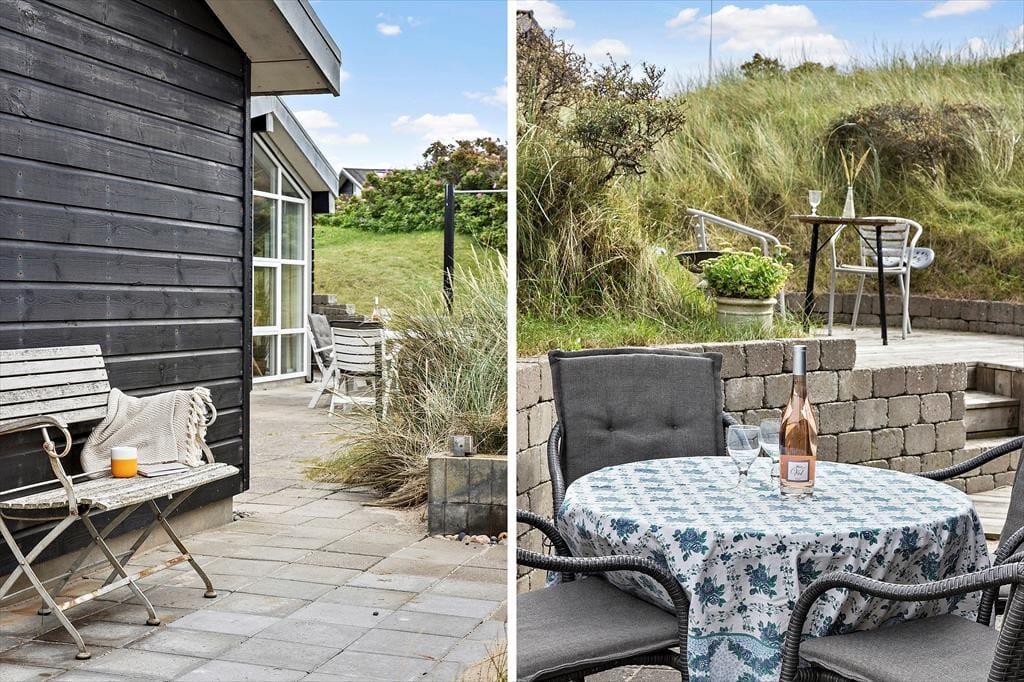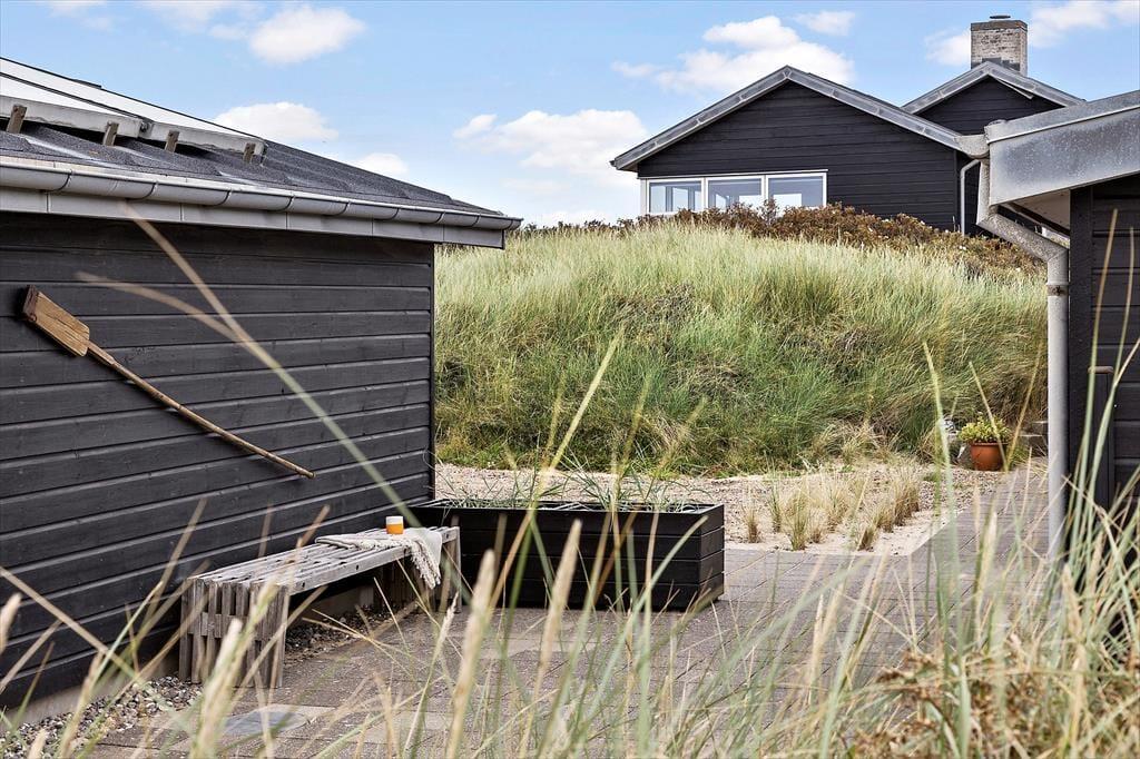 Sommerhuset er udstyret med flere terrassedøre, så det er nemt at komme ud i det fri, når solen skinner. Rundt om huset er der flere terrasser at vælge imellem – blandt andet en niveaudelt terrasse mod sydøst, der nærmest ligger som en lille gryde i klitterne. Det er også her, I finder den udendørs bruser, hvor I kan skylle sand og saltvand af, når I vender hjem fra badeturen.