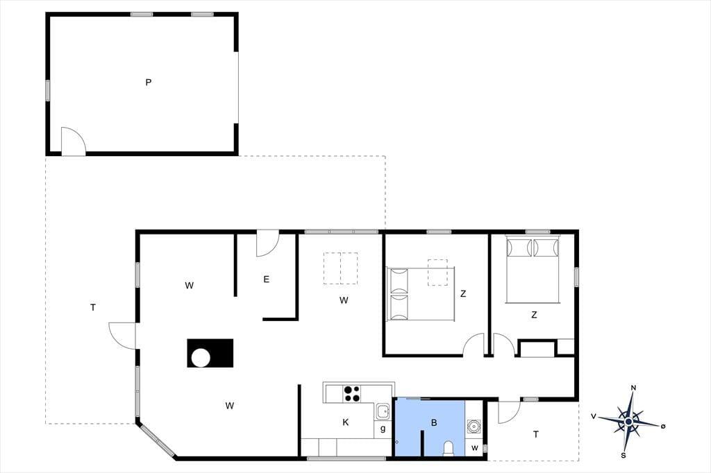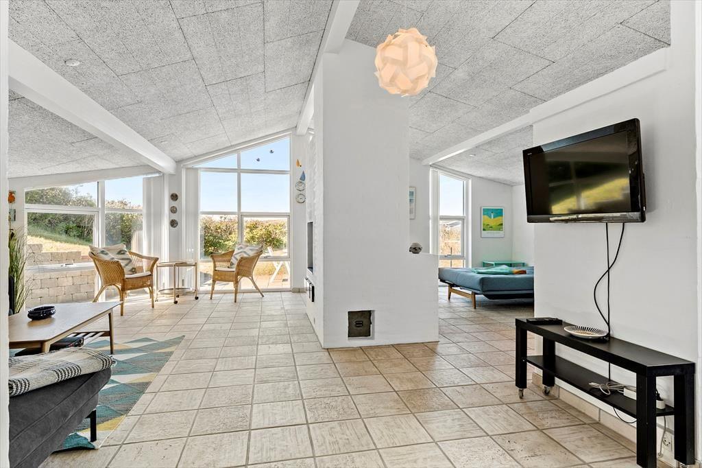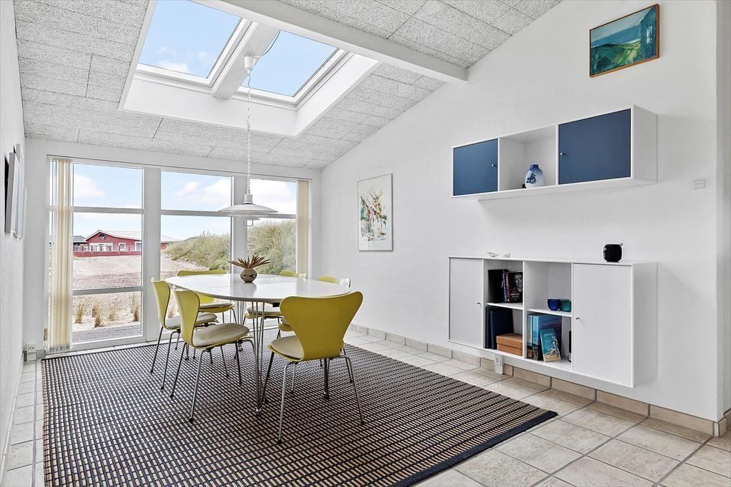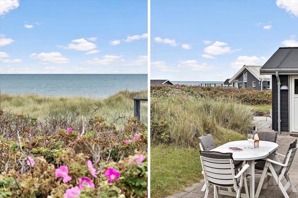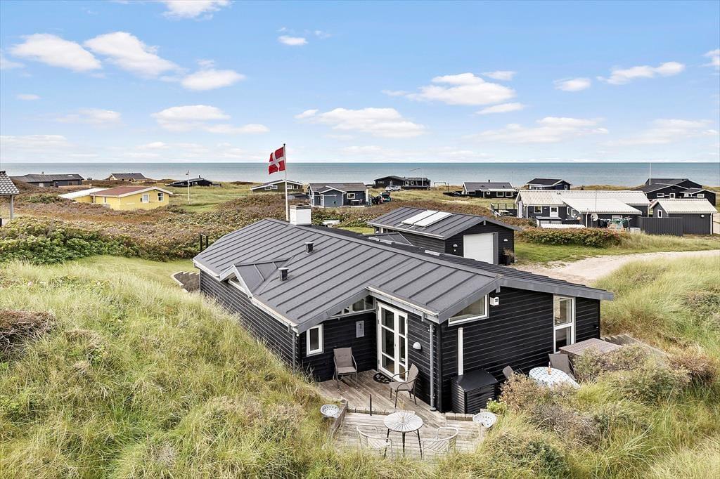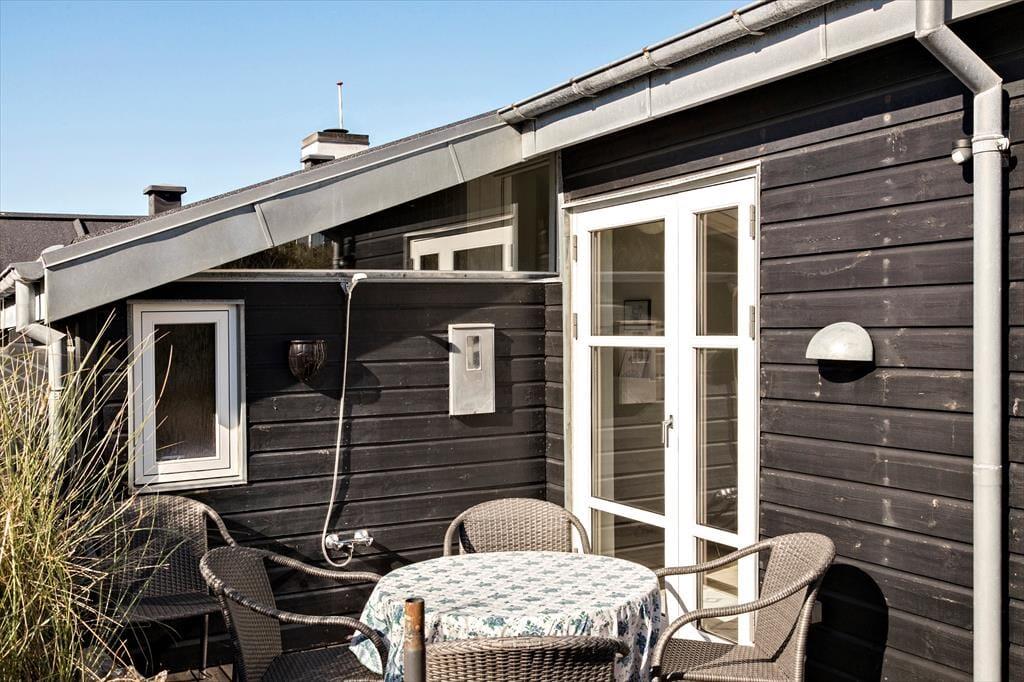 Sommerhuset er udstyret med flere terrassedøre, så det er nemt at komme ud i det fri, når solen skinner. Rundt om huset er der flere terrasser at vælge imellem – blandt andet en niveaudelt terrasse mod sydøst, der nærmest ligger som en lille gryde i klitterne. Det er også her, I finder den udendørs bruser, hvor I kan skylle sand og saltvand af, når I vender hjem fra badeturen.