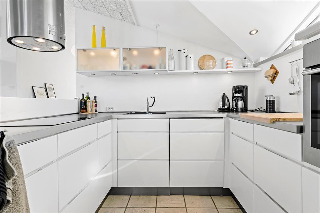 Atmosfæren er lys og behagelig inden døre i huset, der måler 118 m2 og er fuld af pænt møblement og mange flotte detaljer. To soveværelser, begge med dobbeltseng, ligger side om side i den ene ende af huset nær et badeværelse med bruser og vaskemaskine. I den anden ende har I opholdsafdelingen, hvor en sovesofa er godt placeret lidt for sig. Opholdsafdelingen byder desuden på en hyggelig sofakrog og et spisebord, der står lige under et stort ovenlysvindue – og et moderne og veludstyret køkken er også del af den åbne planløsning.