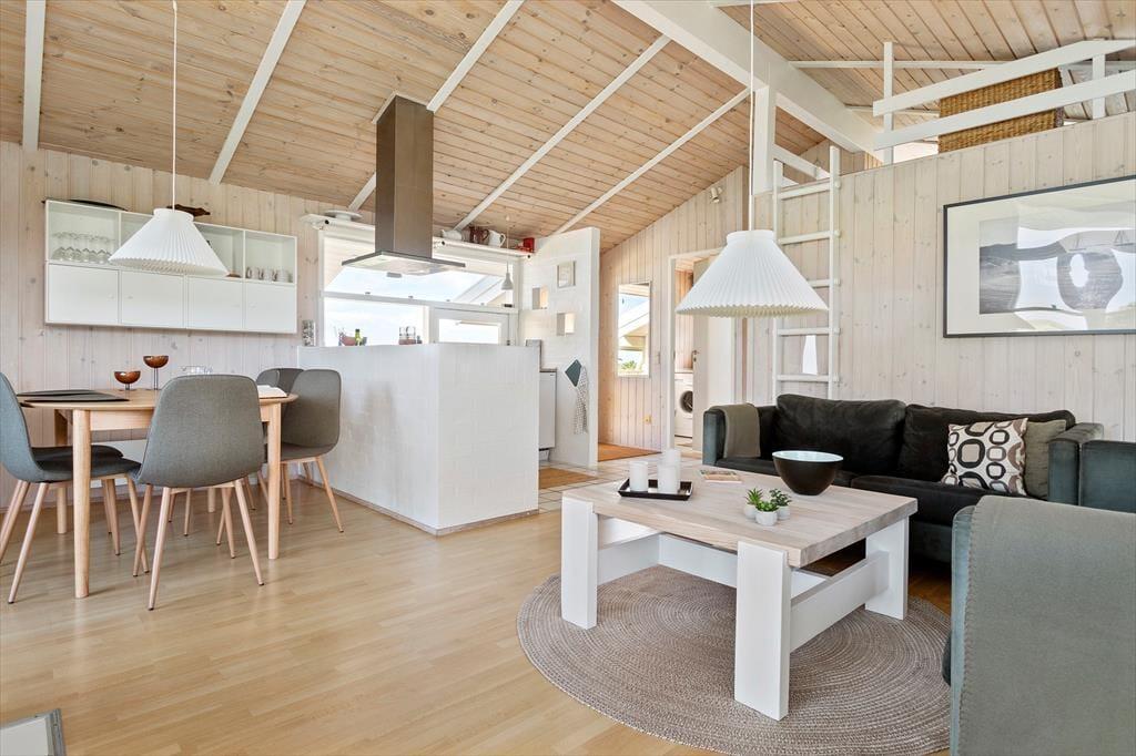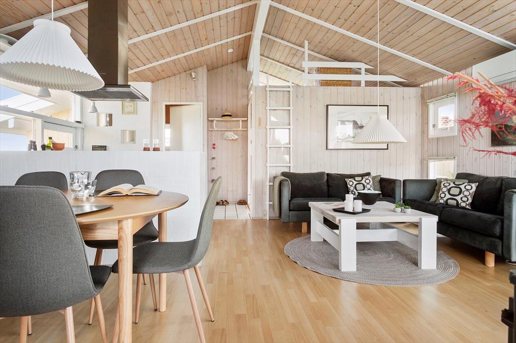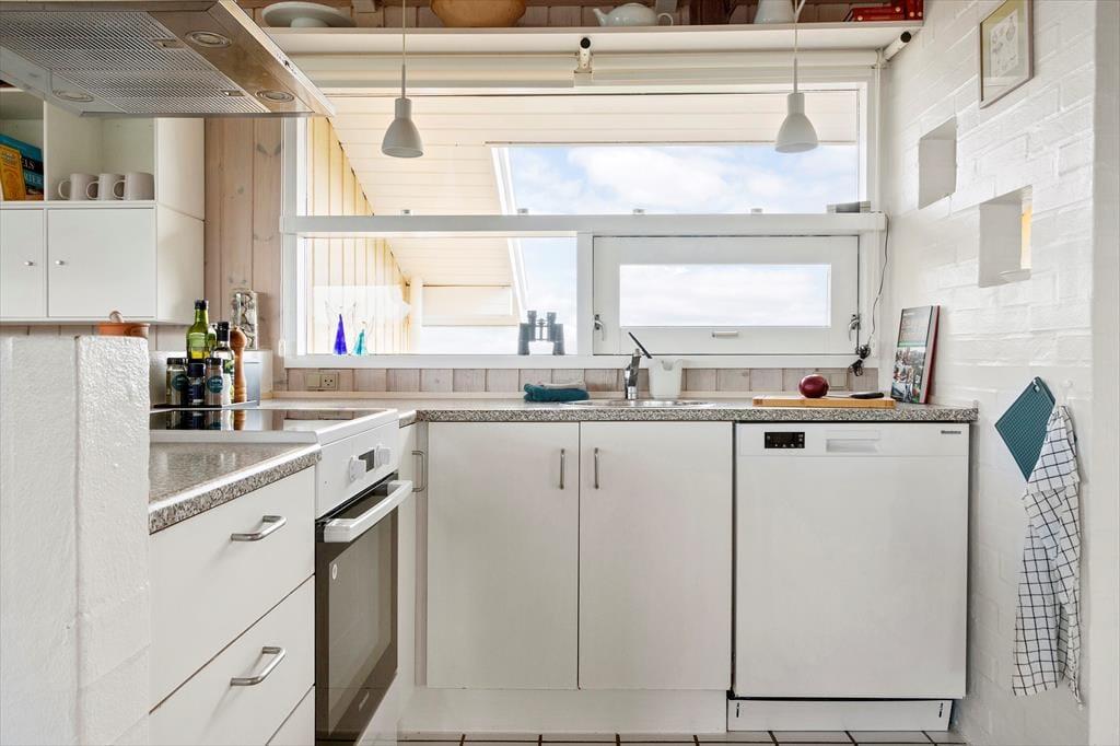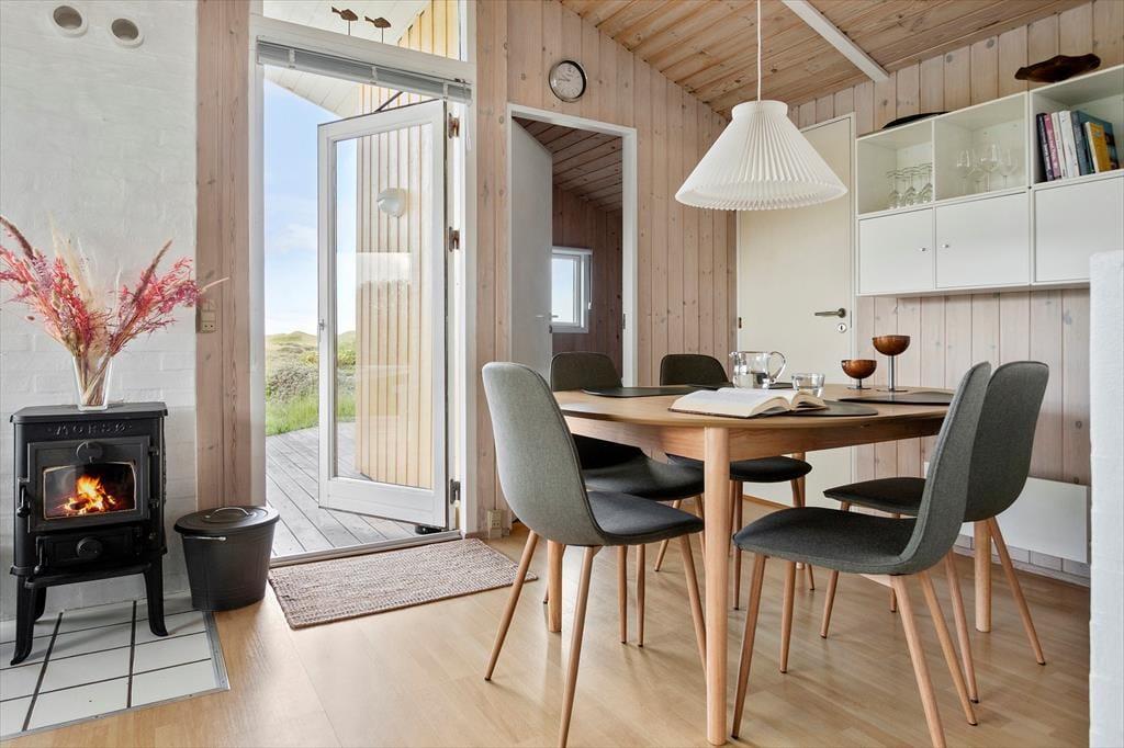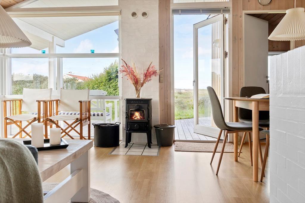 Når du træder indenfor, kan du straks føle dig hjemme i de kønne og stemningsfulde rum. Den åbne forbindelse mellem stue og køkken sørger for, at du og dine kære har god plads til at være sammen, uanset om I hygger jer med madlavningen eller sidder med brætspil og gode bøger nær den knitrende brændeovn. I løbet af dagen inviteres solen ind i opholdsrummet fra tre verdenshjørner, og vinduerne giver udsigt til de naturskønne omgivelser. Også fra et af de tre soveværelser kan du se lige ud på Nørlev Strands klitrække, når du slår øjnene op om morgenen.