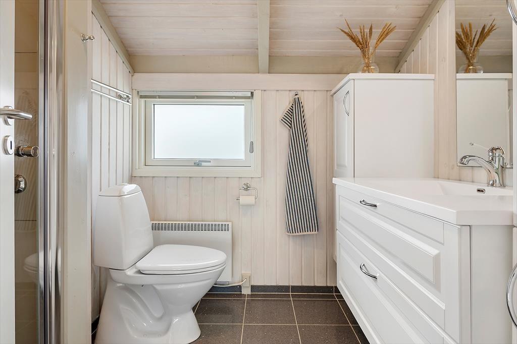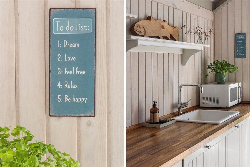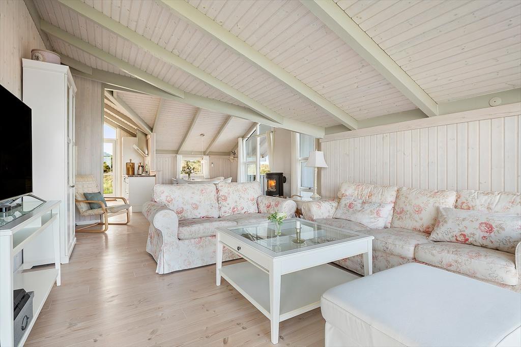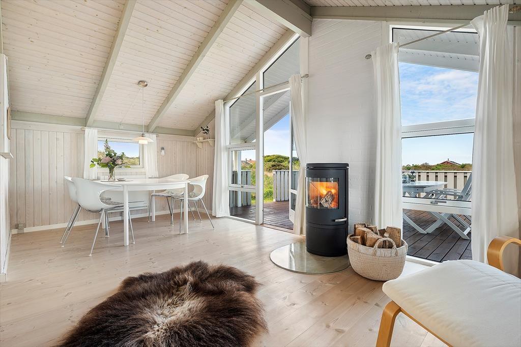 Når du træder ind i sommerhuset, bliver du mødt af en lys og indbydende atmosfære. Indretningen emmer af hygge og varme, og huset er omhyggeligt vedligeholdt med øje for både funktion og charme. Stuen er udstyret med en brændeovn, der spreder varme og stemning – perfekt til en rolig aften med en god bog eller et spil. De store vinduer lukker masser af dagslys ind og giver en dejlig fornemmelse af naturen helt tæt på.