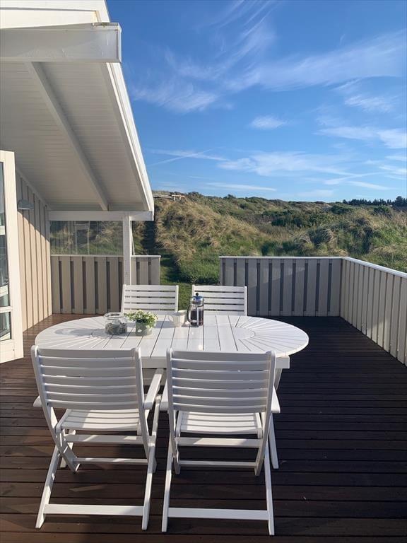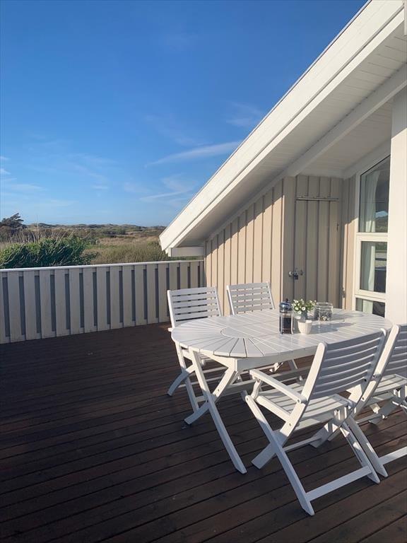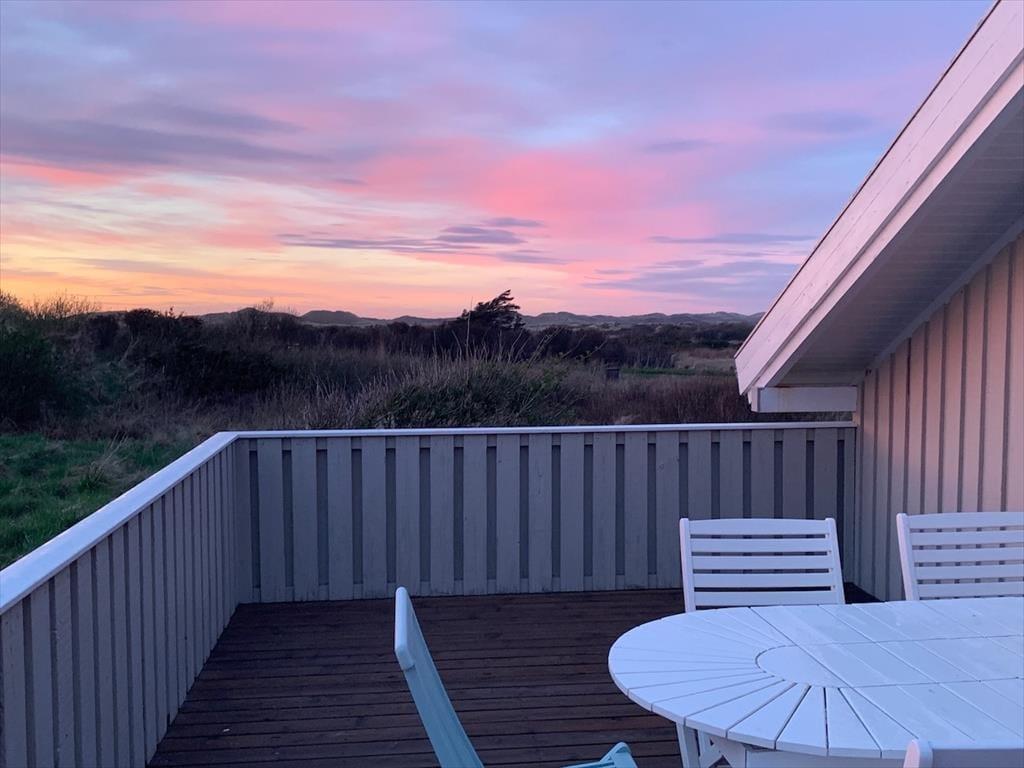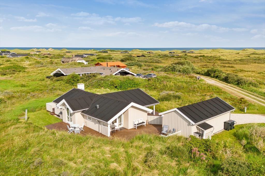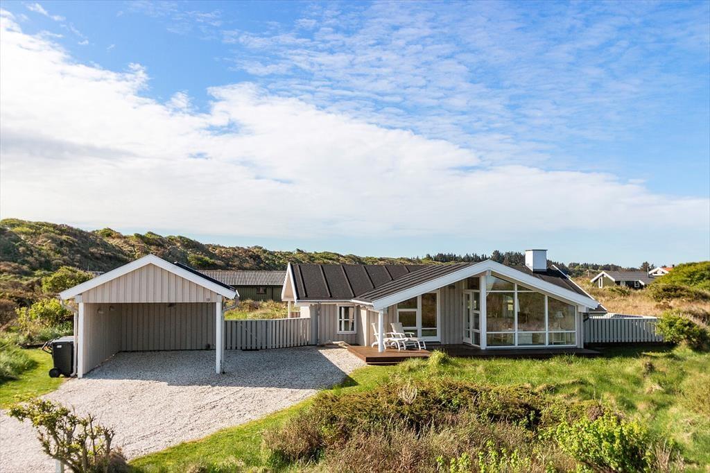 Udenfor venter en skøn naturgrund, der indbyder til ro og fordybelse. Herfra er der en smuk udsigt ud over det fredede areal, som omkranser sommerhuset og giver en sjælden følelse af privatliv og nærvær med naturen. På en lille bakke på grunden finder du en hyggelig bænk – det perfekte sted at nyde en kop kaffe eller et glas vin, mens du ser ud over klitterne og havkigget i horisonten. Solnedgangene her er noget helt særligt og forvandler aftenen til et smukt og fredfyldt øjeblik. Og som prikken over i’et kan du næsten dagligt opleve rådyr, der roligt krydser grunden – en lille, magisk påmindelse om, hvor tæt du er på naturen.