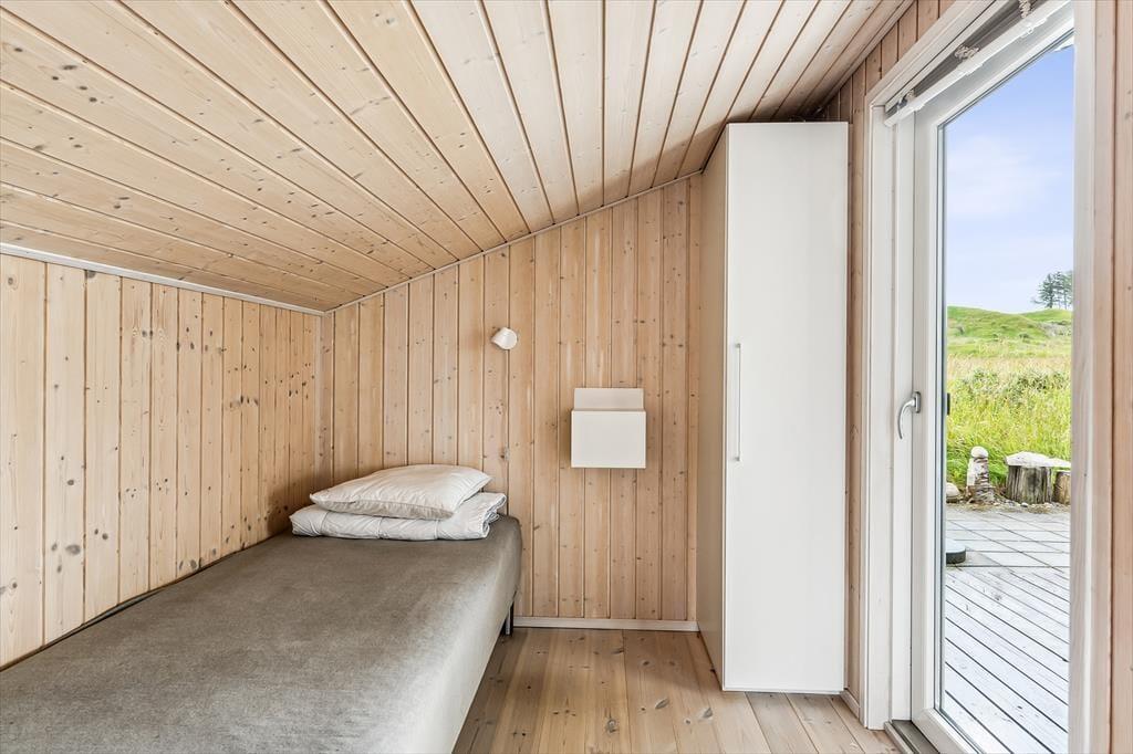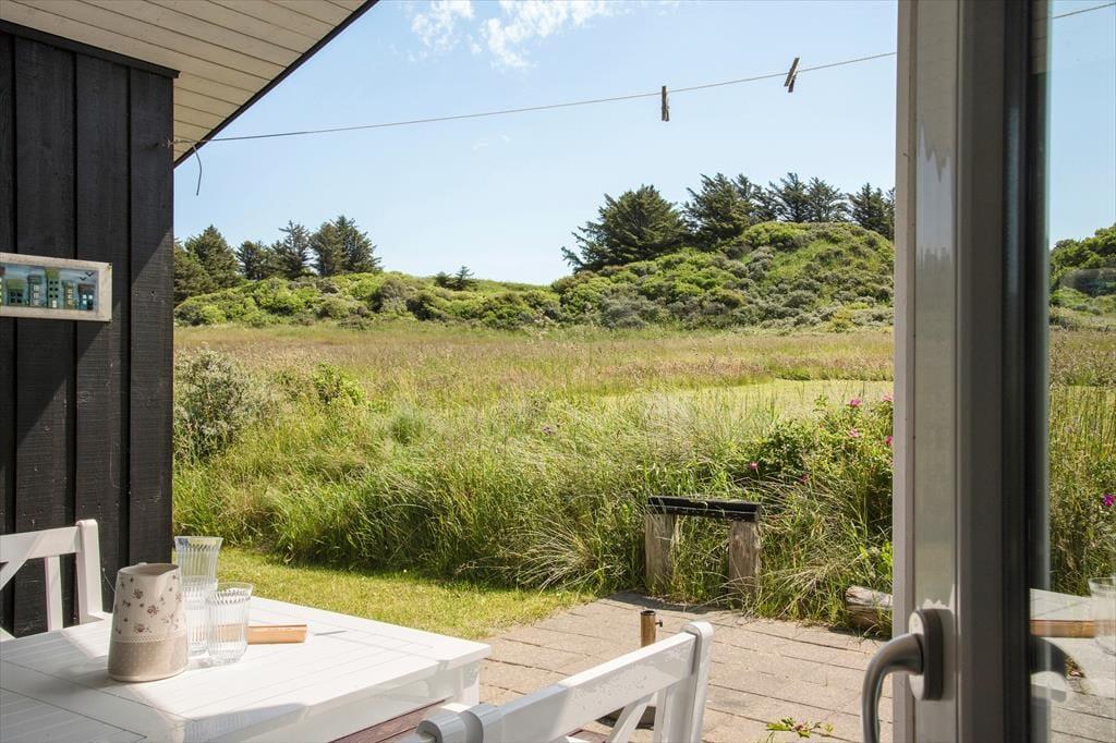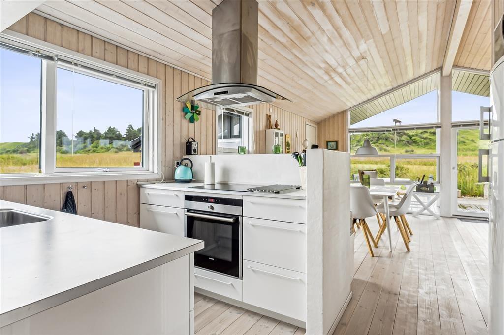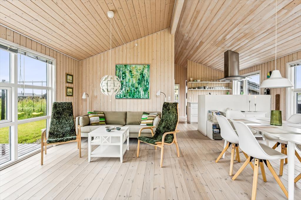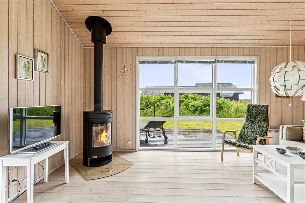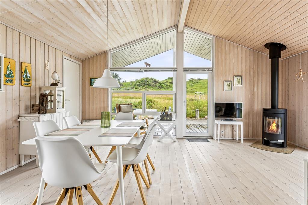 Når du træder ind i sommerhuset, mødes du af en lys og luftig indretning med loft til kip, som giver rummet en dejlig rummelighed. De store vinduer lukker naturen og lyset ind og giver en fantastisk udsigt til de omkringliggende indlandsklitter. Det åbne opholdsområde er perfekt til både afslapning og samvær, hvor du kan slappe af foran den hyggelige brændeovn eller nyde et måltid, mens du kigger ud på den smukke natur. Den enkle, lyse indretning giver en rolig og afslappet atmosfære, der indbyder til både hygge og fordybelse.