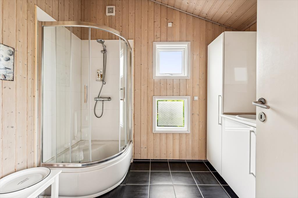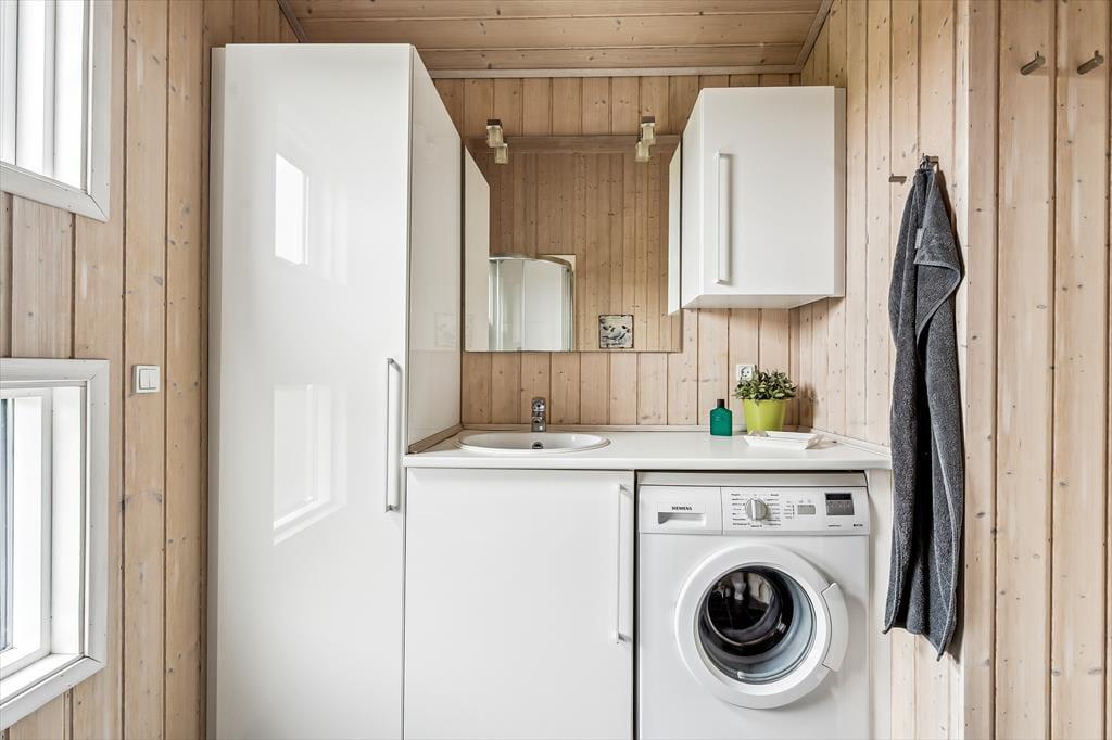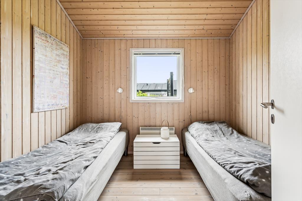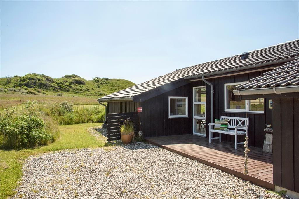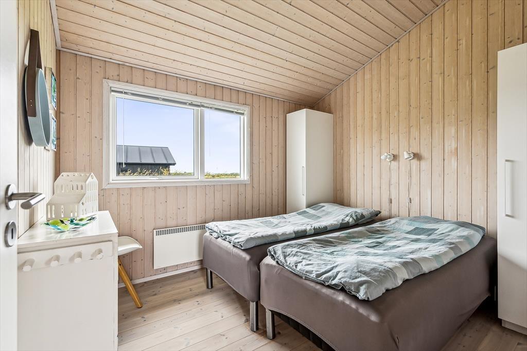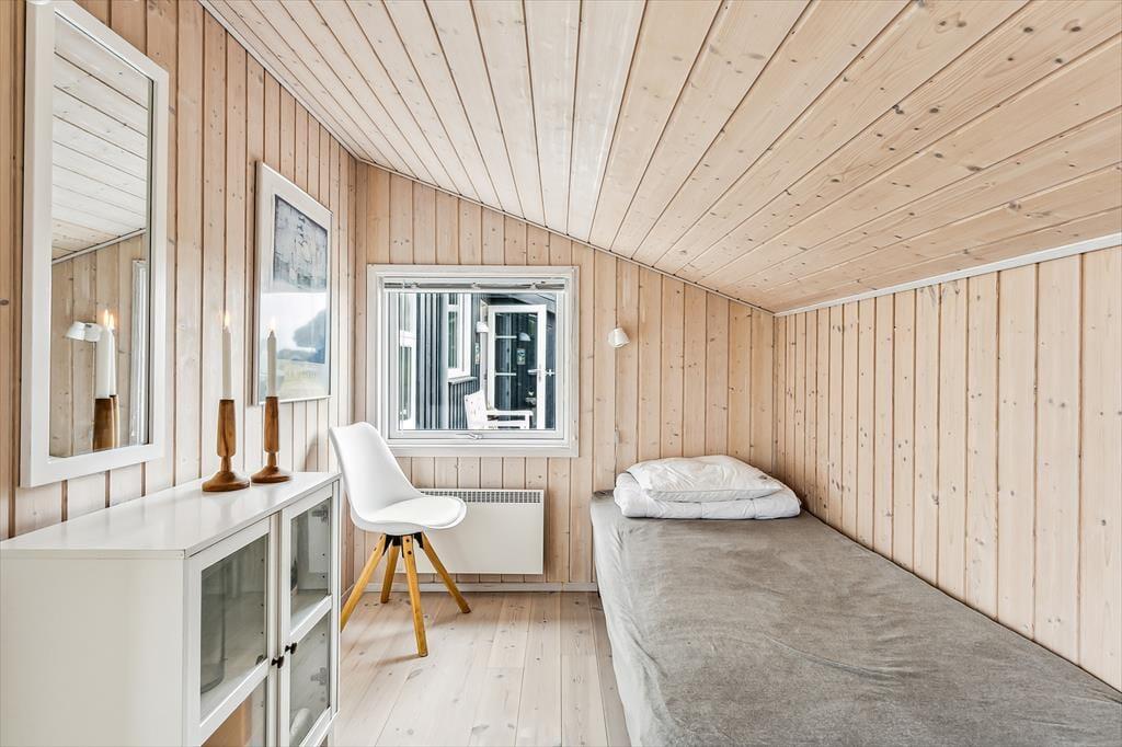 Når du træder ind i sommerhuset, mødes du af en lys og luftig indretning med loft til kip, som giver rummet en dejlig rummelighed. De store vinduer lukker naturen og lyset ind og giver en fantastisk udsigt til de omkringliggende indlandsklitter. Det åbne opholdsområde er perfekt til både afslapning og samvær, hvor du kan slappe af foran den hyggelige brændeovn eller nyde et måltid, mens du kigger ud på den smukke natur. Den enkle, lyse indretning giver en rolig og afslappet atmosfære, der indbyder til både hygge og fordybelse.