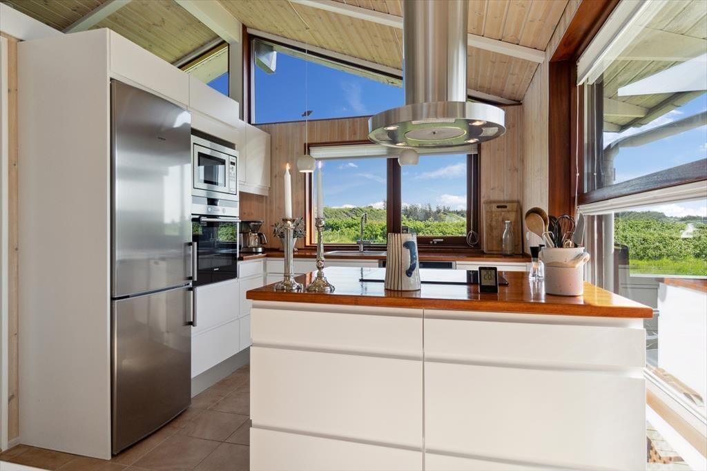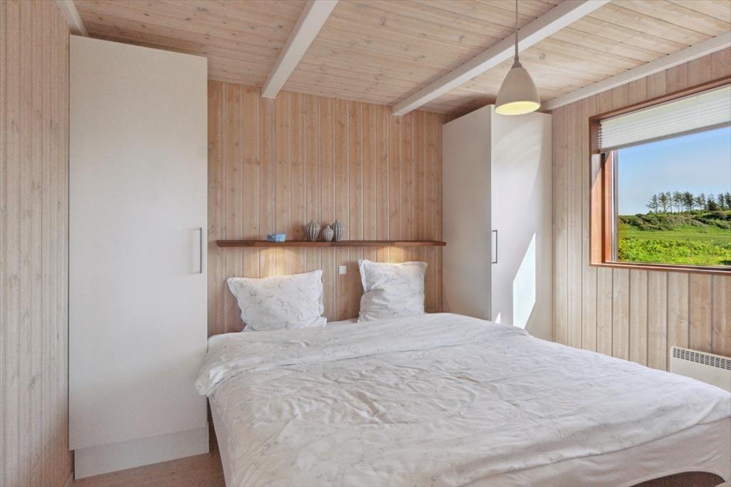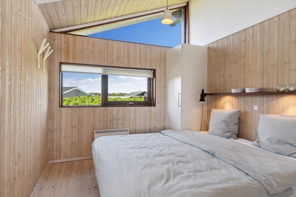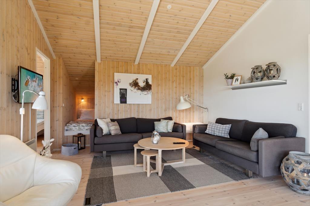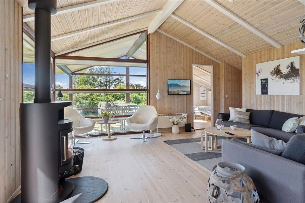 Sommerhuset er både rummeligt og hyggeligt indrettet med lyse trævægge og loft til kip, der giver en behagelig atmosfære. Stuen og køkkenet ligger i åben forbindelse, så du kan nyde nærværet, mens der laves mad, spilles brætspil ved spisebordet eller slappes af i sofaen. De store vinduespartier sørger for et flot lysindfald og lader dig beundre udsigten til det kuperede landskab. Brændeovnen skruer op for hyggen på kølige dage, og de komfortable møbler indbyder til afslapning. Soveværelserne er indrettet med gode senge og en rolig atmosfære, der gør det nemt at lade op til en ny dag ved havet.