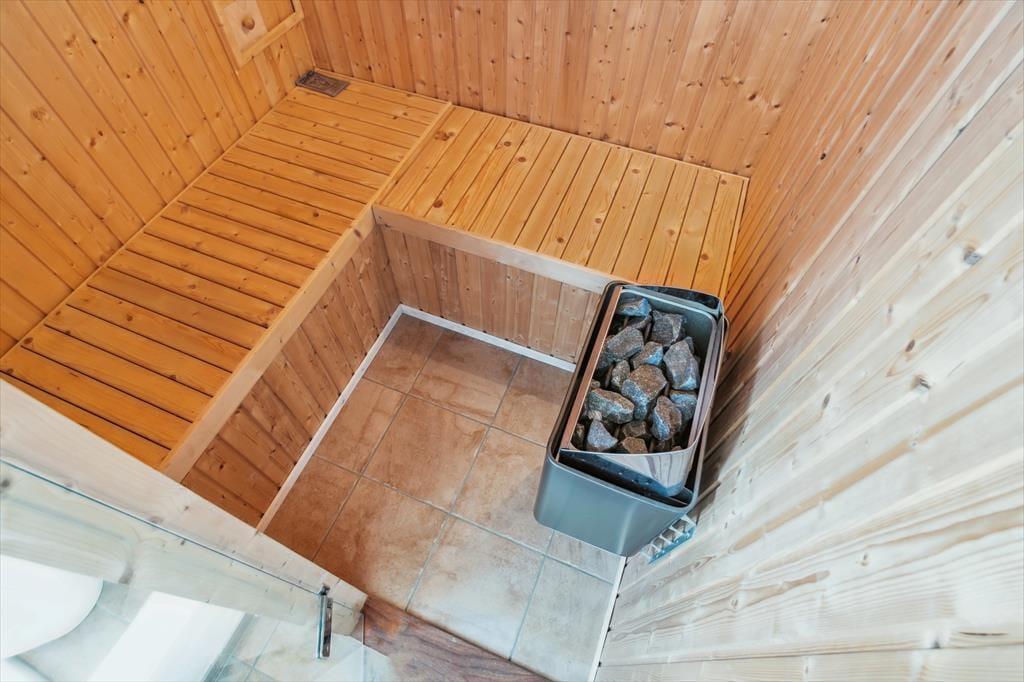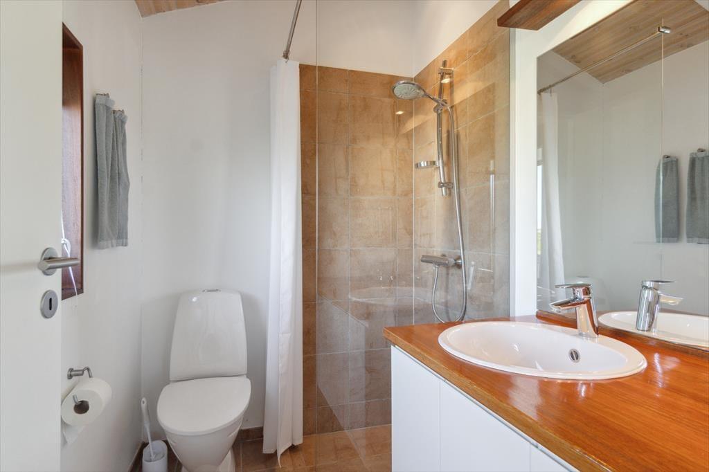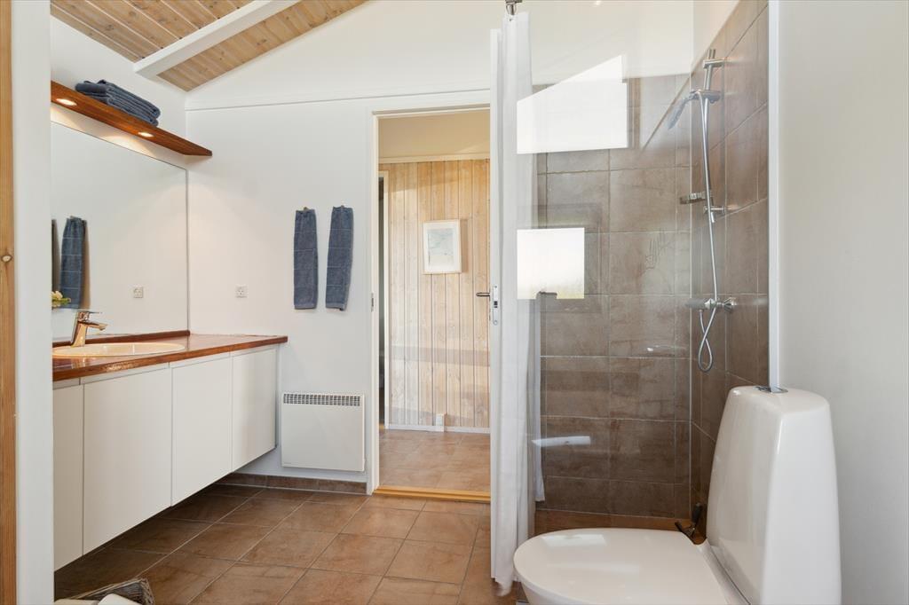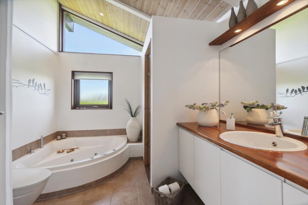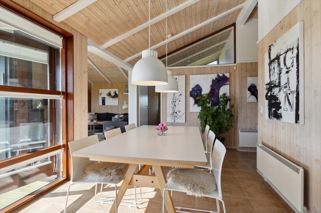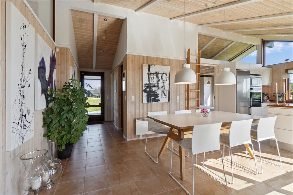 Sommerhuset er både rummeligt og hyggeligt indrettet med lyse trævægge og loft til kip, der giver en behagelig atmosfære. Stuen og køkkenet ligger i åben forbindelse, så du kan nyde nærværet, mens der laves mad, spilles brætspil ved spisebordet eller slappes af i sofaen. De store vinduespartier sørger for et flot lysindfald og lader dig beundre udsigten til det kuperede landskab. Brændeovnen skruer op for hyggen på kølige dage, og de komfortable møbler indbyder til afslapning. Soveværelserne er indrettet med gode senge og en rolig atmosfære, der gør det nemt at lade op til en ny dag ved havet.