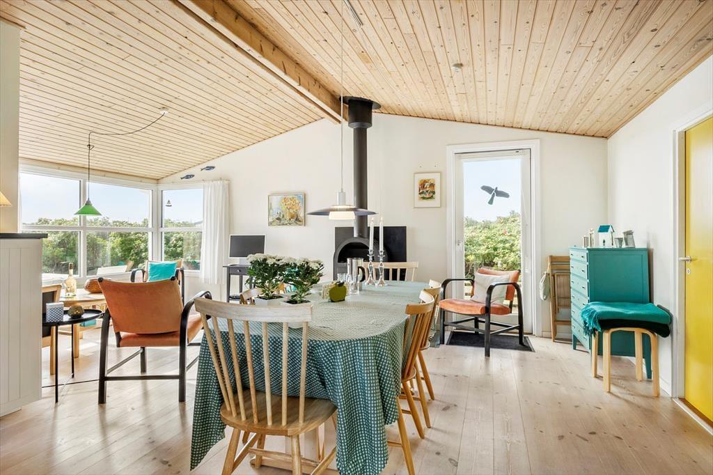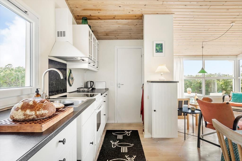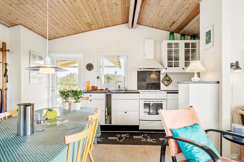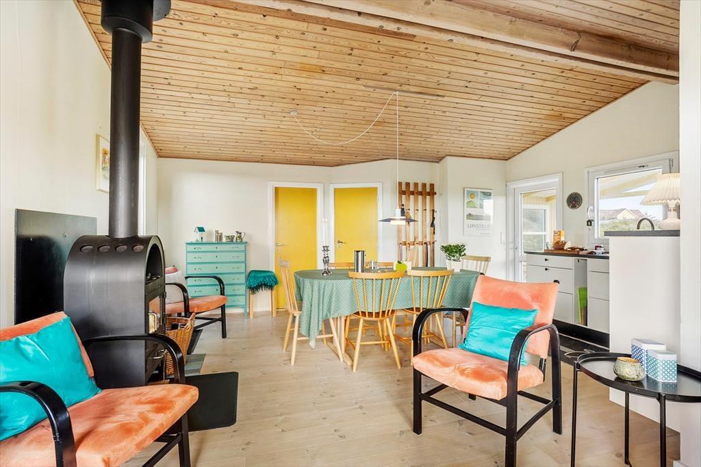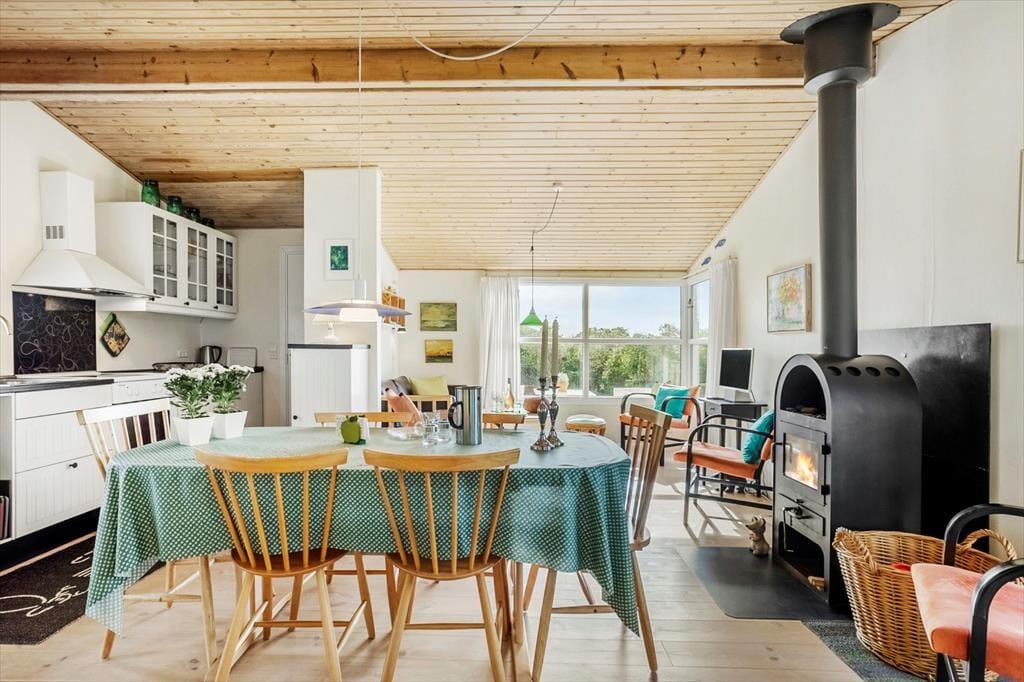 Inde i sommerhuset mødes du af en lys og venlig stemning, hvor loft til kip og den gennemførte træbeklædning giver en rummelig og luftig fornemmelse. Stuen og køkkenet ligger i åben forbindelse, så det er nemt at være sammen om både madlavning, brætspil eller afslapning. Brændeovnen er placeret centralt, og når flammerne knitrer bag ruden, breder varmen og hyggen sig i hele opholdsrummet. Indretningen er personlig og indbydende, og her er lagt vægt på, at du straks skal føle dig hjemme. Det er nemt at forestille sig en kølig efterårsdag, hvor regnen trommer let mod ruden, og du sidder i sofaen med en kop varm kakao, mens ilden buldrer i baggrunden.