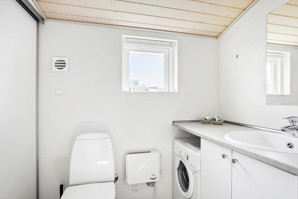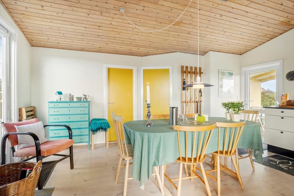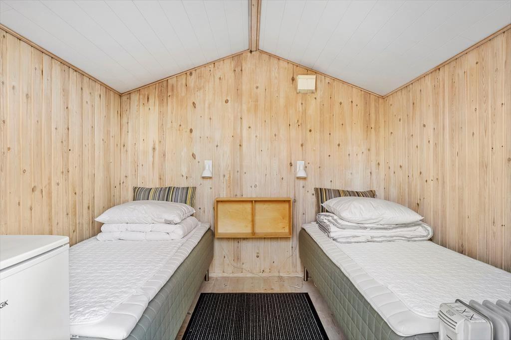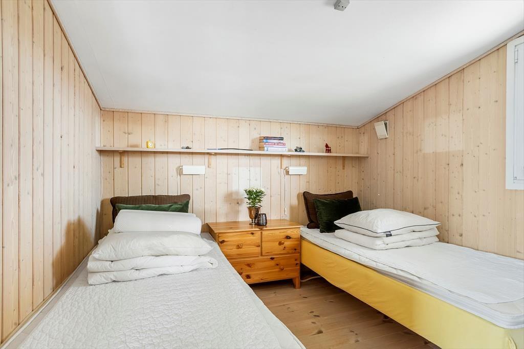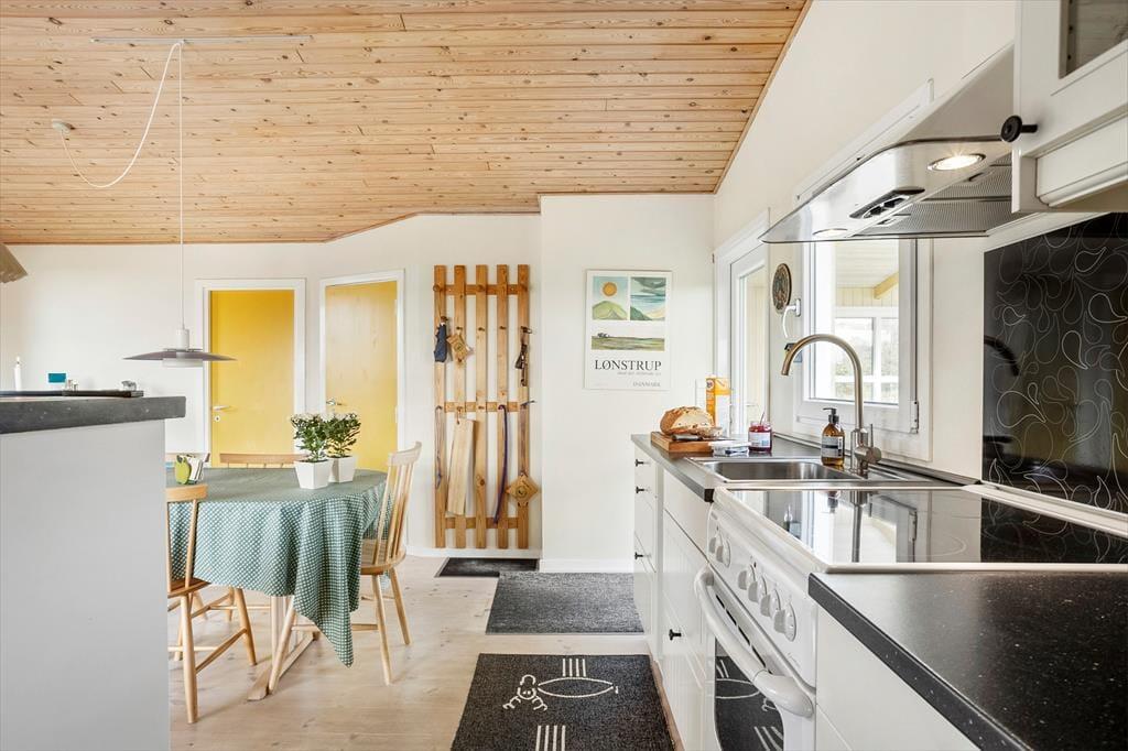 Inde i sommerhuset mødes du af en lys og venlig stemning, hvor loft til kip og den gennemførte træbeklædning giver en rummelig og luftig fornemmelse. Stuen og køkkenet ligger i åben forbindelse, så det er nemt at være sammen om både madlavning, brætspil eller afslapning. Brændeovnen er placeret centralt, og når flammerne knitrer bag ruden, breder varmen og hyggen sig i hele opholdsrummet. Indretningen er personlig og indbydende, og her er lagt vægt på, at du straks skal føle dig hjemme. Det er nemt at forestille sig en kølig efterårsdag, hvor regnen trommer let mod ruden, og du sidder i sofaen med en kop varm kakao, mens ilden buldrer i baggrunden.