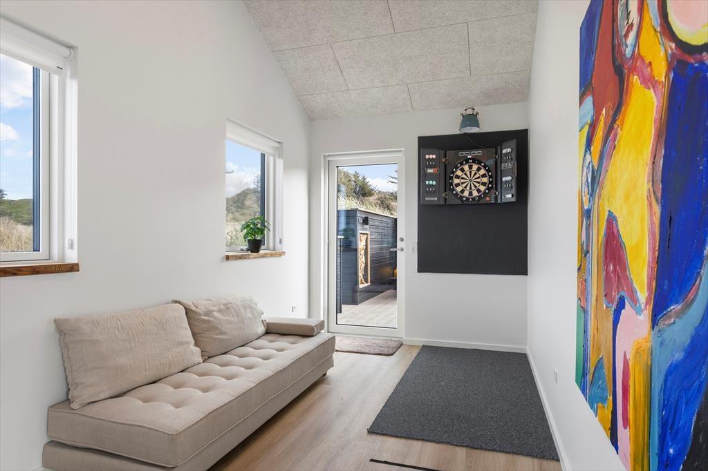 Sommerhuset ligger fredeligt i det populære sommerhusområde ved Nørlev Strand, hvor naturen er hovedattraktionen. Her er du omgivet af høje klitter, brede naturstier og kun en kort gåtur fra Vesterhavets uendelige kystlinje. Lyden af havets brusen er en konstant og beroligende lydkulisse, og stranden lokker både til lange gåture og forfriskende dukkerter. Vil du opleve mere, ligger den charmerende ferieby Lønstrup kun få minutter væk i bil. Her kan du besøge gallerier og kunsthåndværkere, spise godt på alt fra hyggelige caféer til den anmelderroste Villa Vest – og lade dig inspirere af det særlige lys og den kreative stemning, der præger området. Rejser du med børn eller bare gerne vil forkæle dig selv med wellness, er Skallerup Seaside Resort med badeland og Romulus-spa også inden for rækkevidde. Med base på Klittjørnen 11 har du det hele lige i nærheden – uden at give køb på privatliv og fred.