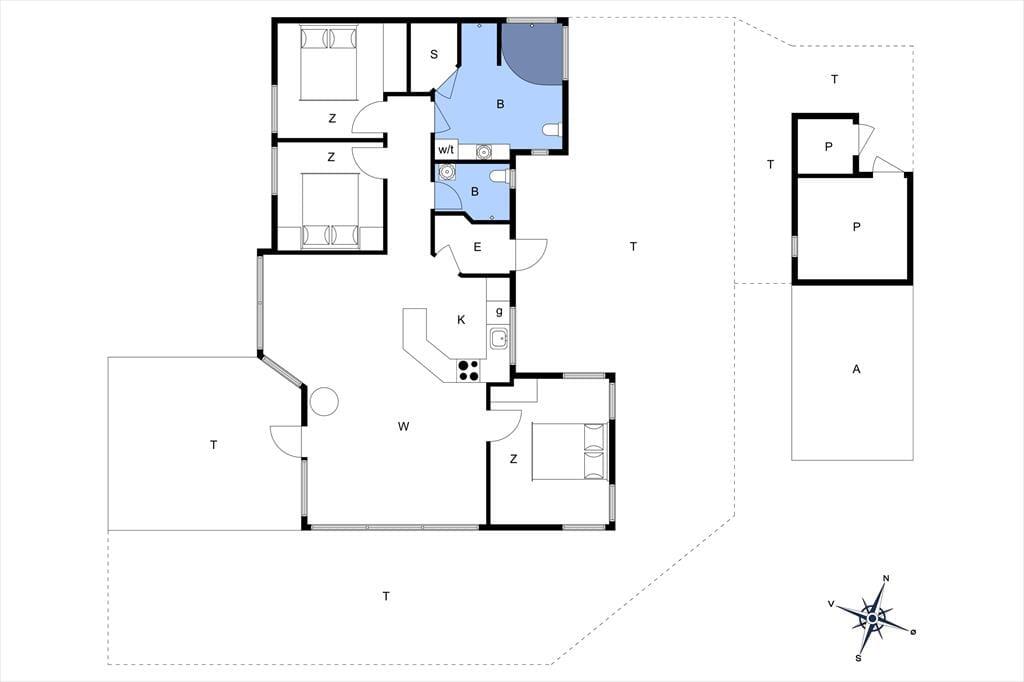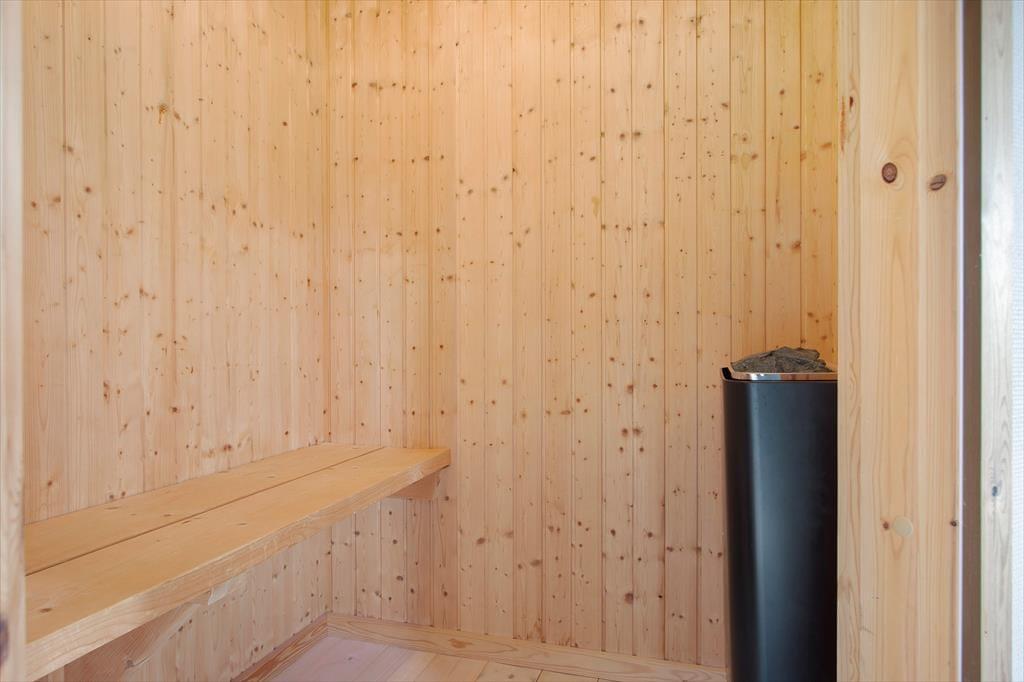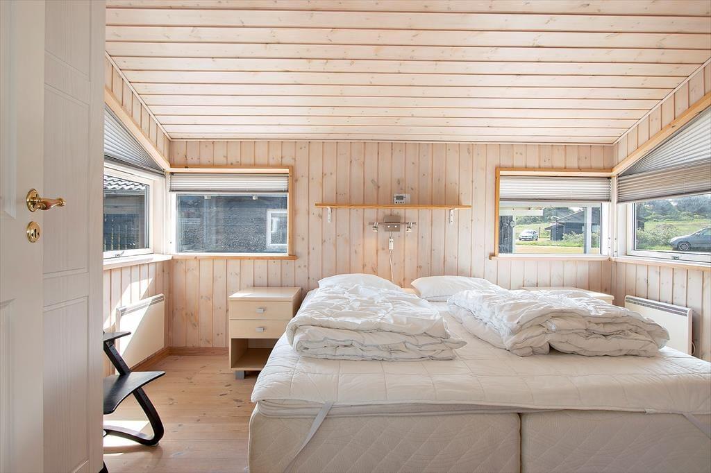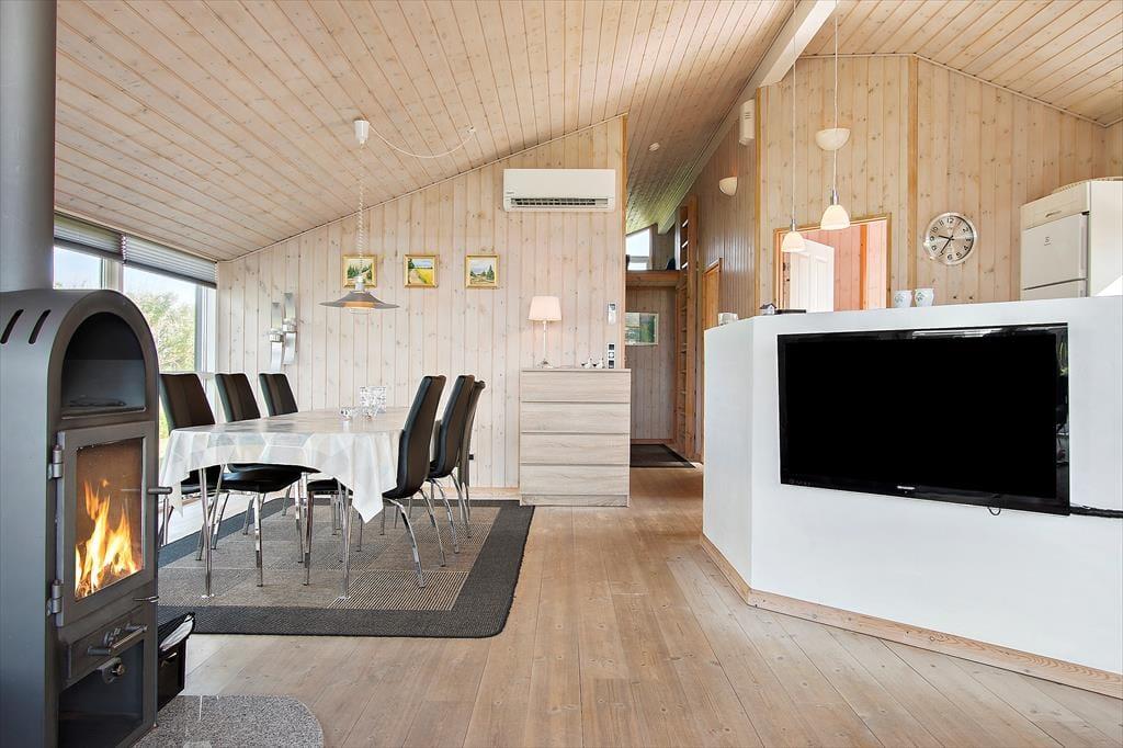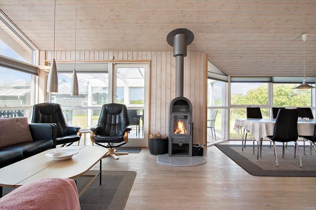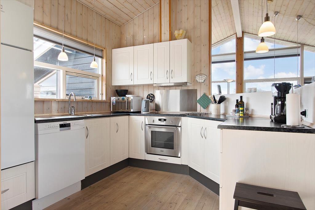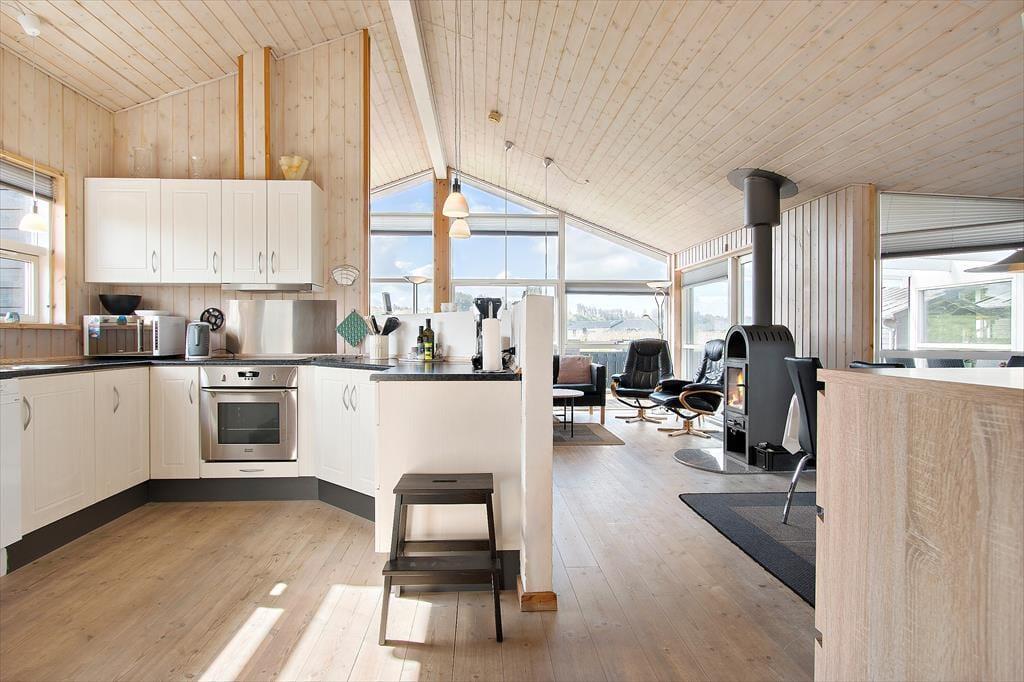 Efter sommerhusets entre kommer man ind i det store lyse og veludstyrede køkken, som ligger i forbindelse med stuen. Den er indrettet med moderne lyse møbler og en hyggelig brændeovn. Sommerhuset har 3 store dobbeltværelser alle med dobbeltsenge. Sommerhuset har udover et gæstetoilet, også et stort flot badeværelse med spabad og sauna.