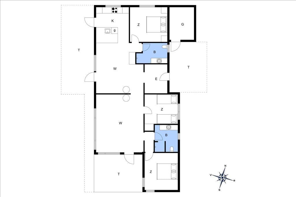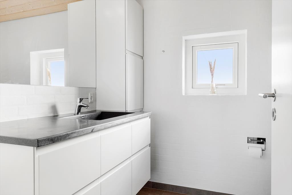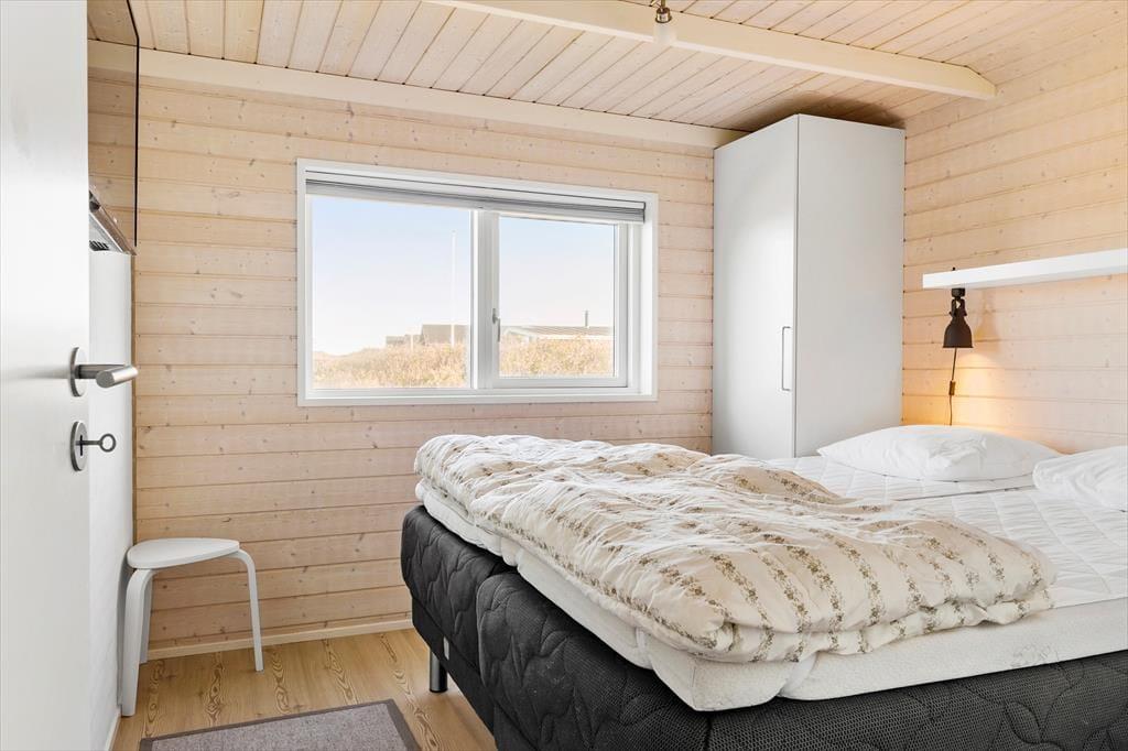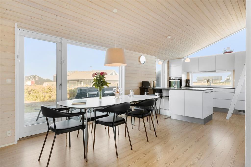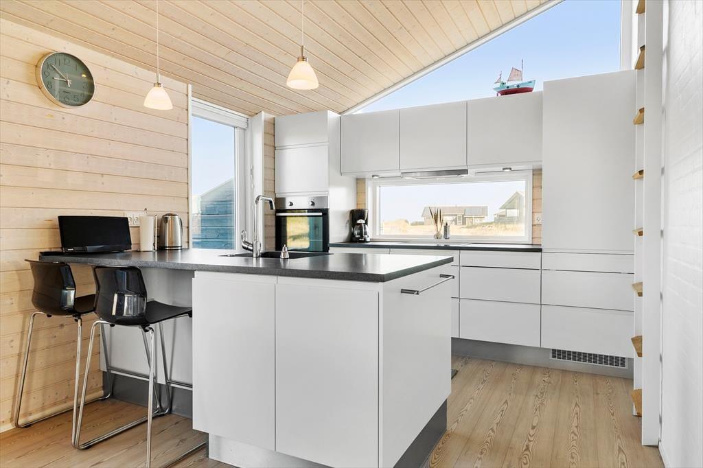 Alt står knivskarpt i dette sommerhus, der er opført i en enkel og tidløs arkitektur. Indenfor vil I blive overvældet over det imponerende lysindfald fra de store vinduespartier, der sætter det smagfulde interiør flot i scene. Indretningen er gennemtænkt og giver ferieturens hyggelige samvær de bedste betingelser. Køkken-alrum og stue ligger i åben forbindelse, og fra både køkken og stue er der flot havudsigt. Den murede, dobbeltsidede brændeovn skruer ekstra op for hyggen på de kølige aftener, og det veludstyrede køkken er udstyret med en spisedisk, hvor der kan serveres et glas vin, mens maden bobler på komfuret. Huset byder endvidere på tre gode soverum samt to badeværelser med brus.