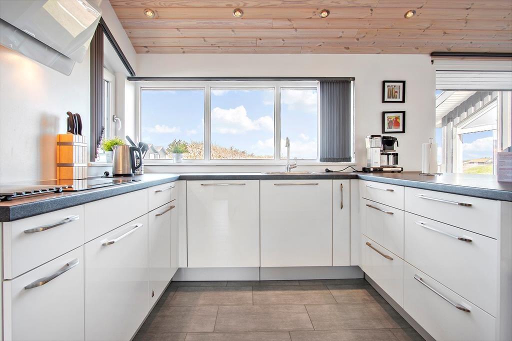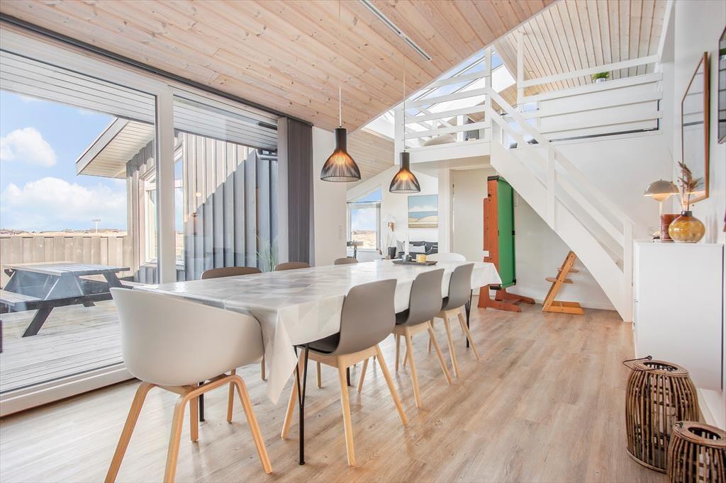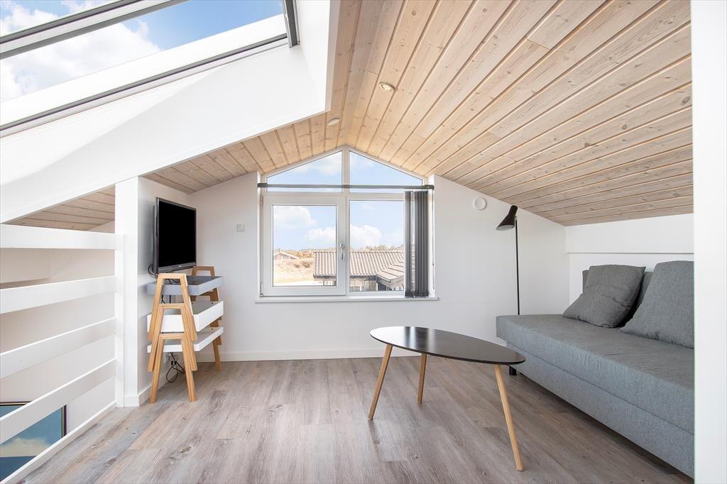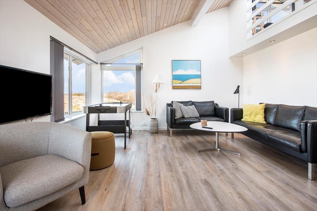 Sommerhuset er indrettet med et åbent køkken mod stuen og spisestuen, så hele familien kan være sammen om de fleste aktiviteter fra madlavning over kortspil og til afslapning i sofaen med en god film. De tre store soveværelser har alle dobbeltsenge, som kan skilles ad, hvis man ønsker det, og med to store badeværelser, hvoraf det største haret stort familiespabad (430 liter vand) samt to brusere, får man ikke probelmer med kø om morgenen. Derudover har sommerhuset en ekstra vask og vaskemaskine og tørretumbler i entreen og en skøn hems med et dejligt lys fra de store ovenvinduer, en dobbelt sovesofa og tv; det helt ideelle rum til større børn og teenagere. Sommerhuset er moderne indrettet med stilfulde møbler. Til familiens legebørn er derbåde et poolbord samt et airhockeybord i stuen, og er man til de mere stille aktiviteter, kan man tage en stille stund foran de store vinduer og nyde udsigten over det smukke landskab og Vesterhavet. Sommerhuset har en del moderne udstyr, som både gør ferien nem og afslappet, bl.a. en varmepumpe med køl, som hele tiden sikrer en behagelig temperatur, køkkenet har to ovne, der er i alt fire fjernsyn, og over hele huset kan man bruge det trådløse internet, hvis man husker pc eller tablet hjemmefra. Alt i alt byder dette skønne og moderne sommerhus på de bedste rammer for en dejlig ferie i Nordjylland.